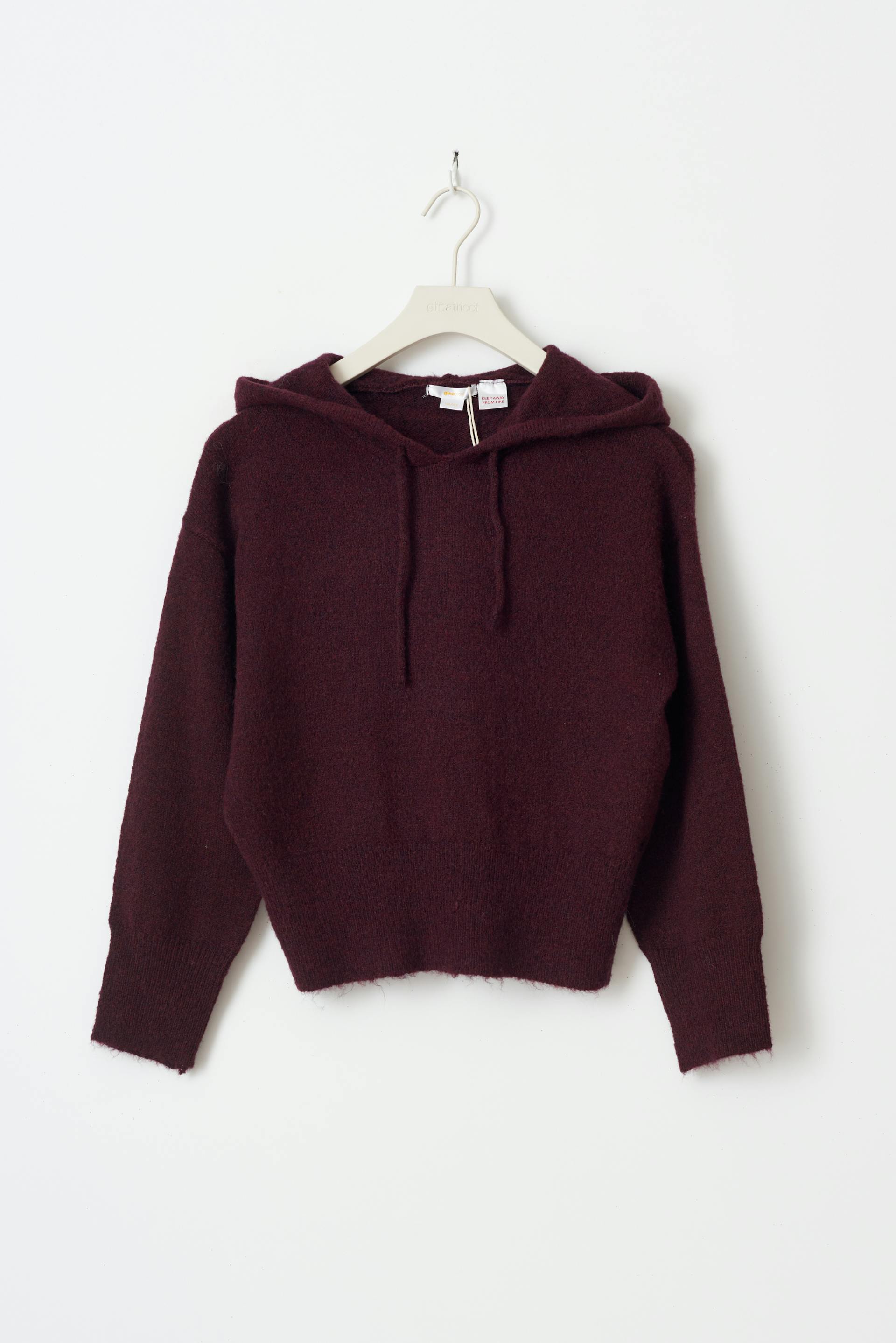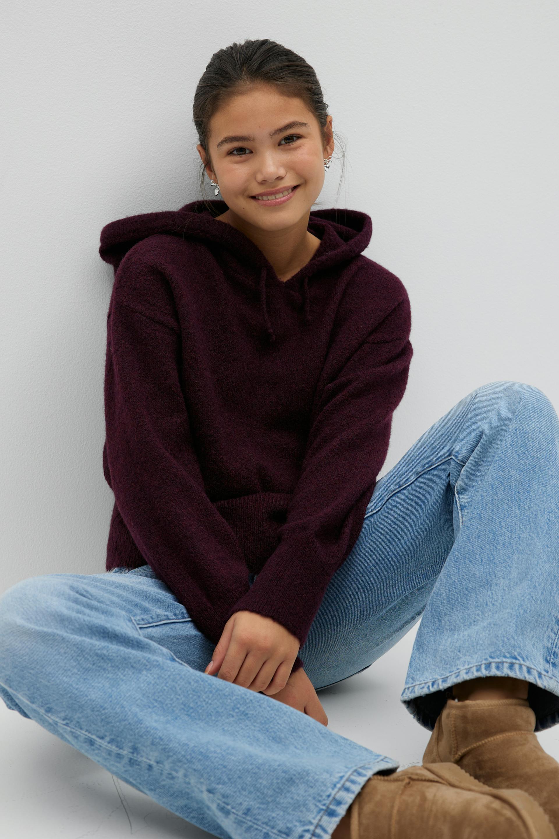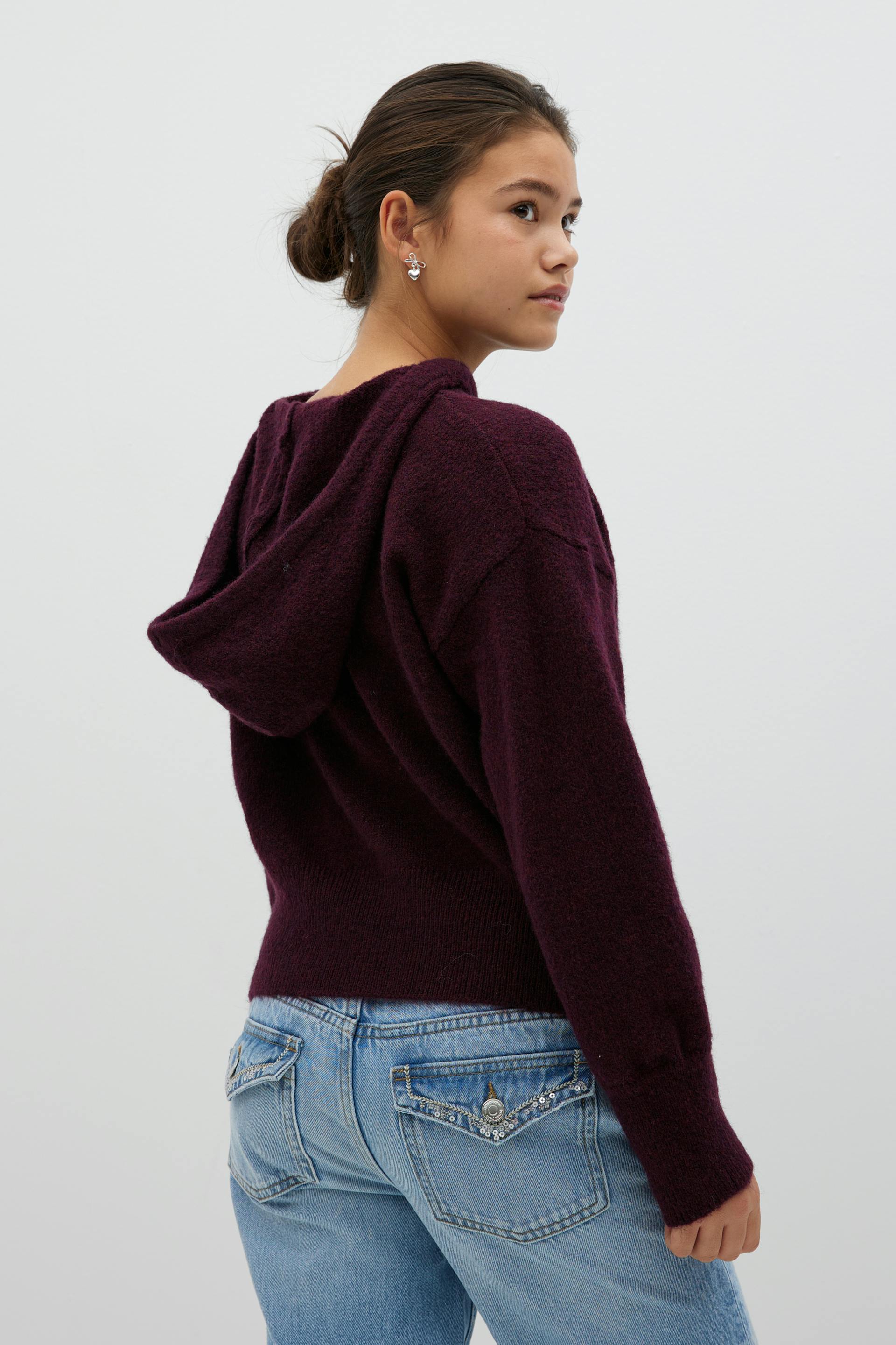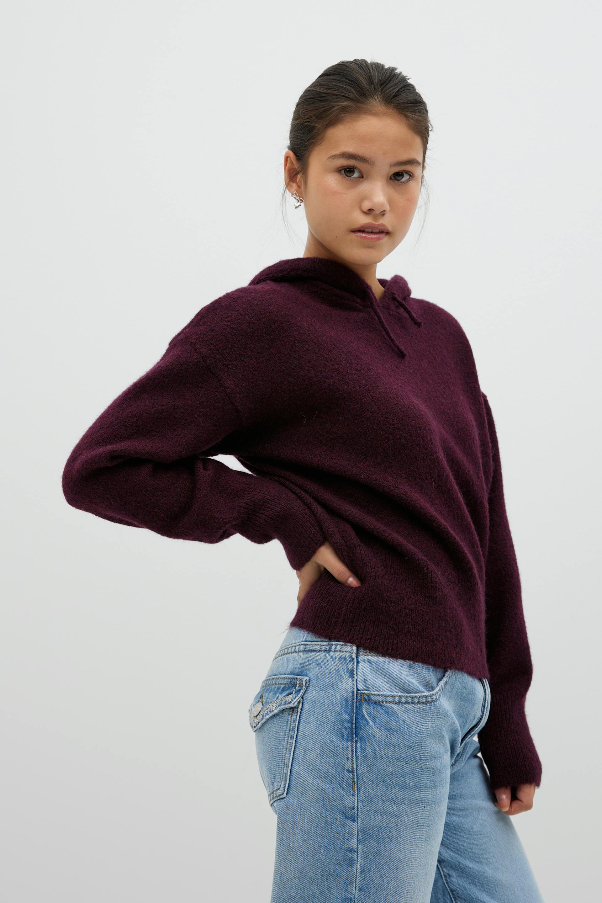 Knitted hoodie with wool feel. The hoodie is wine and has oversize fit. It has round neckline, dropped shoulder and hood with drawstrings.