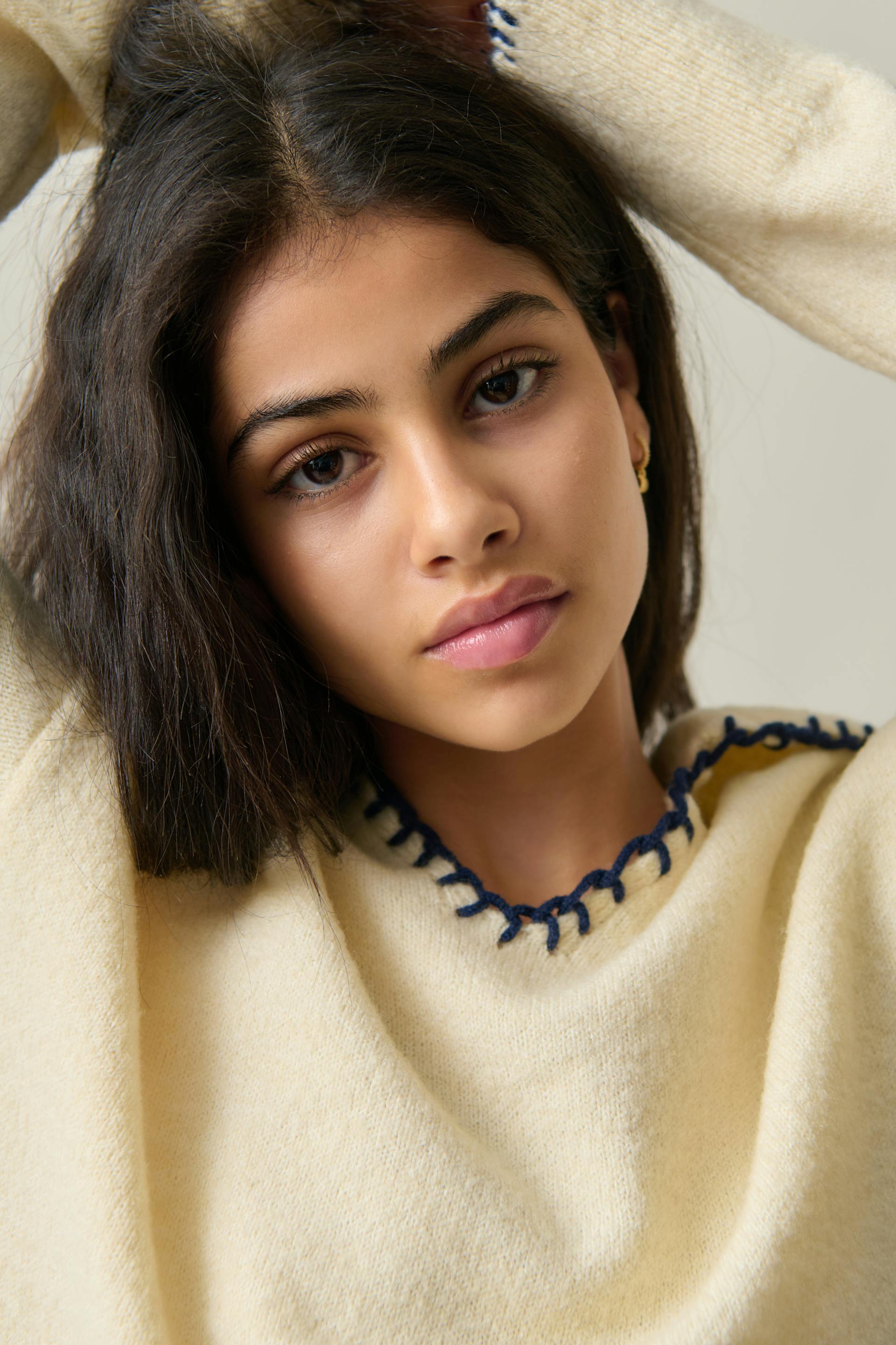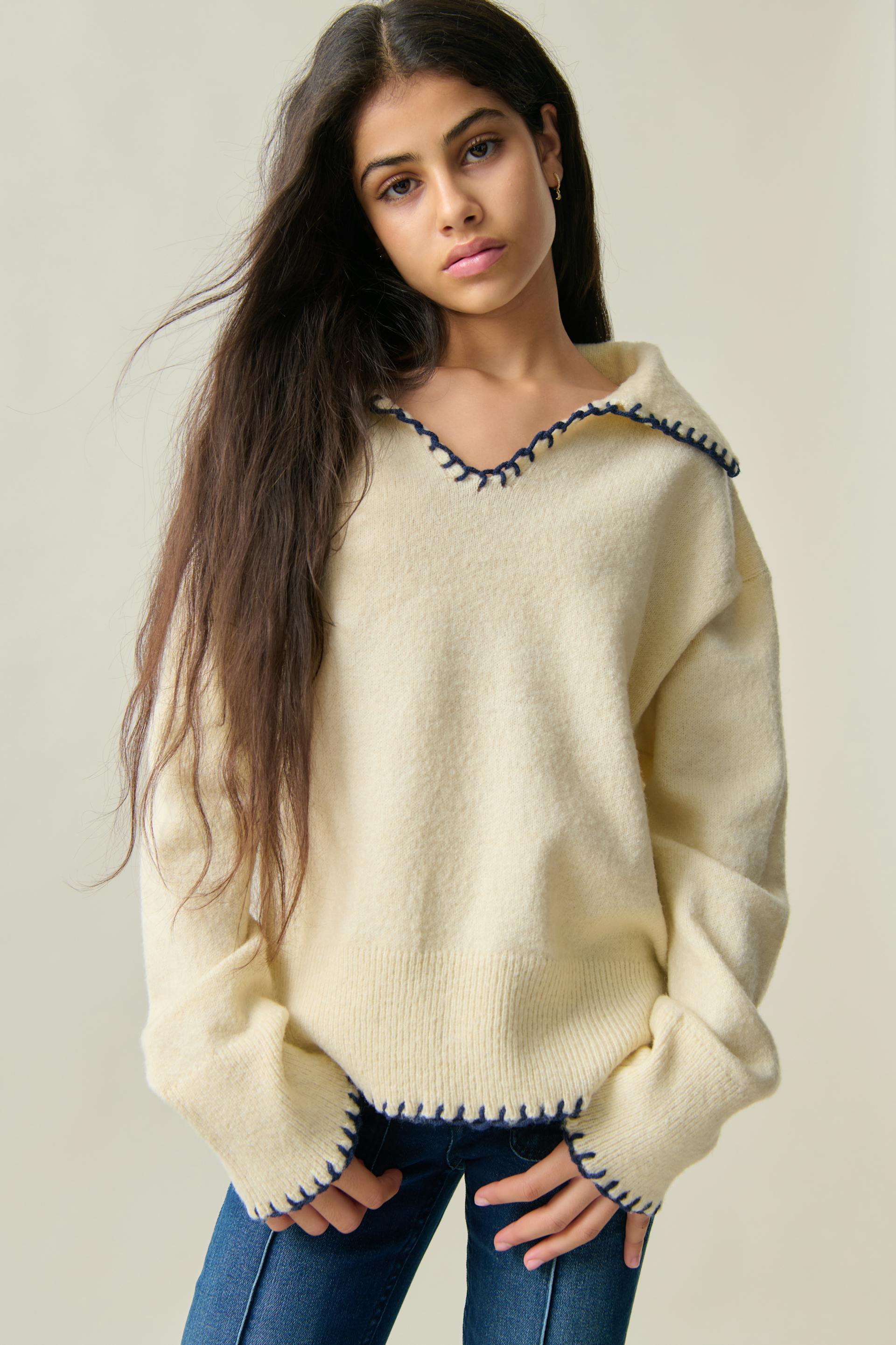 Knitted sweater with collar. The sweat is beige and has decorative stitchings. It has oversize fit, long sleeve and ribbing at sleeve ends and at the bottom.