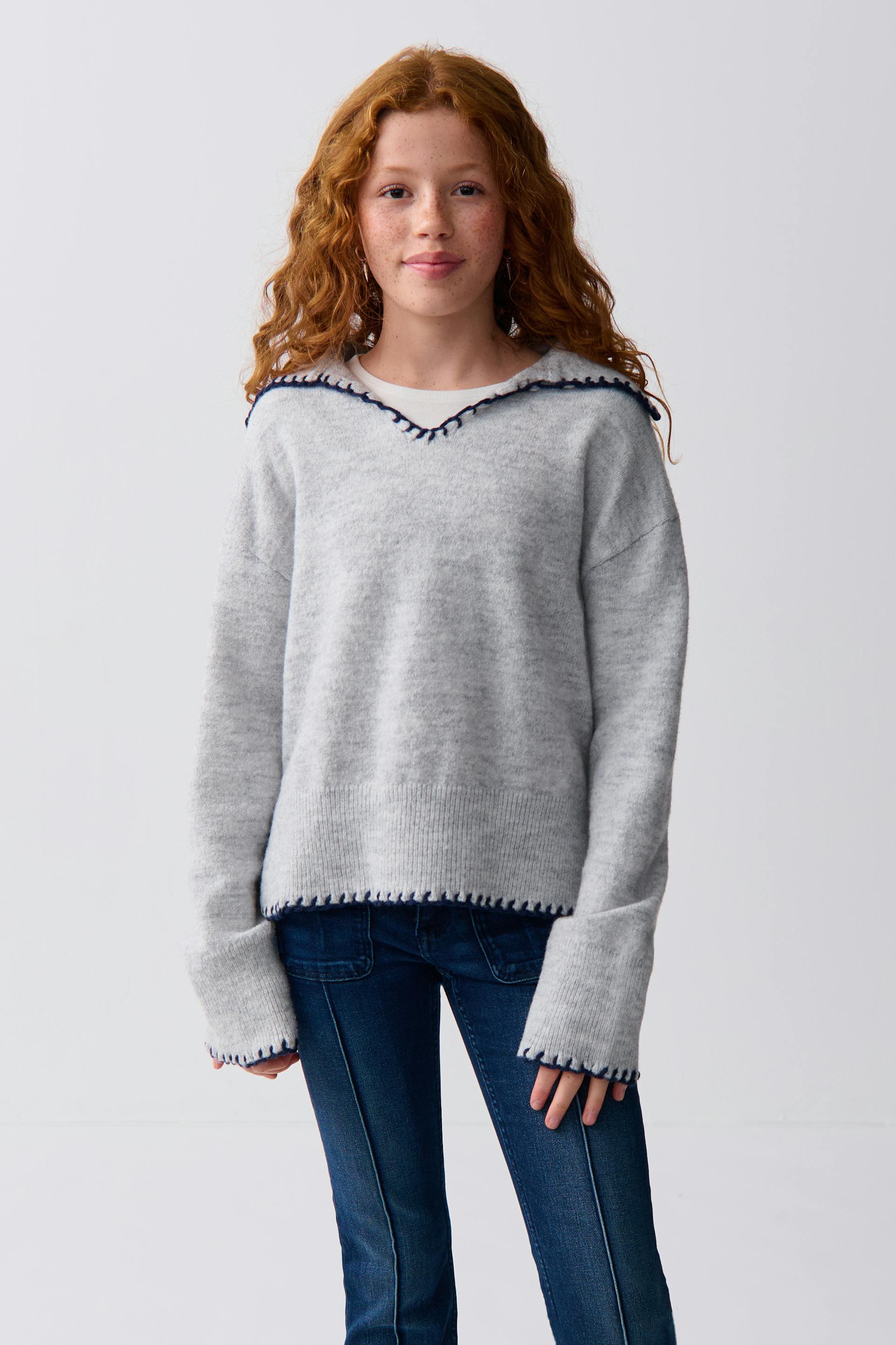 Knitted sweater with collar. The sweat is grey and has decorative stitchings. It has oversize fit, long sleeve and ribbing at sleeve ends and at the bottom.