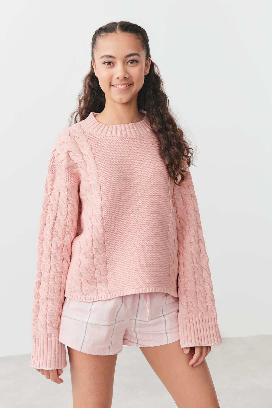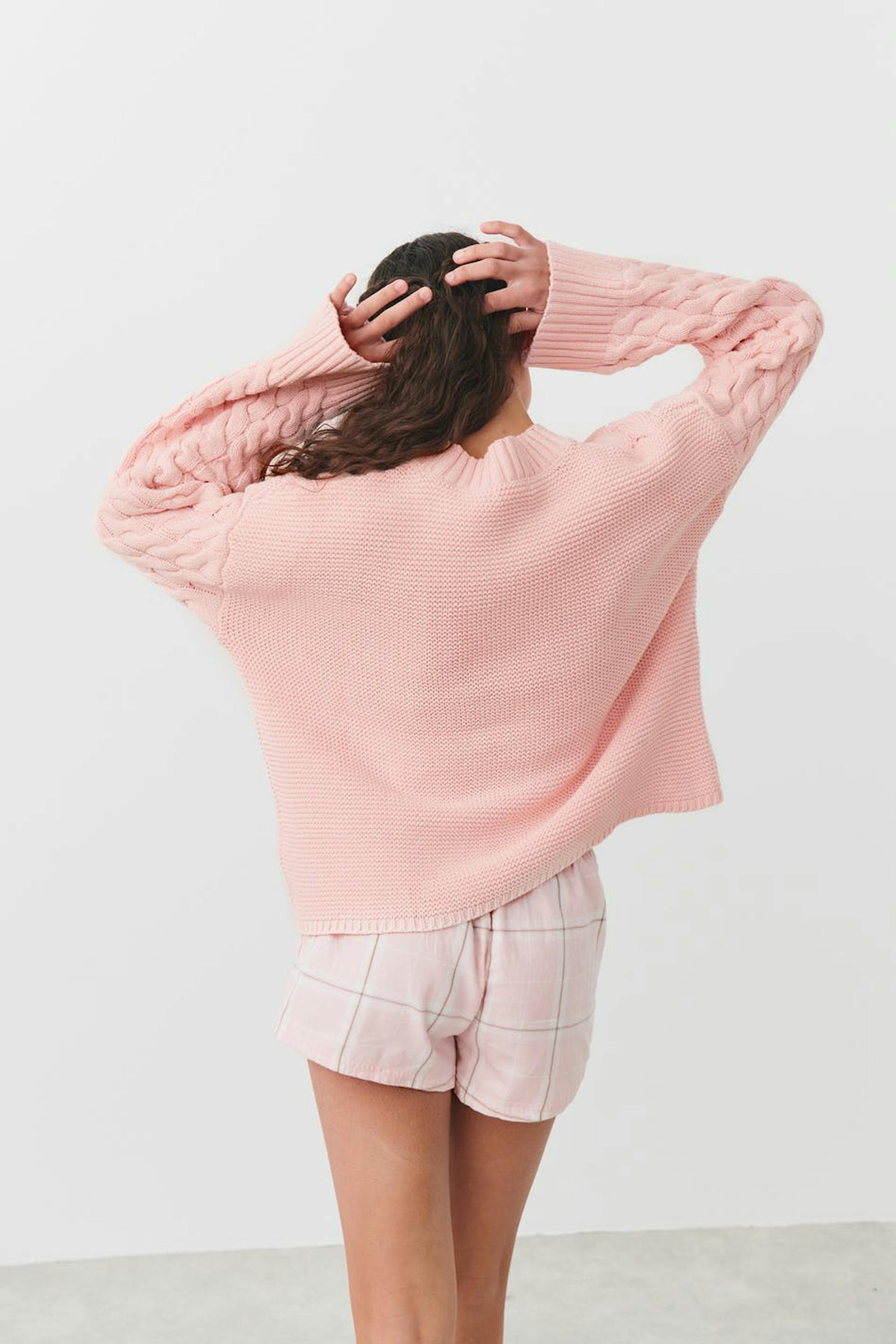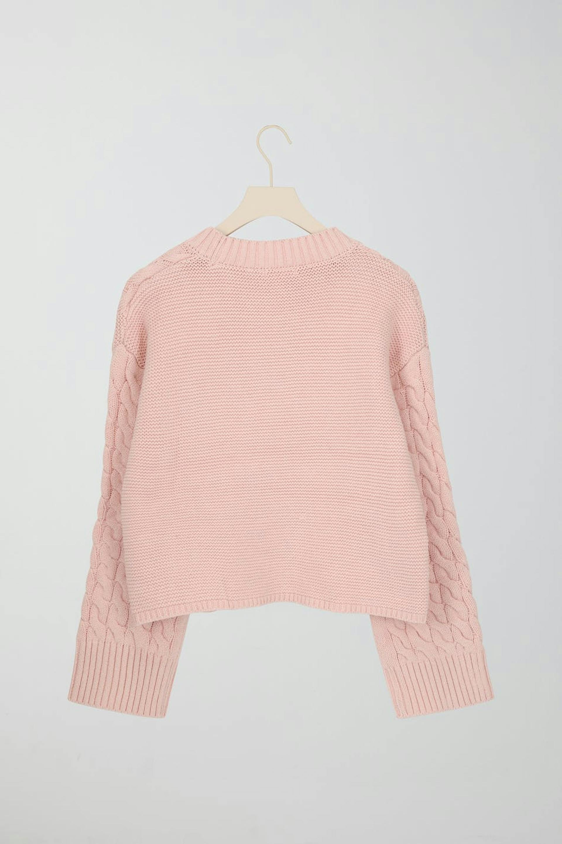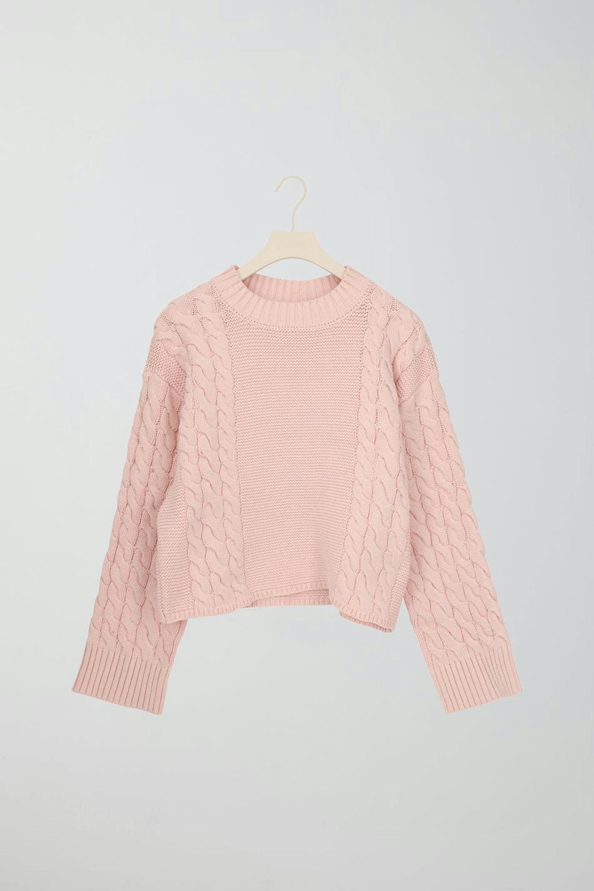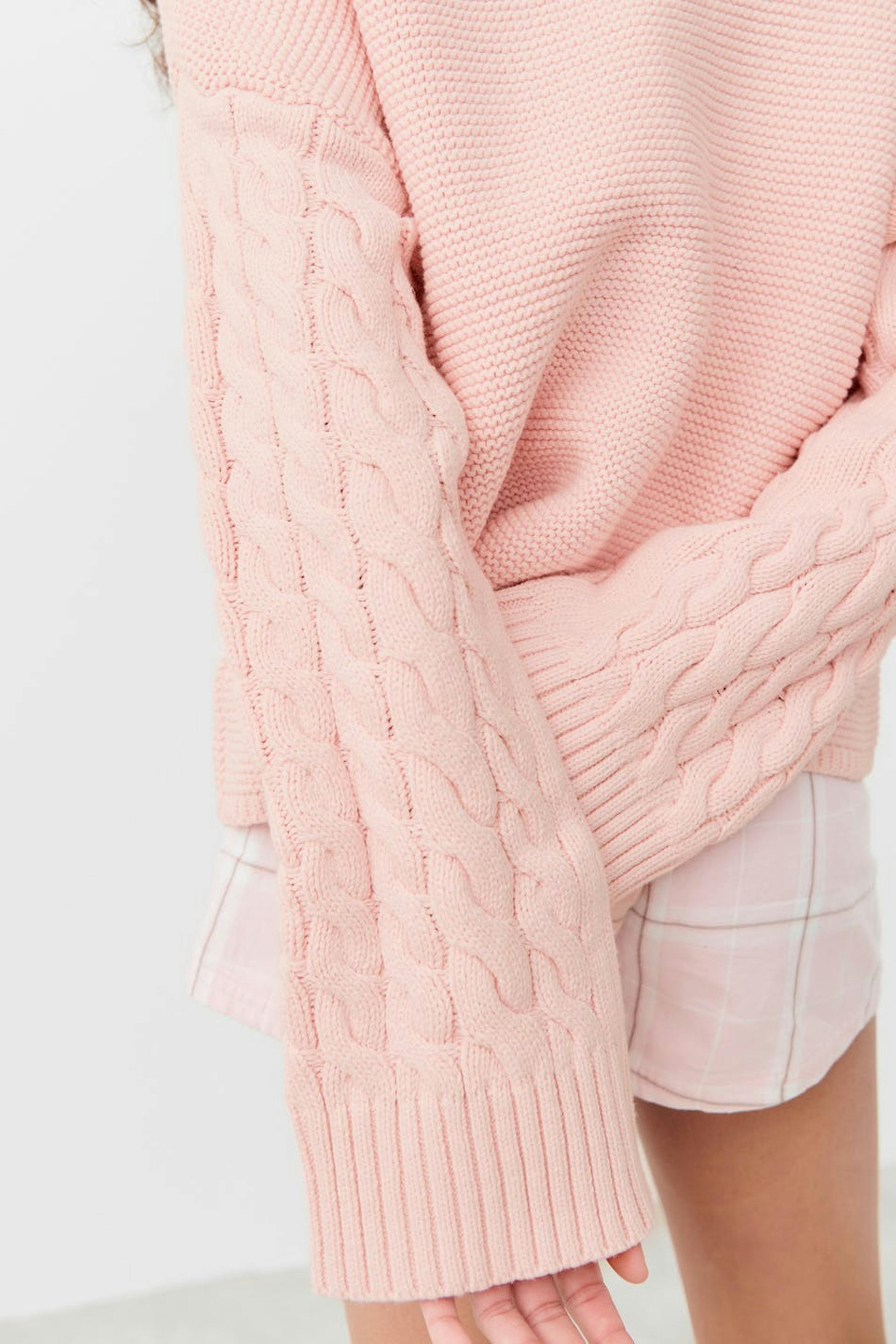 Cable-knit jumper by Gina Tricot Young with loose-fitting style. The jumper is pink and has large sleeves. It has rounded neckline and purl-knit front and back.