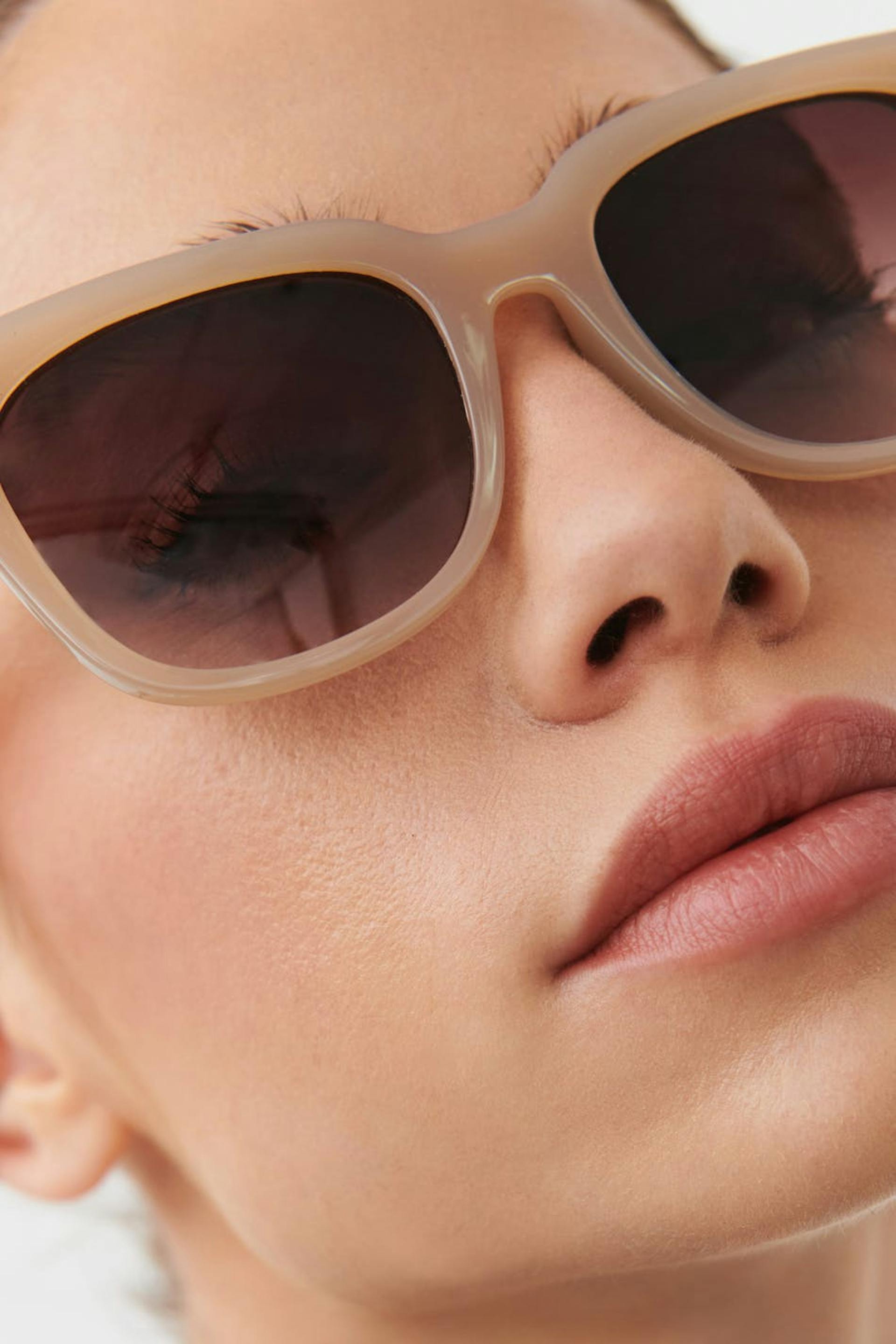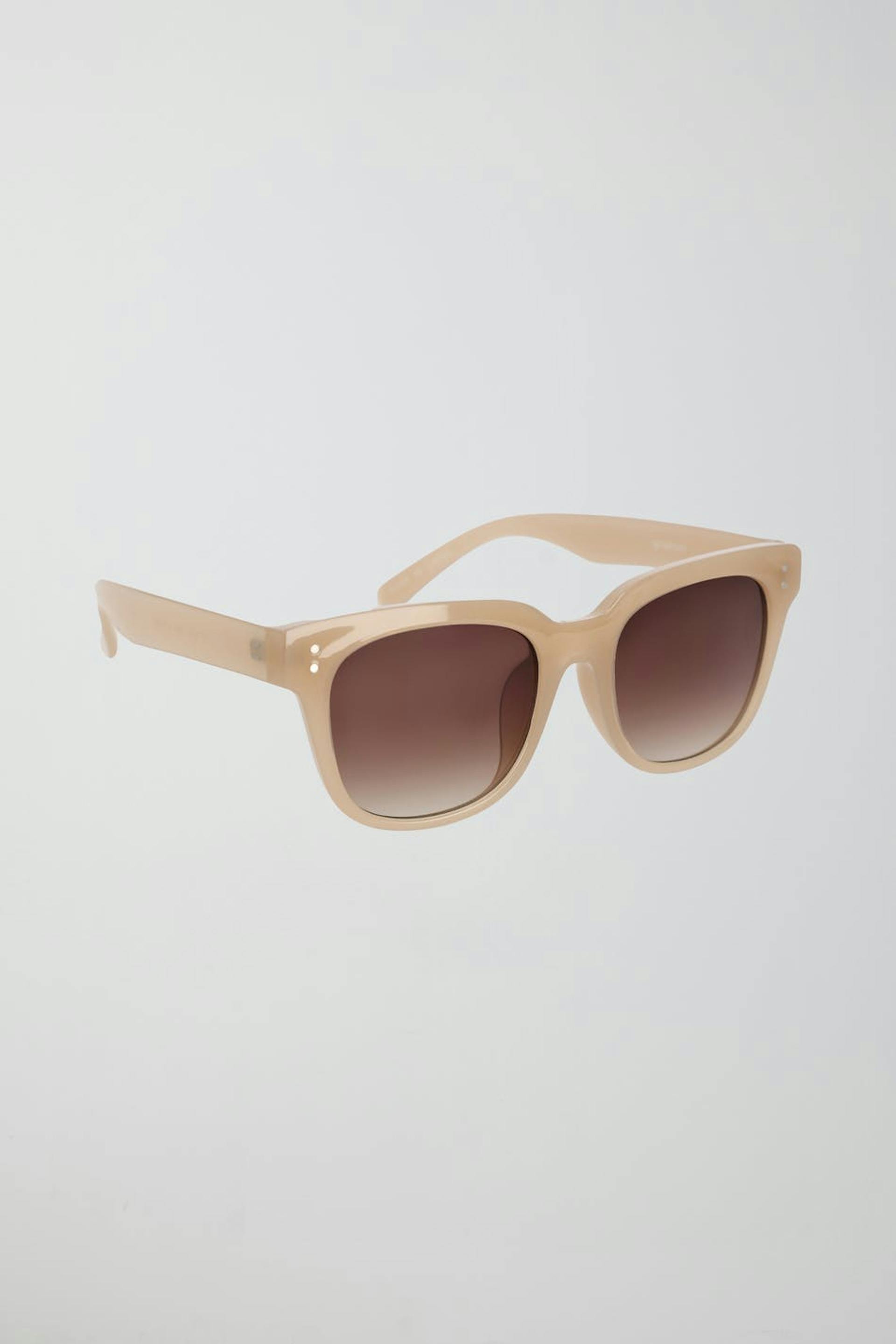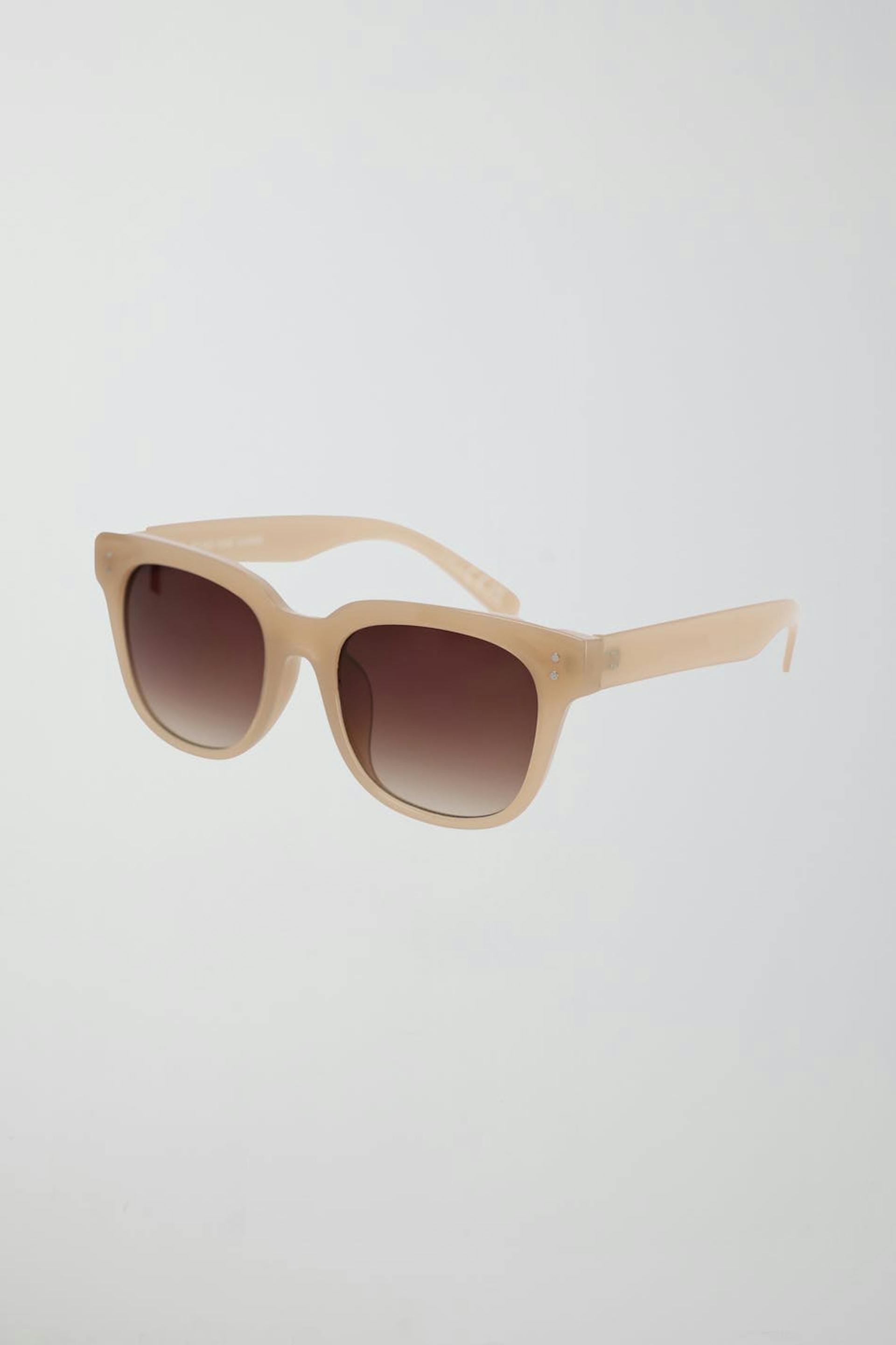Aurinkolasit muovikehyksillä kierrätetystä muovista. Aurinkolasit on beige ja siinä on sävytetyt juomalasit UV400-suojalla.