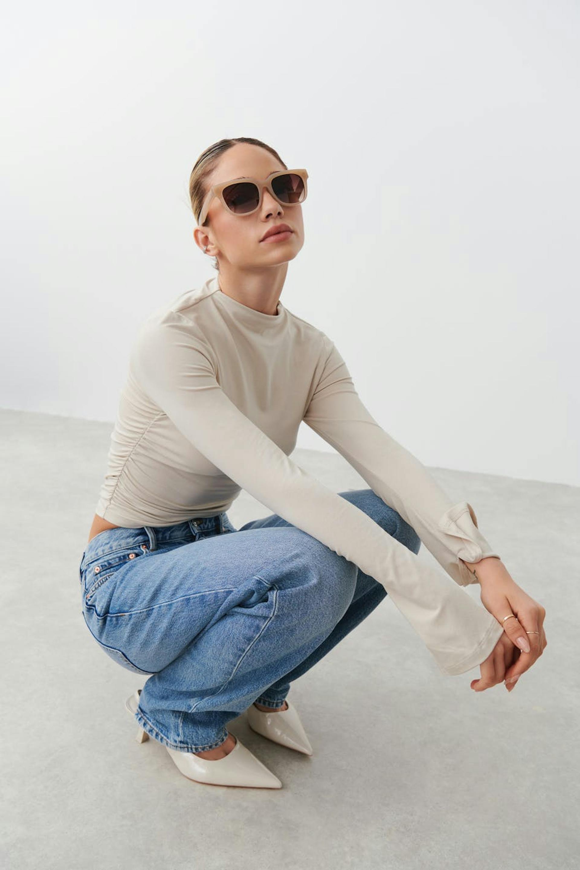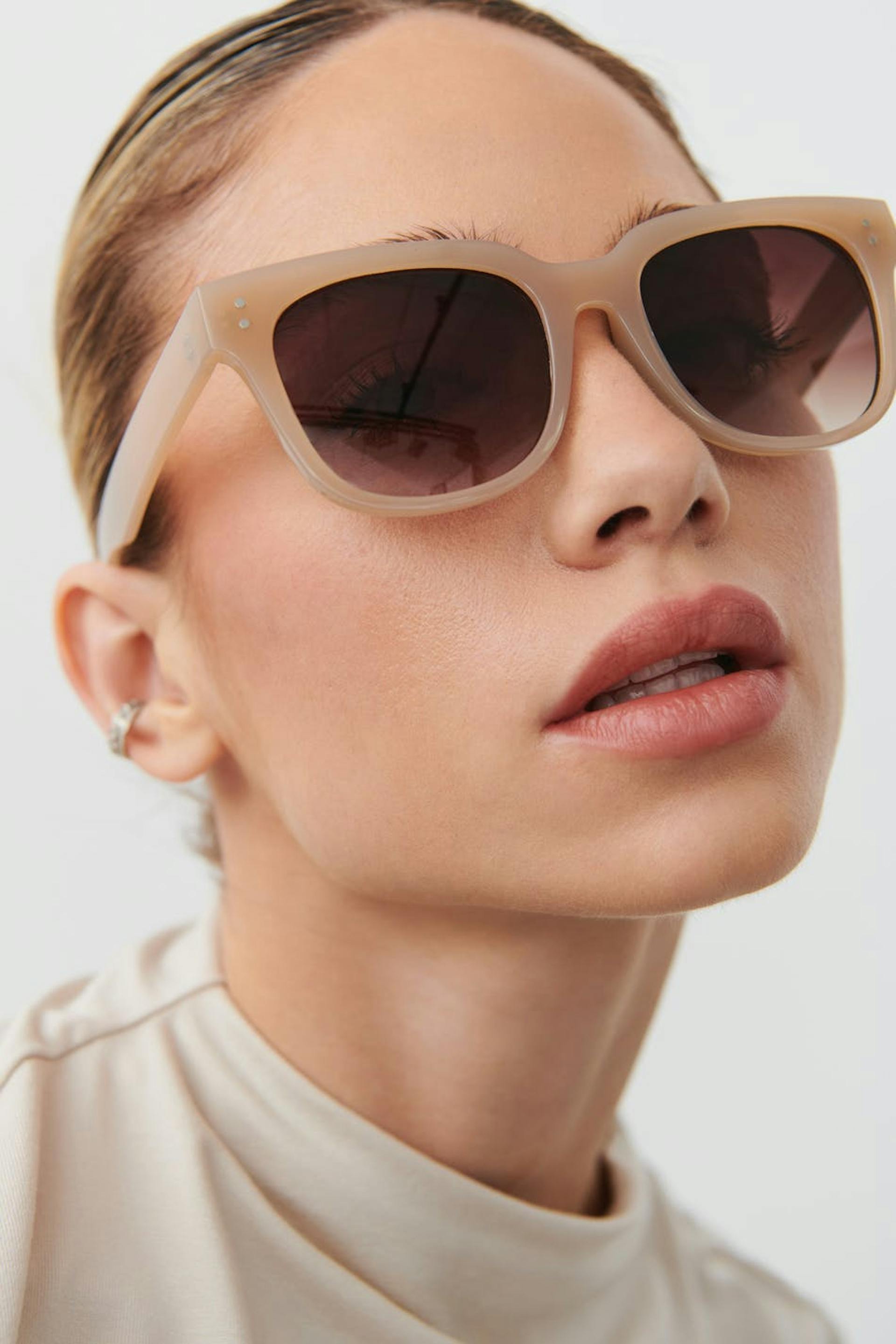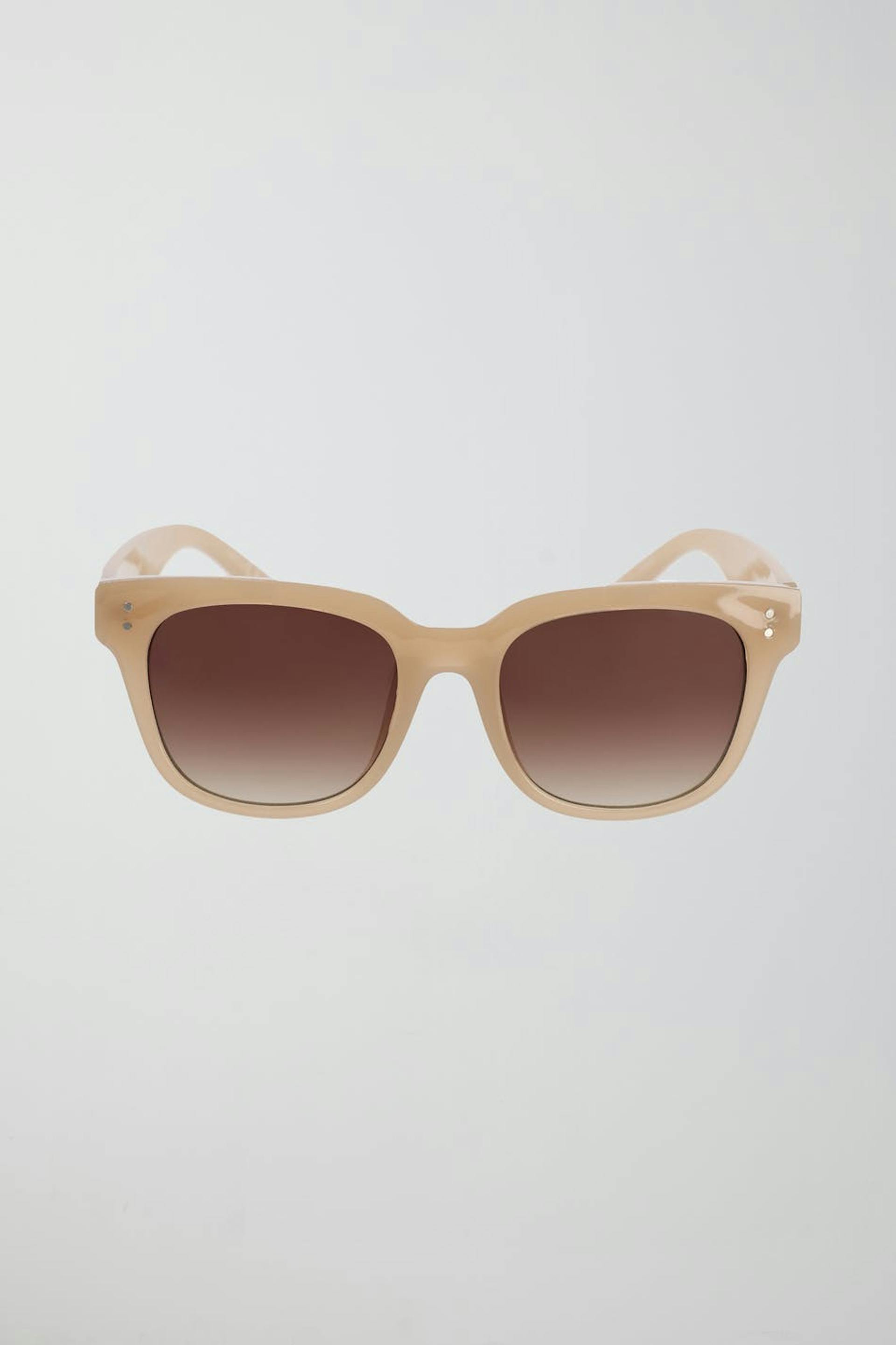 Aurinkolasit muovikehyksillä kierrätetystä muovista. Aurinkolasit on beige ja siinä on sävytetyt juomalasit UV400-suojalla.