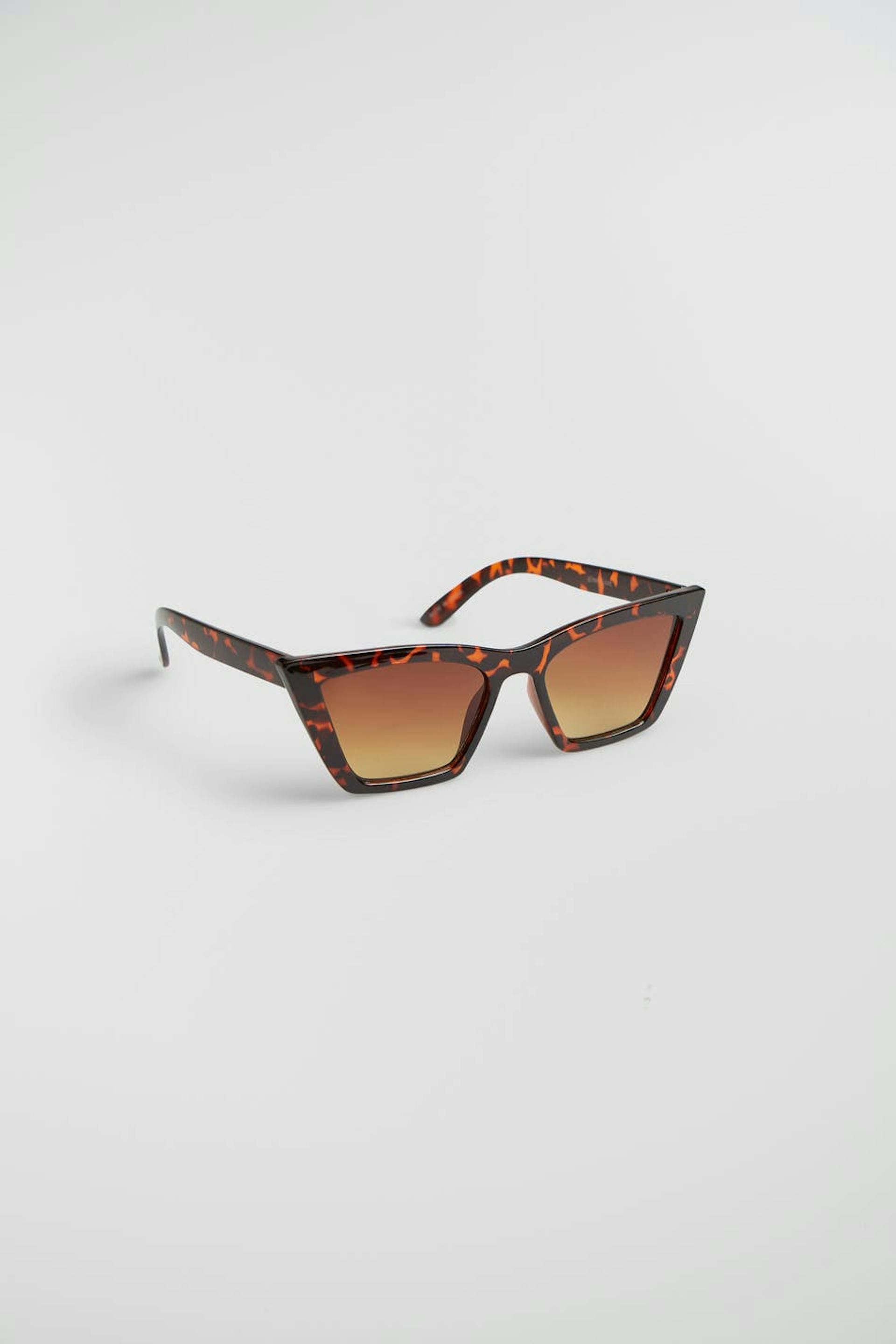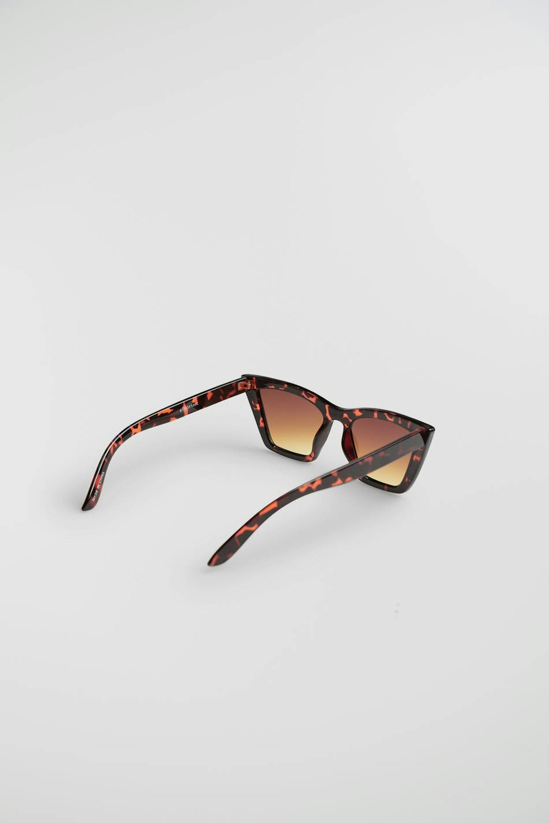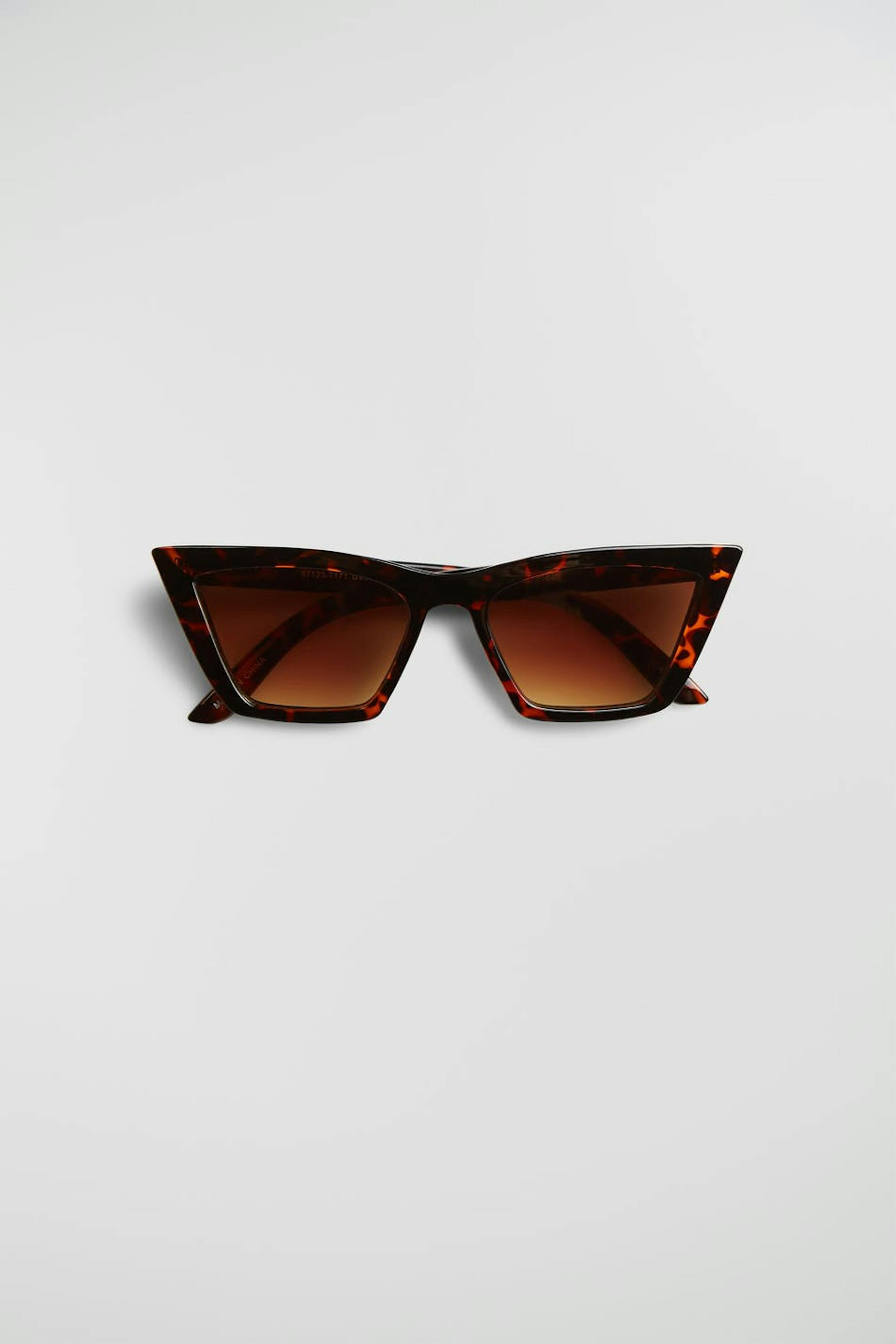 Aurinkolasitit muovikehyksillä. Aurinkolasitit ovat ruskeita ja niissä on futuristinen kissansilmä-malli.
