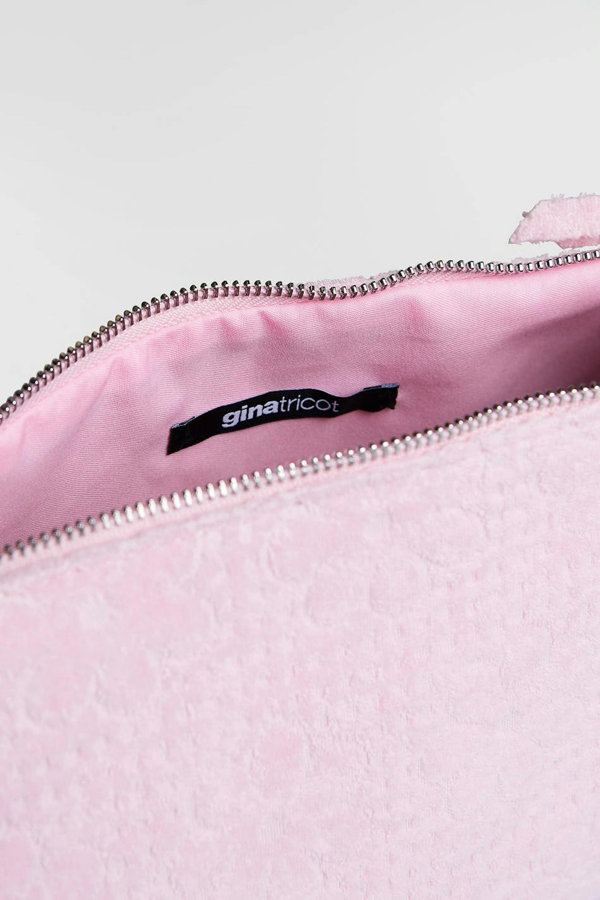 Kukkakuvioinen toilettilaukku vetoketjulla ylhäällä. Toilettilaukku on vaaleanpunainen ja pehmeä. Se valmistetaan froteesta.