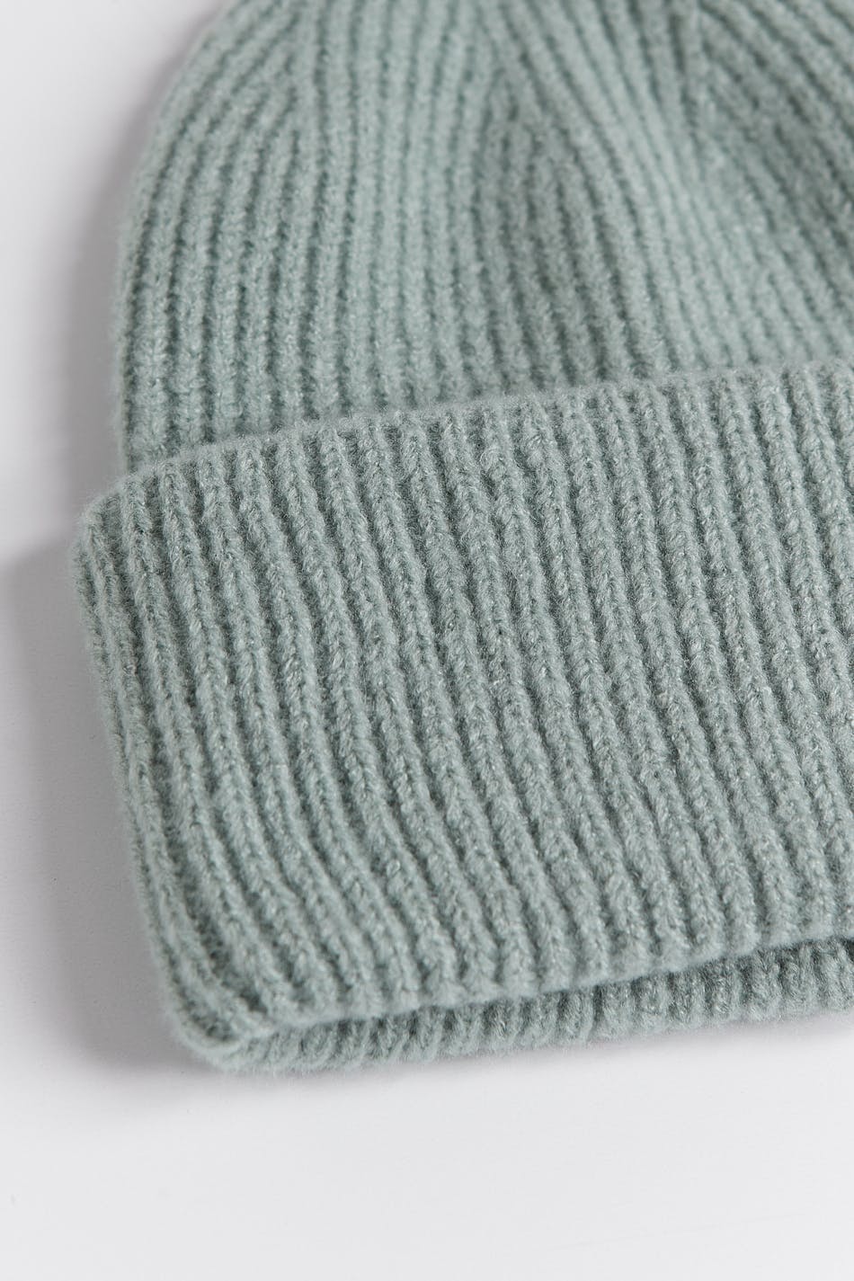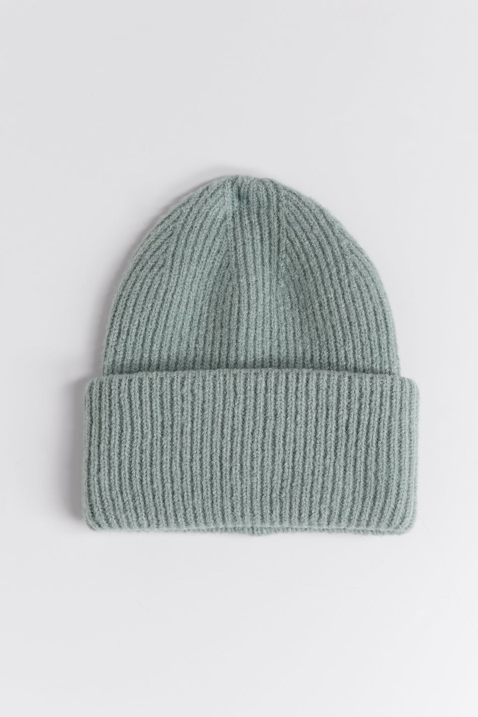 Neulottu pipo chunky-istuvuudella. Pipo on vihreä ja siinä on taitettava helma.