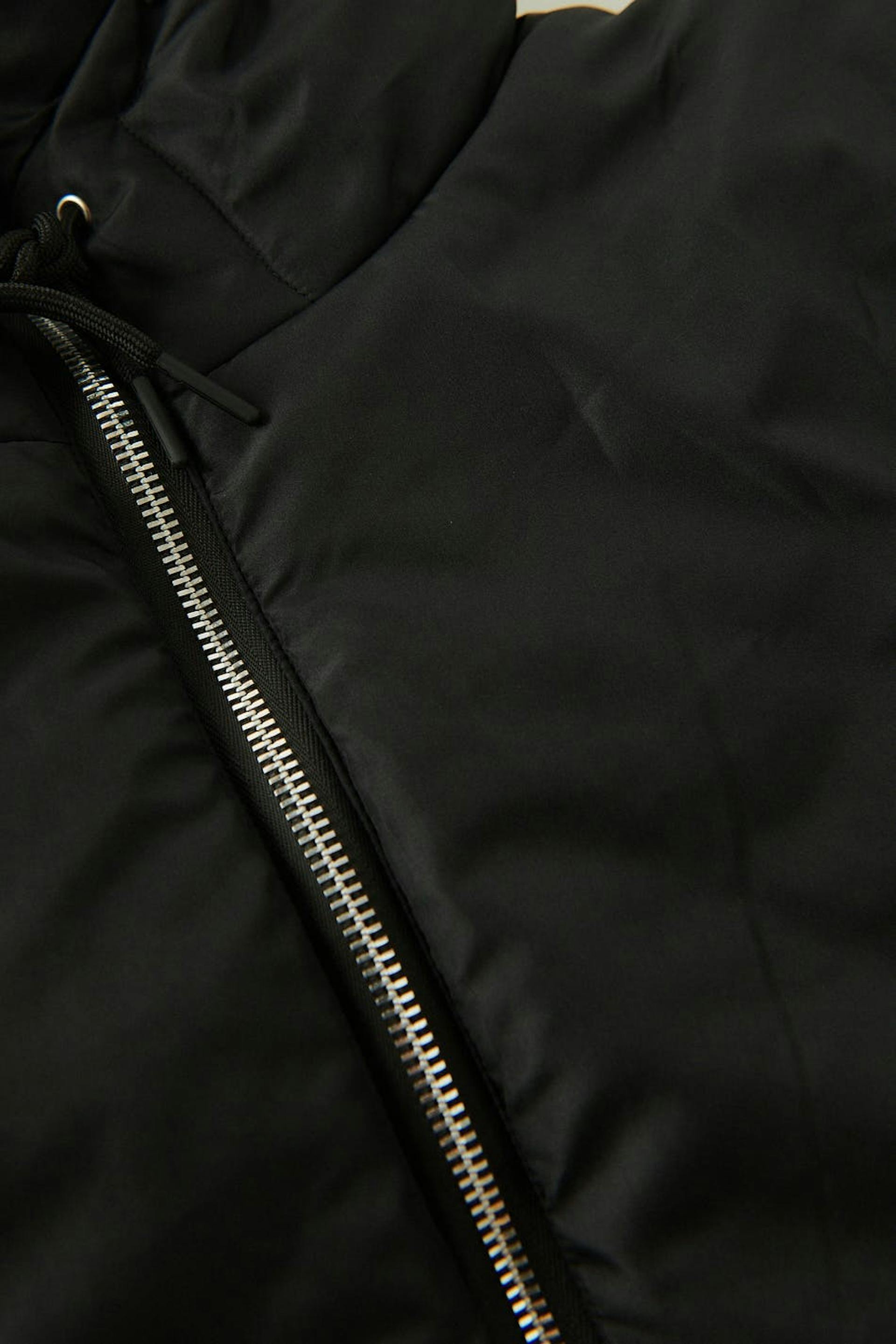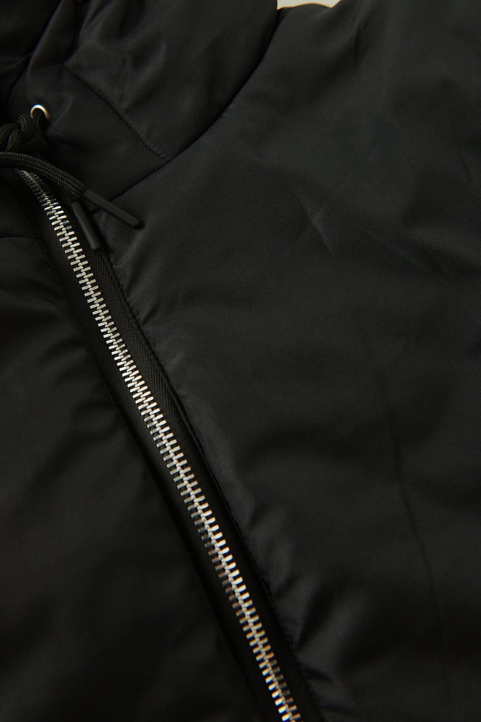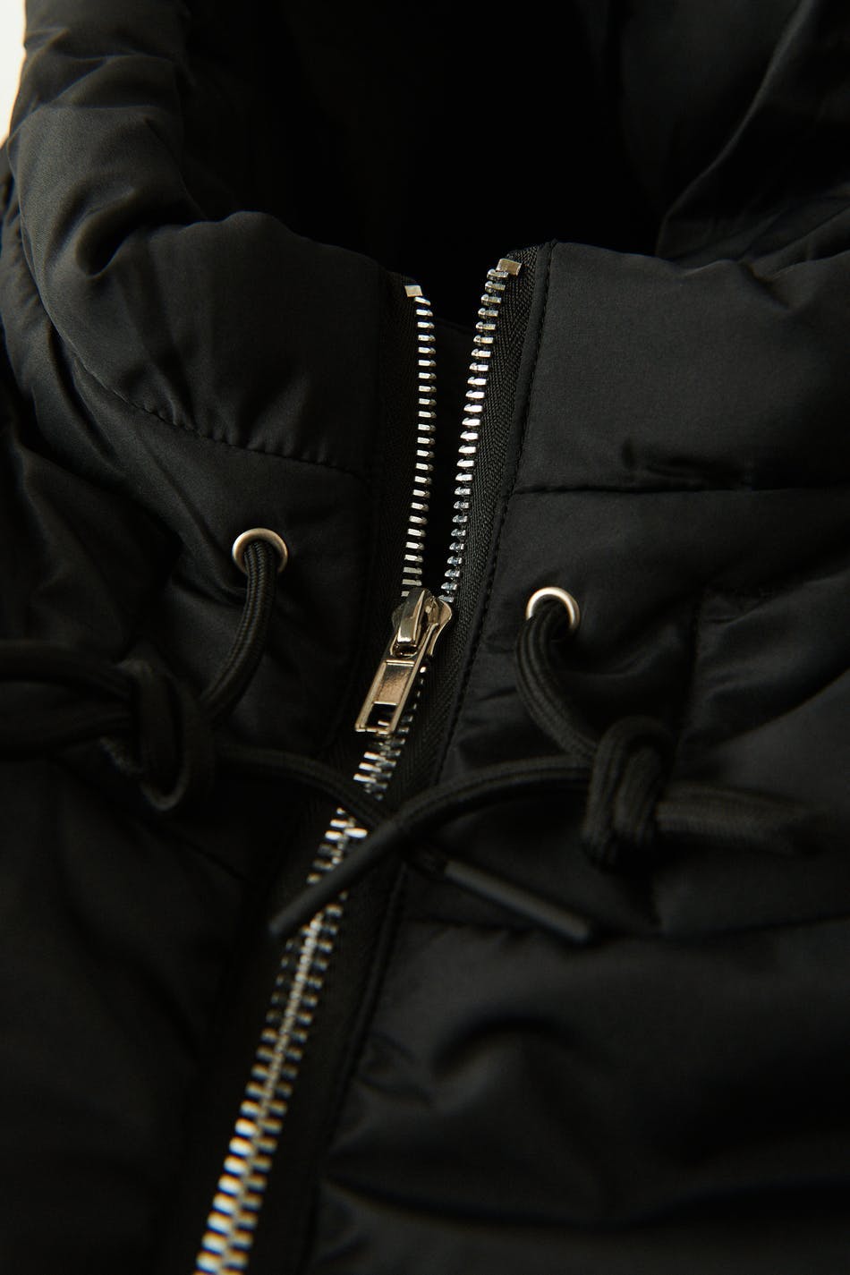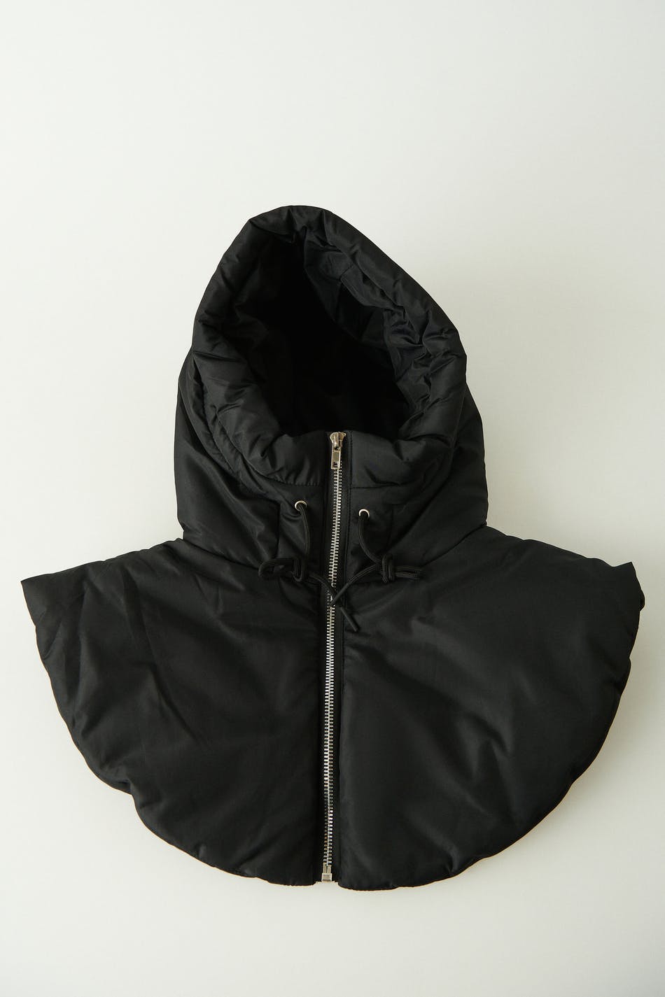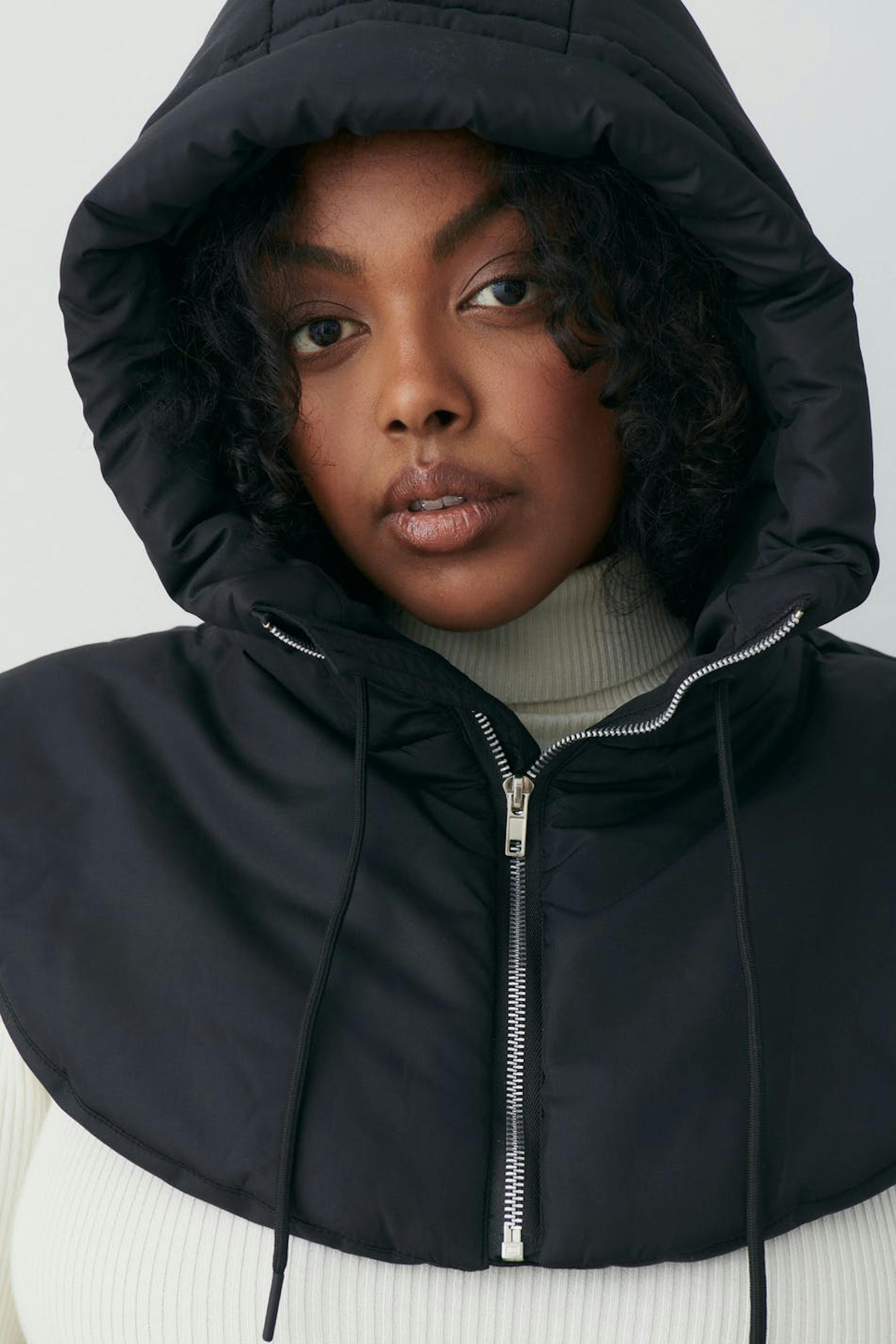 Topattu kaulus vetoketjulla edessä. Kaulus on musta ja siinä on joustonyörit sivuilla.