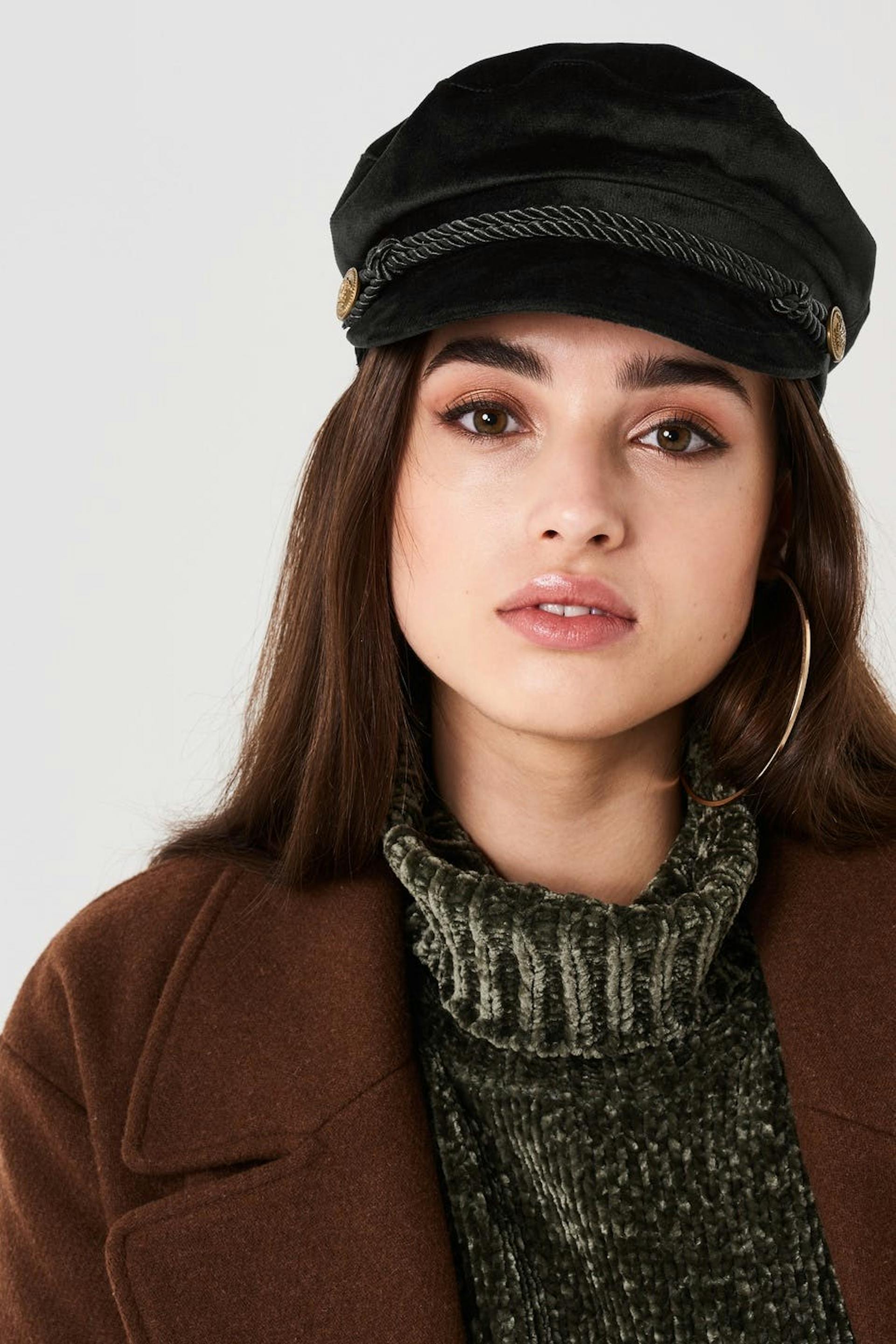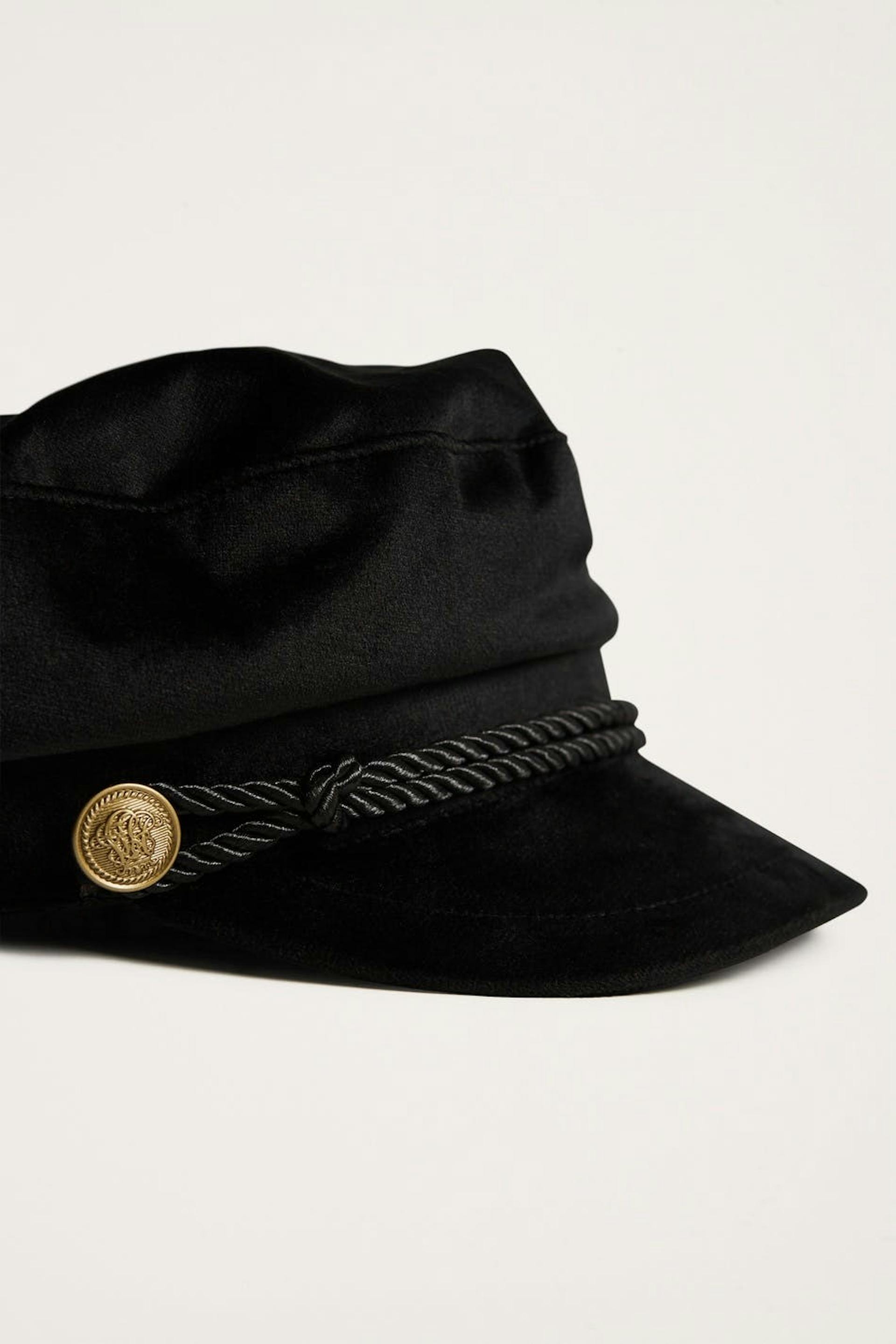 Pipo edessä olevalla hihnalla kahdella napilla kullasta. Hattu on musta ja siinä on lippis-malli.