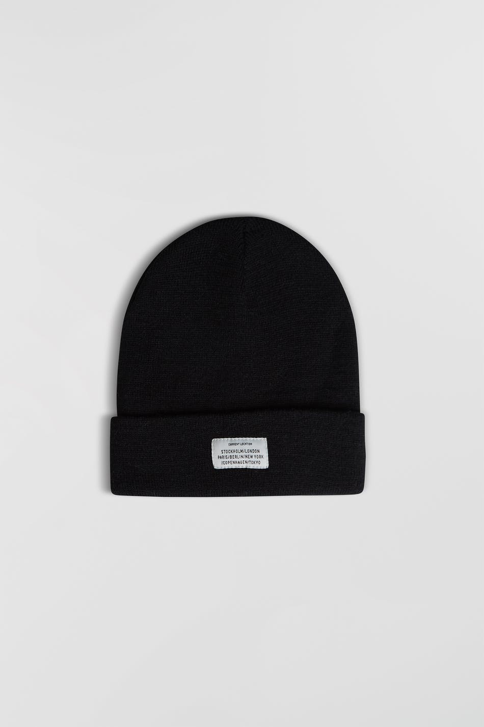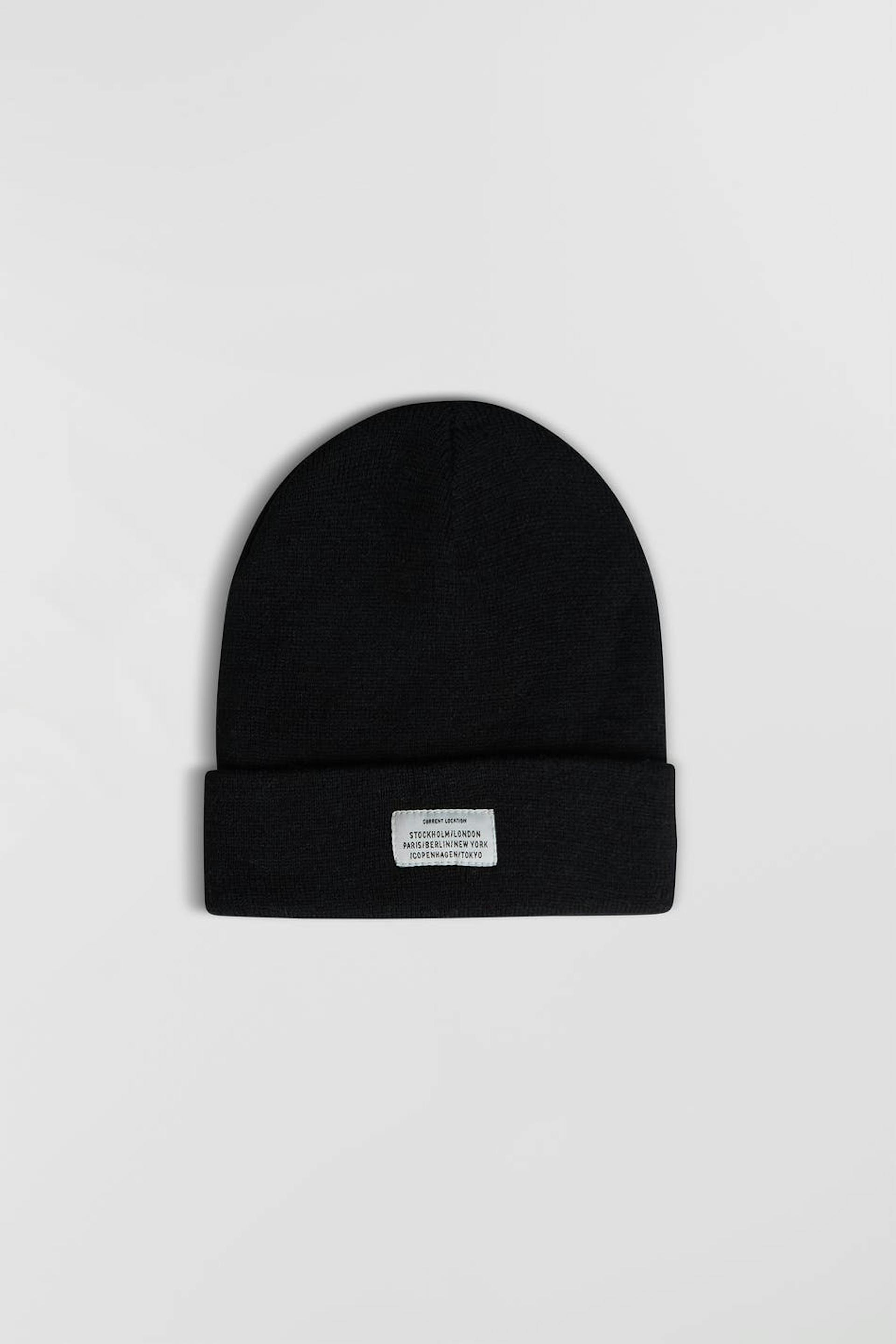 Pipo kirjaillulla tekstillä. Pipo on musta ja siinä on taitettu reuna.