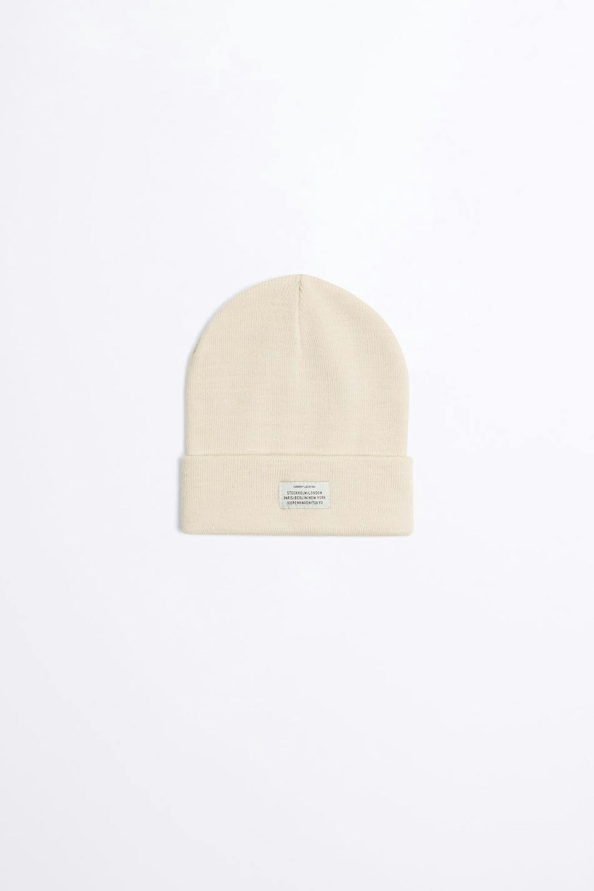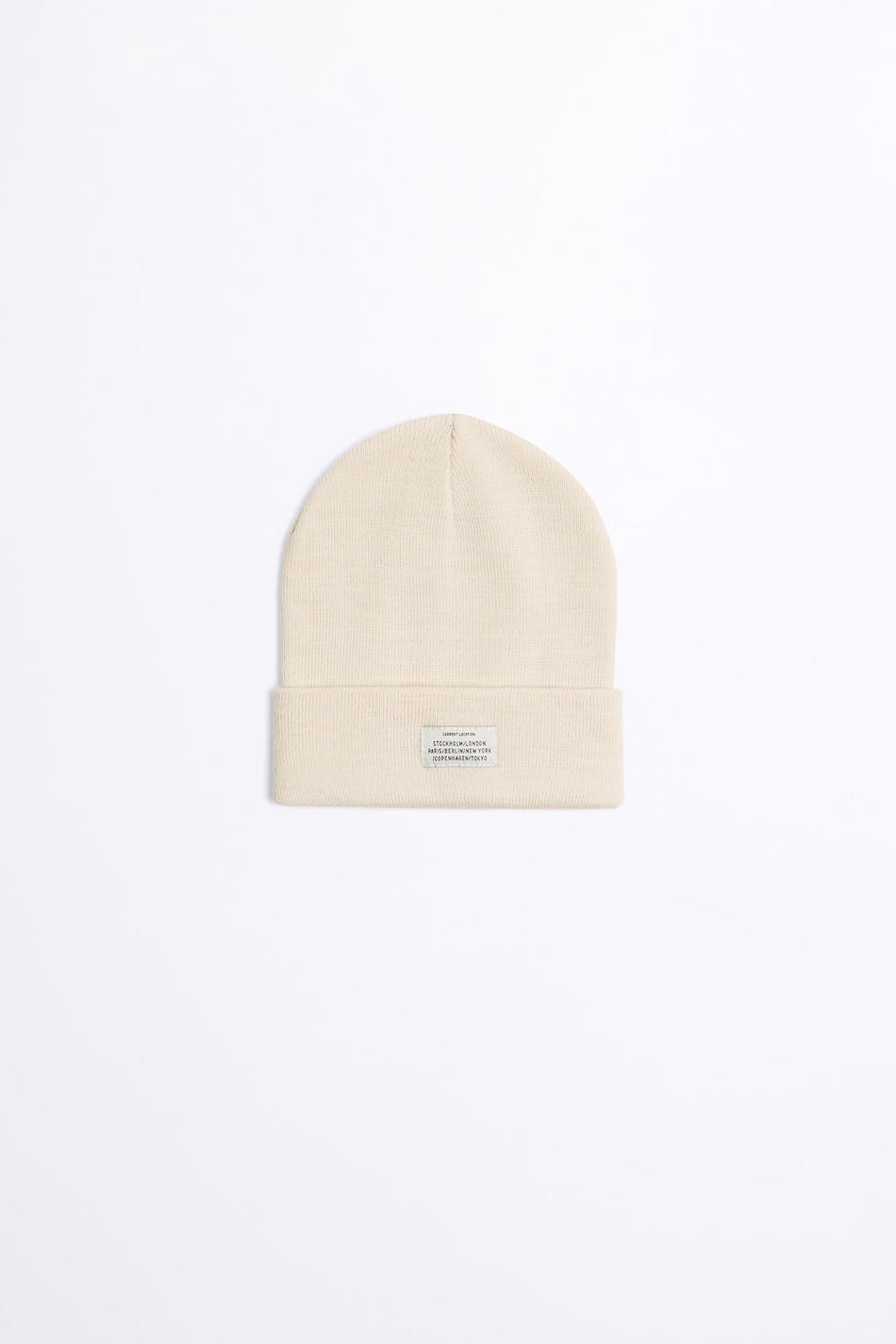 Pipo kirjaillulla tekstillä. Pipo on beige.