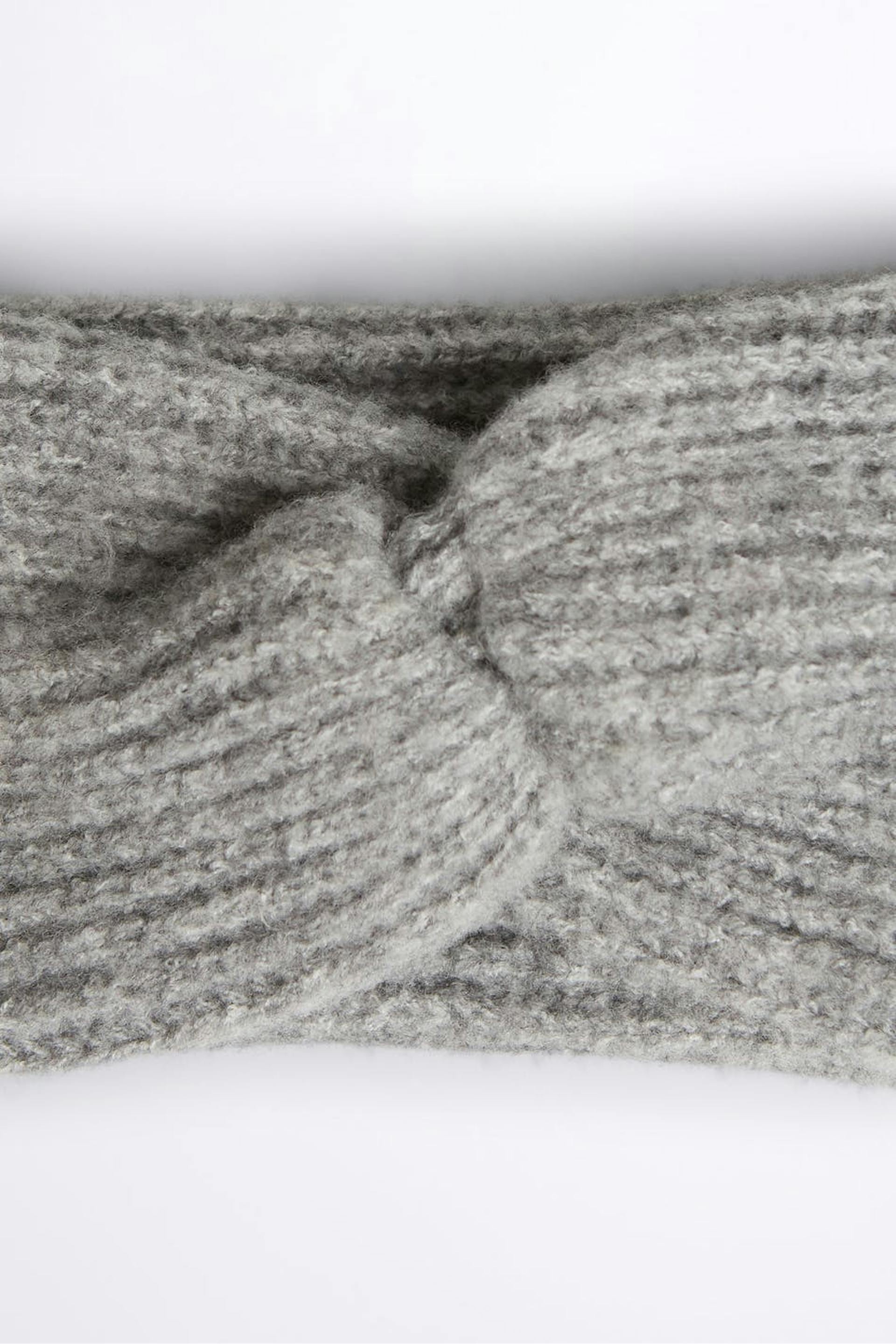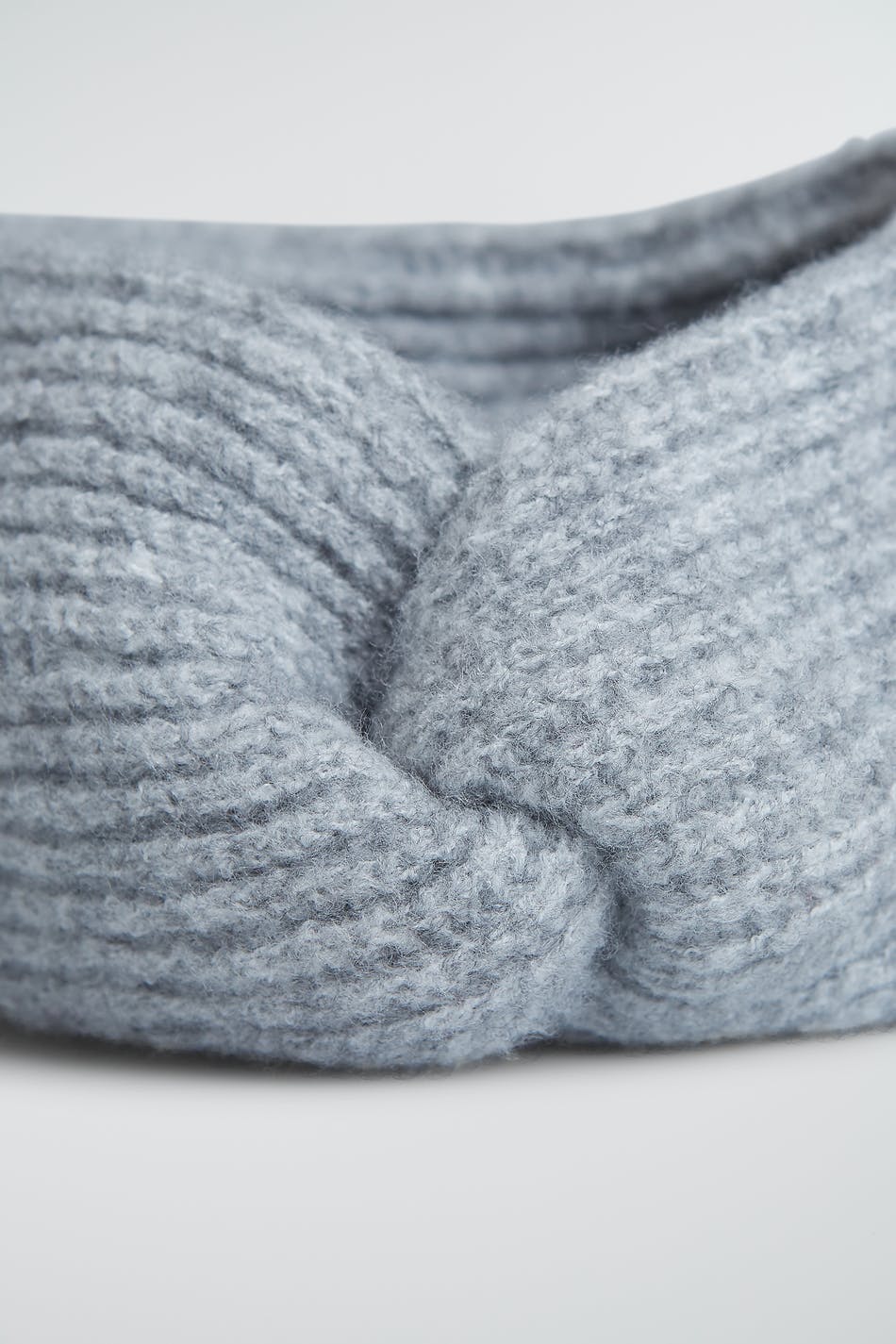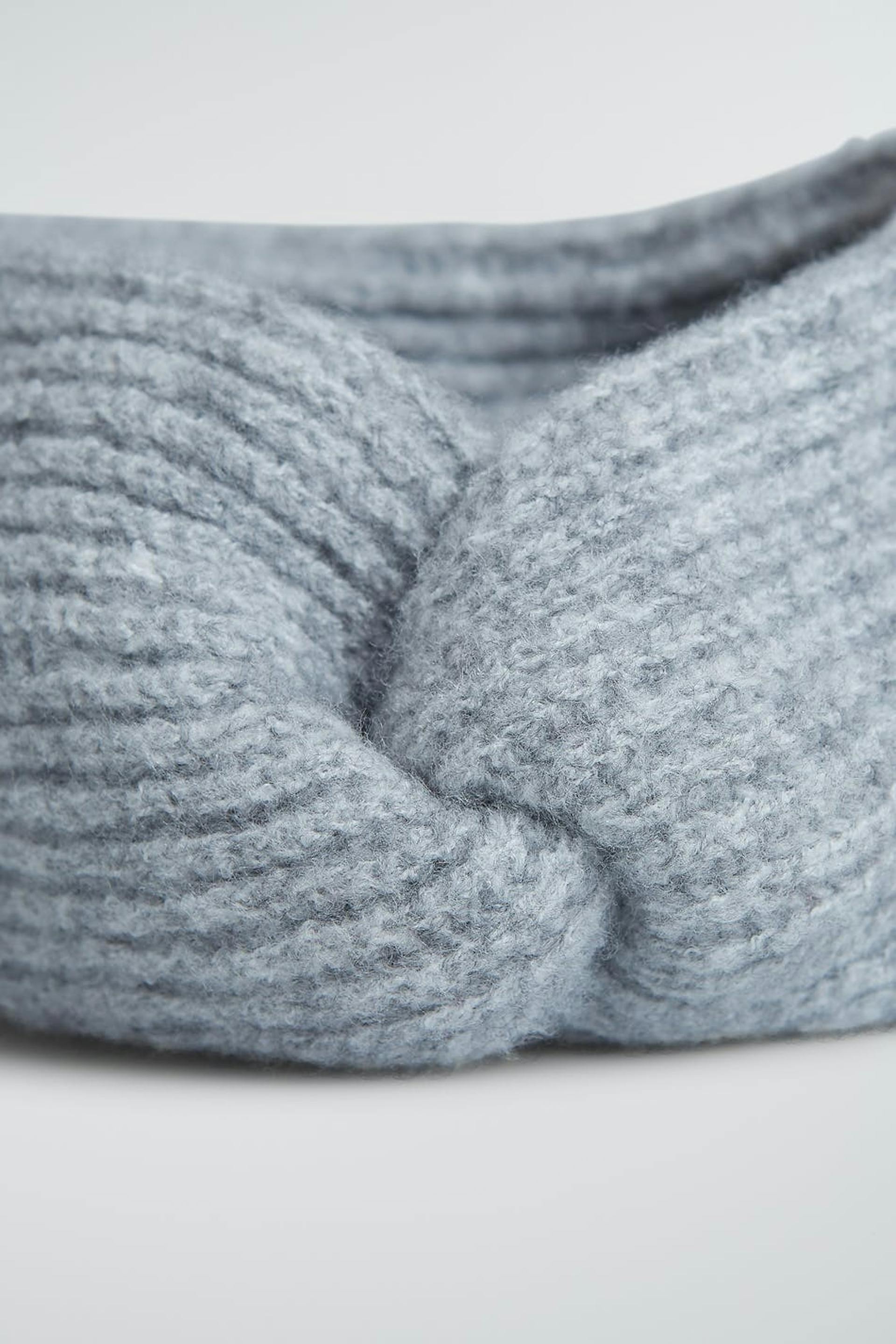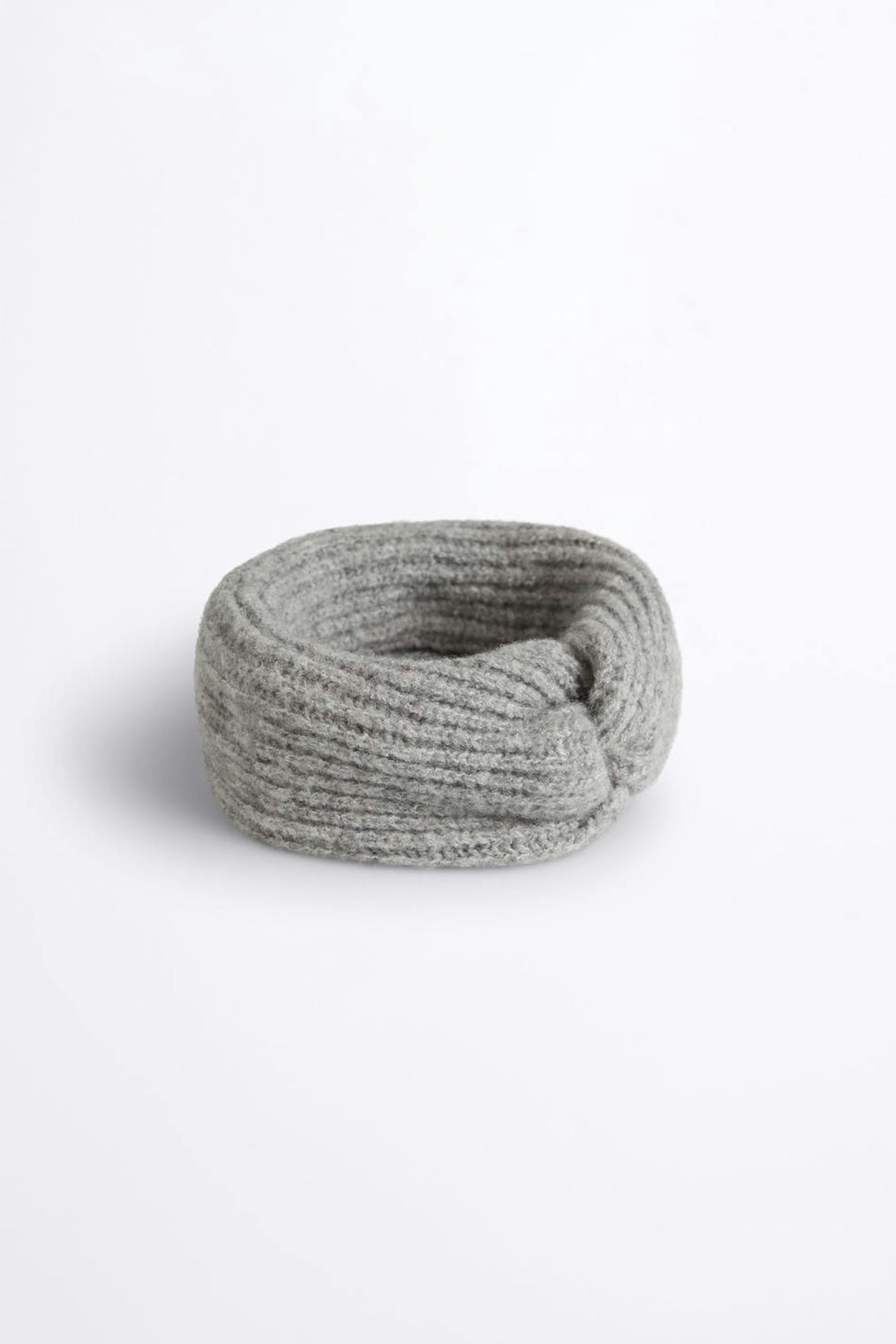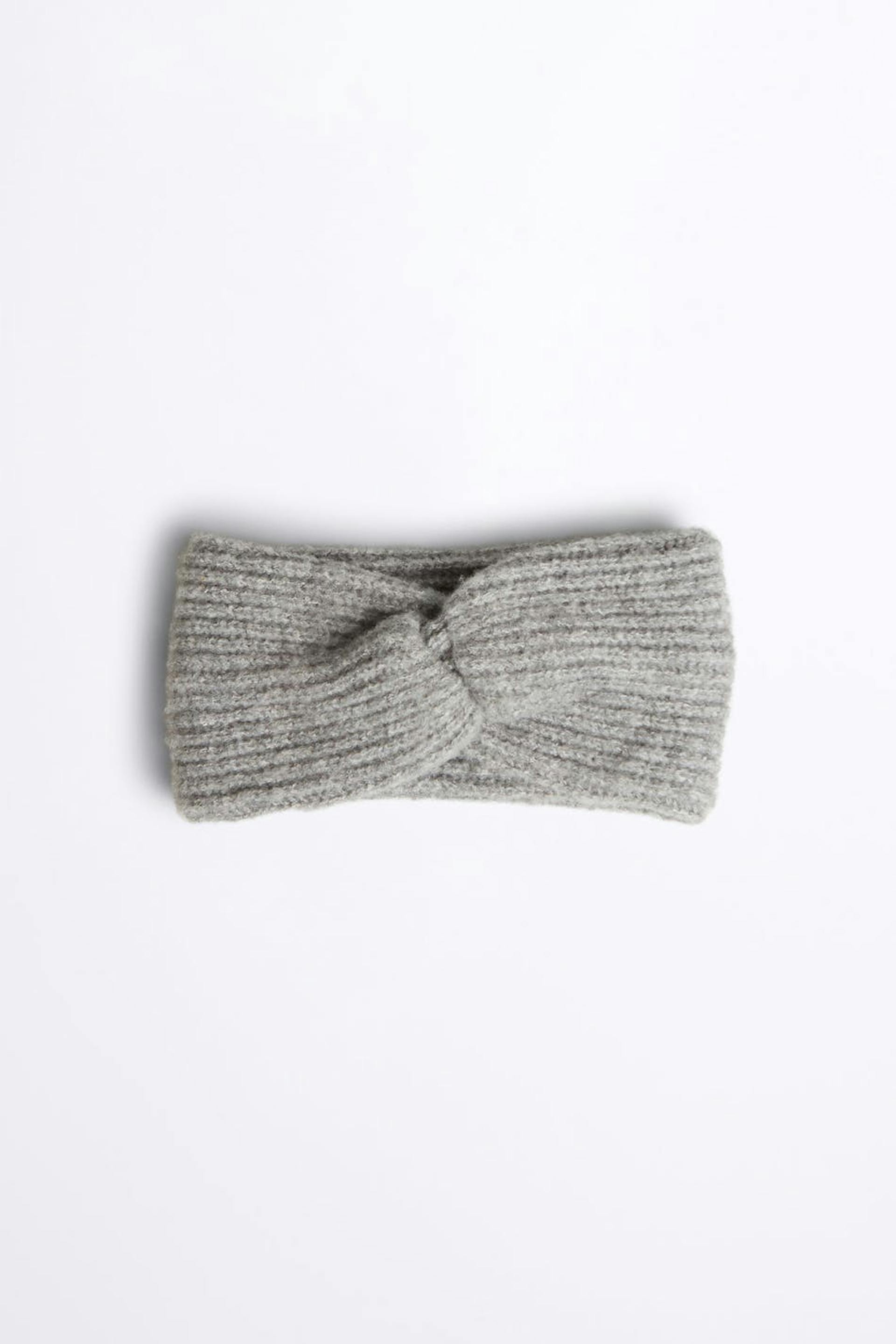 Lämmittävä otsanauha yksityiskohdalla säiellä edessä. Asuste on harmaa ja neulottu.