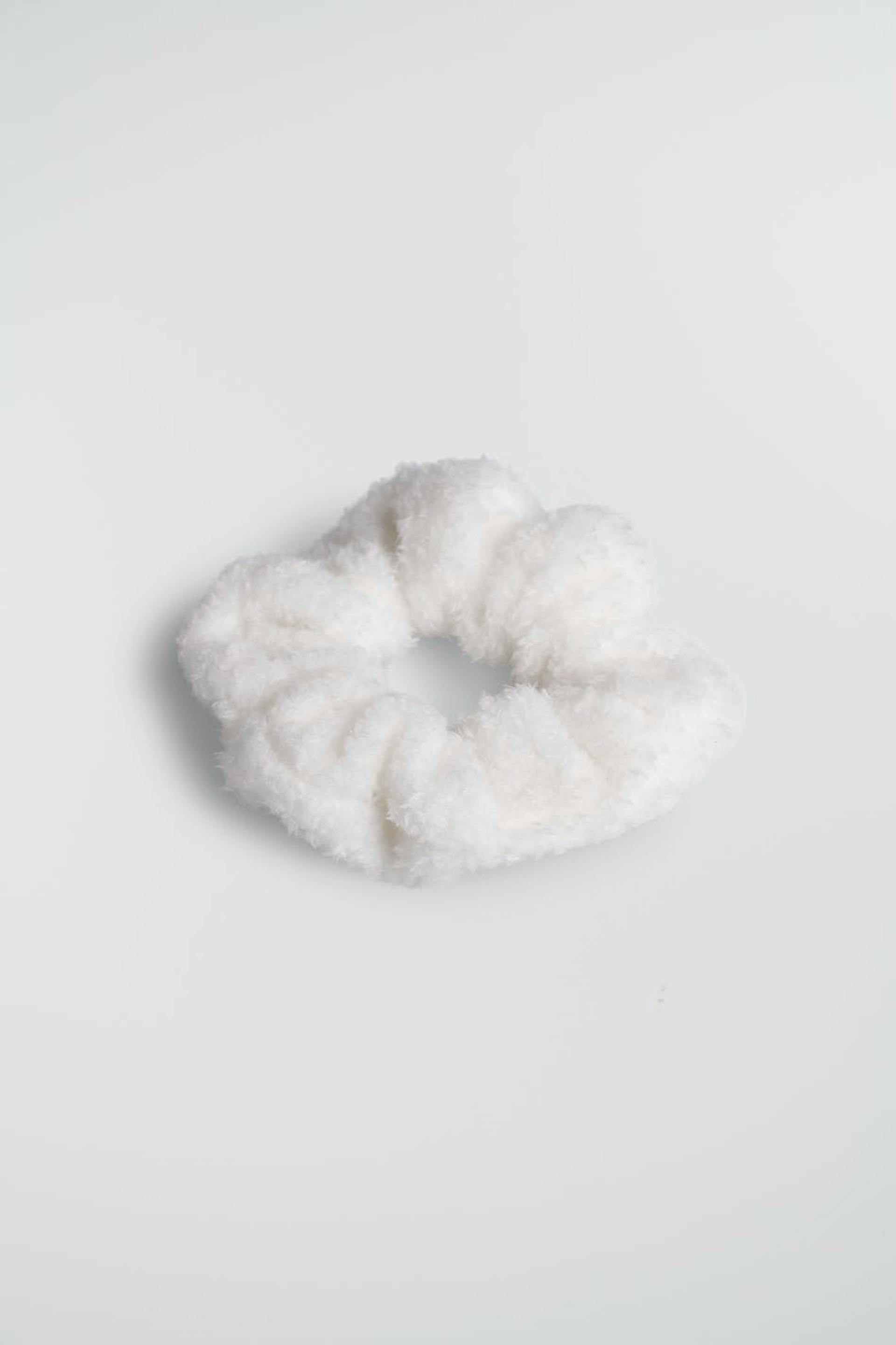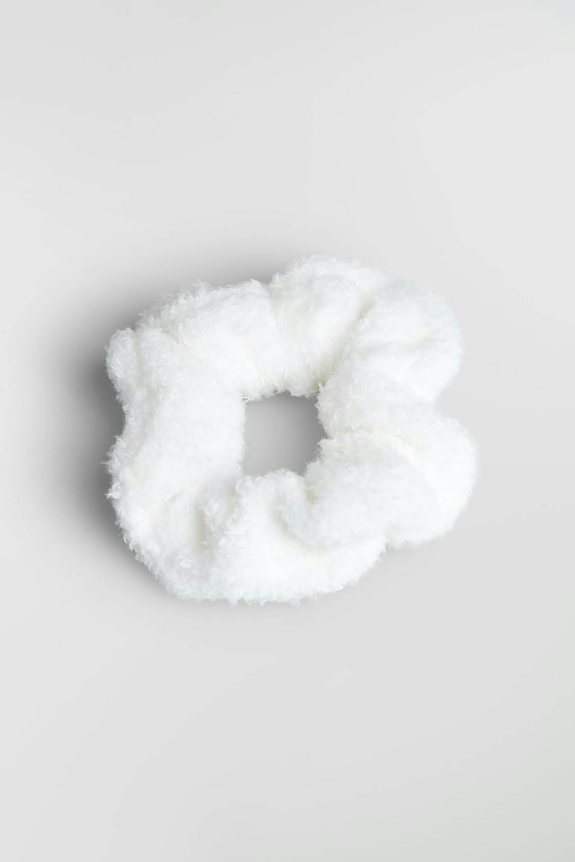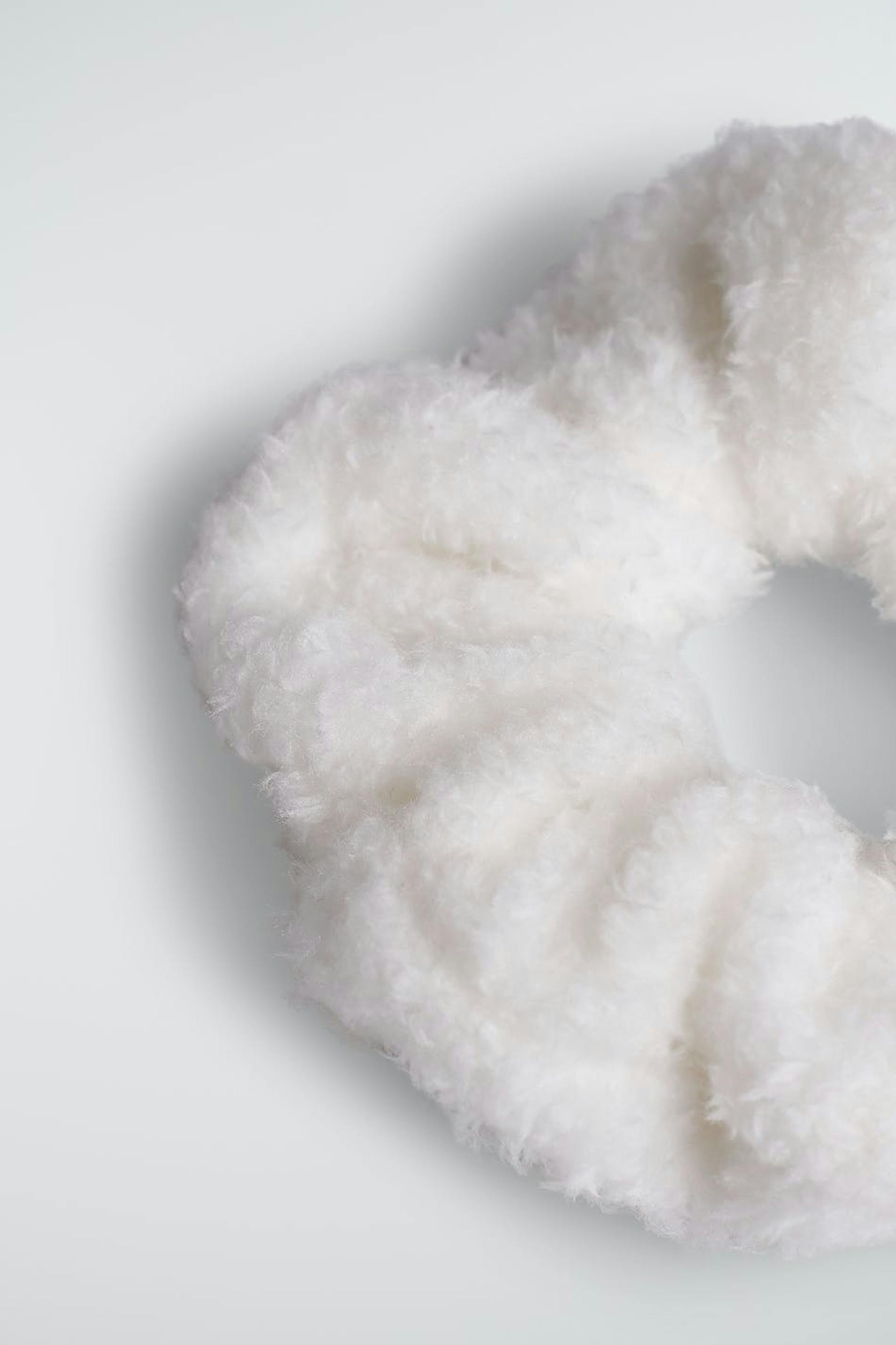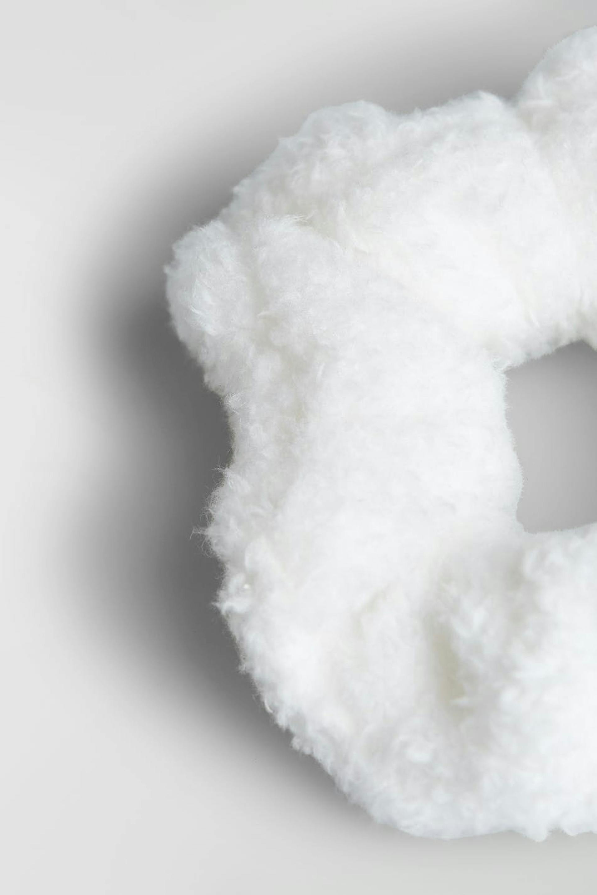 Hiusdonitsi teddy-materiaalilla. Hiusasuste on valkoinen.