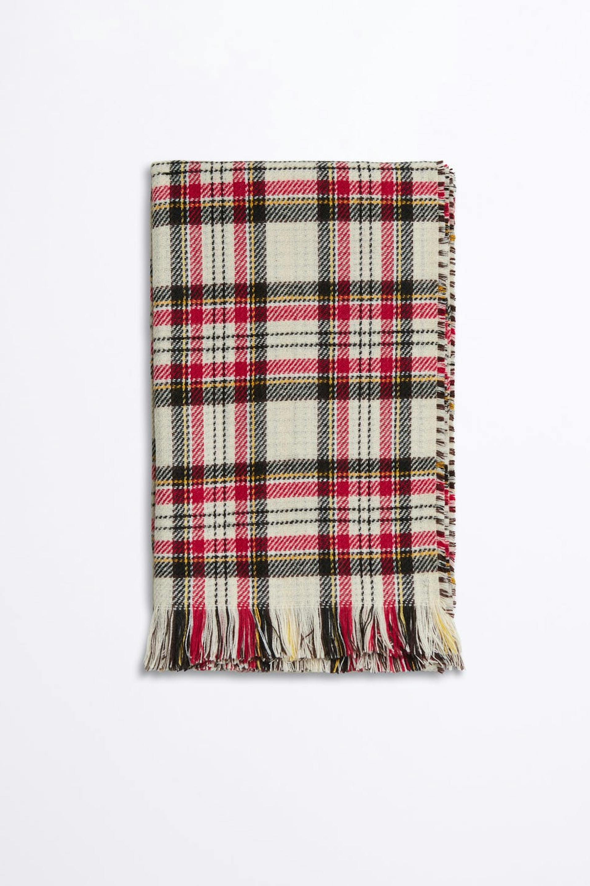Huivi. Huivi on beige ja ruudullinen.
