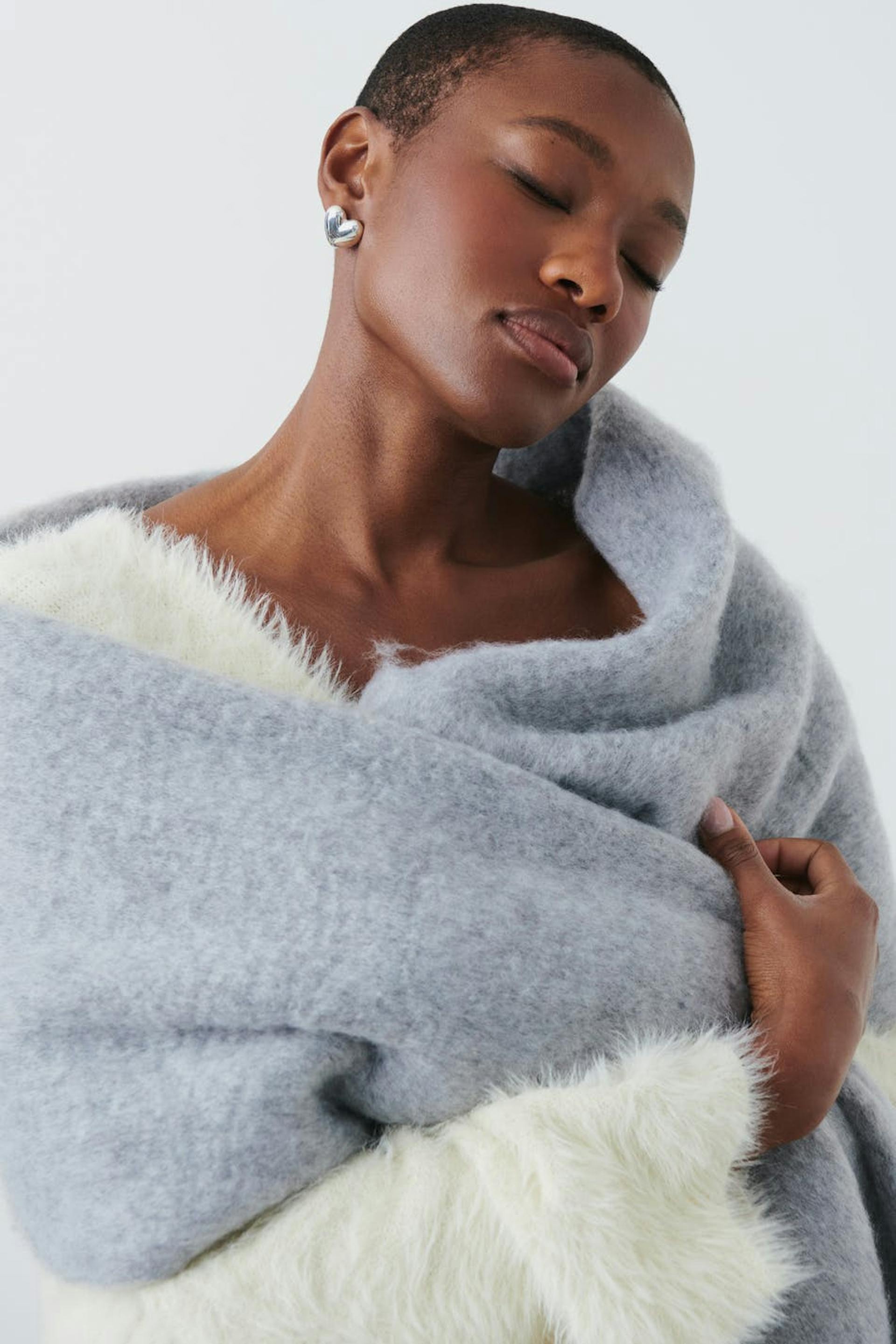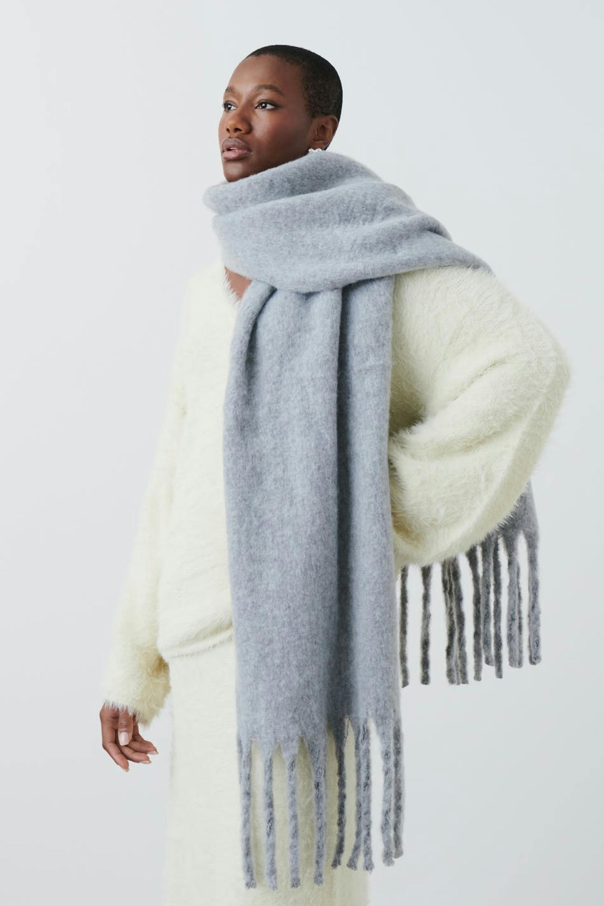 Pehmeäksi harjattu kaulaliina kiemuraisilla hapsuilla lyhyitä sivuja pitkin. Kaulaliina on harmaa.