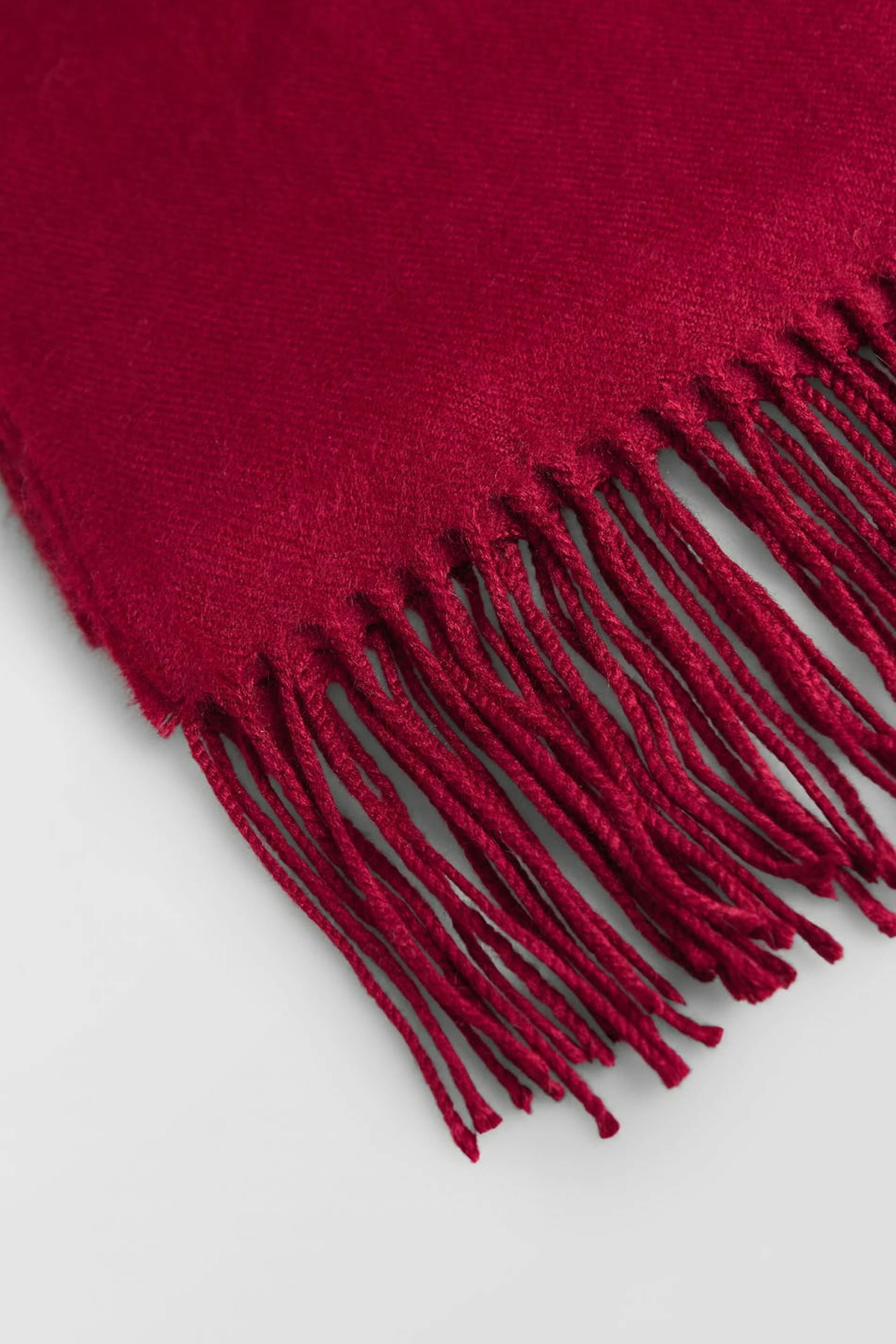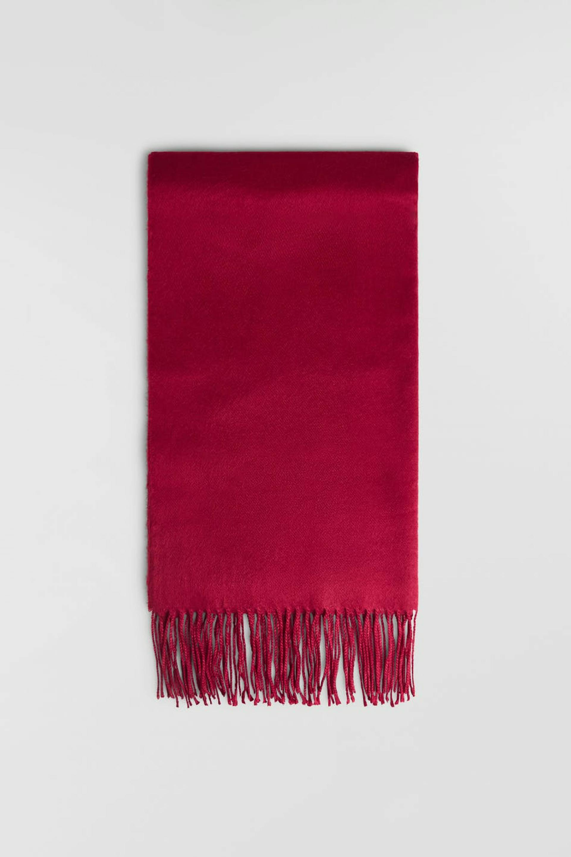 Huivi hapsuilla lyhyillä sivuilla. Huivi on punainen.