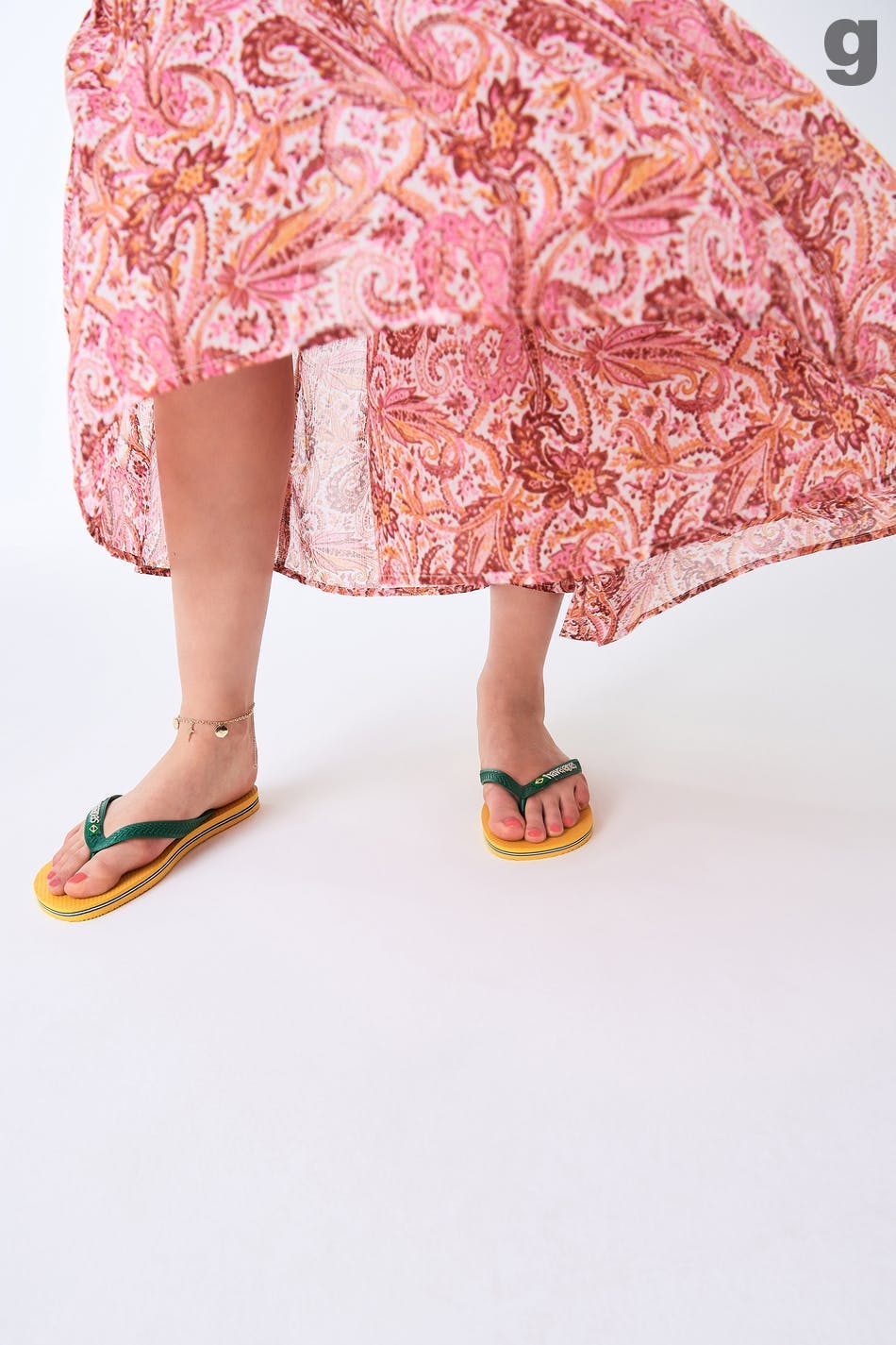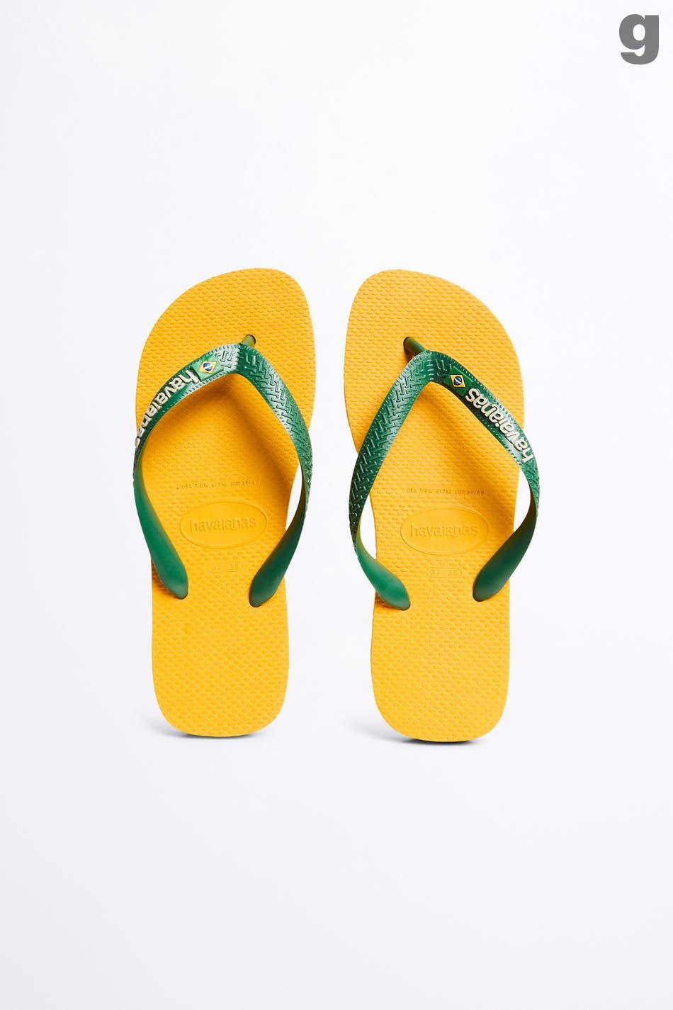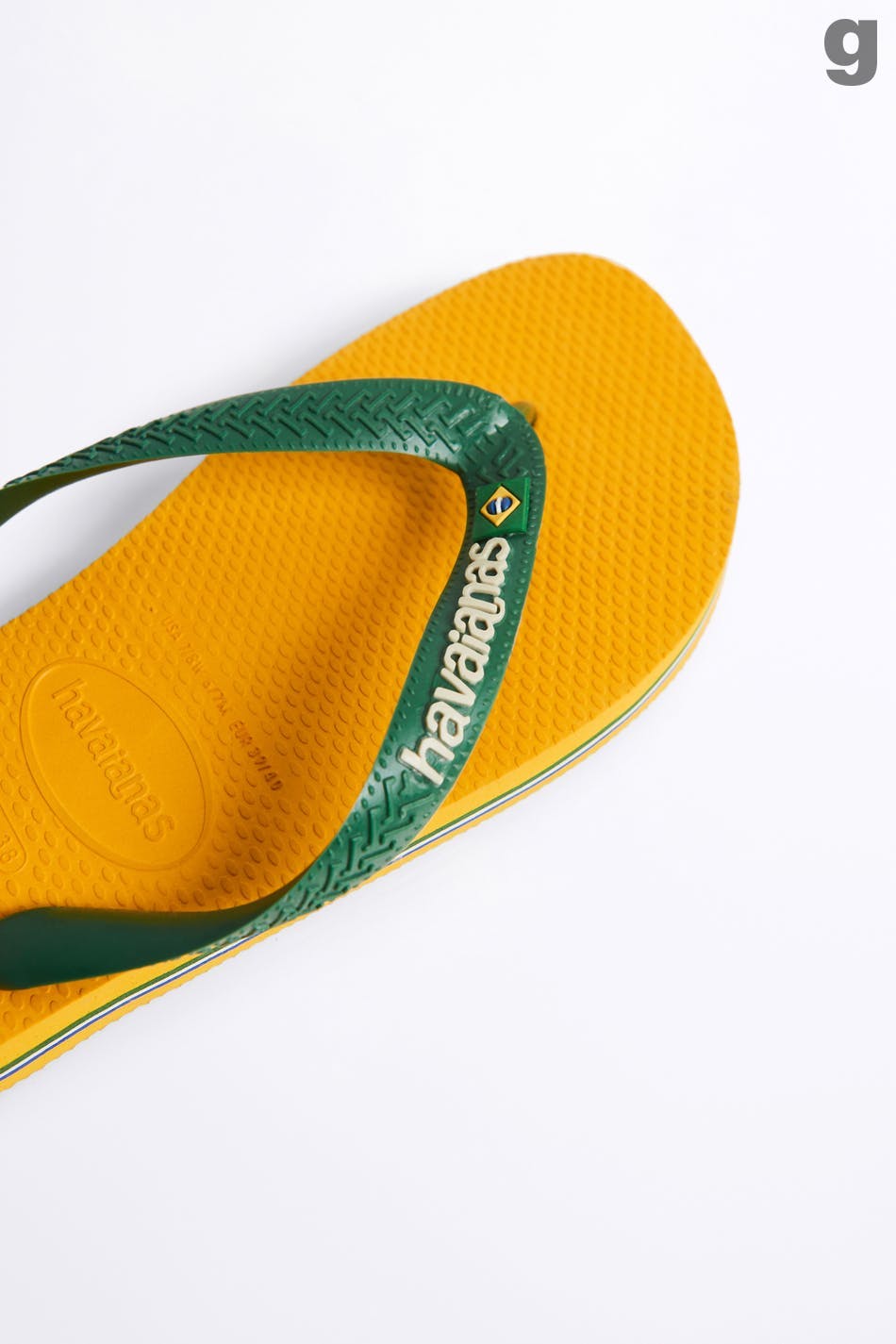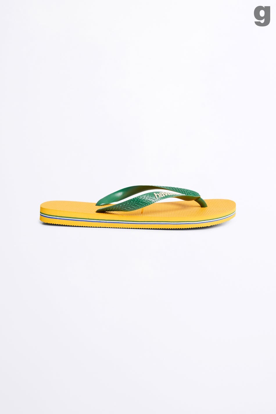 Flip flopit Havaianas-tuotemerkiltä vihreällä hihnalla lipulla. Sandaaleissa on keltainen pohja. Niissä on ohuet hihnat brändilogolla.
