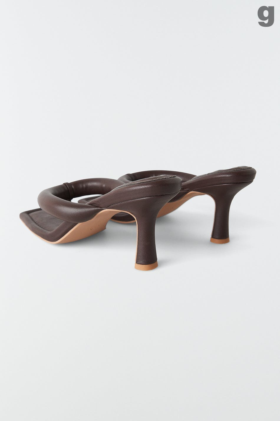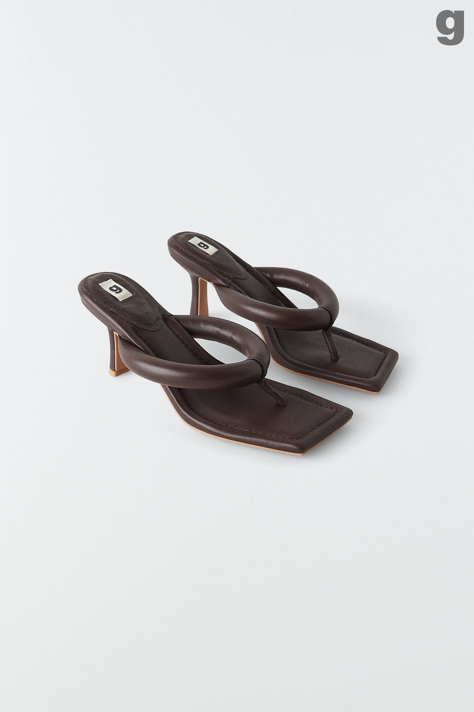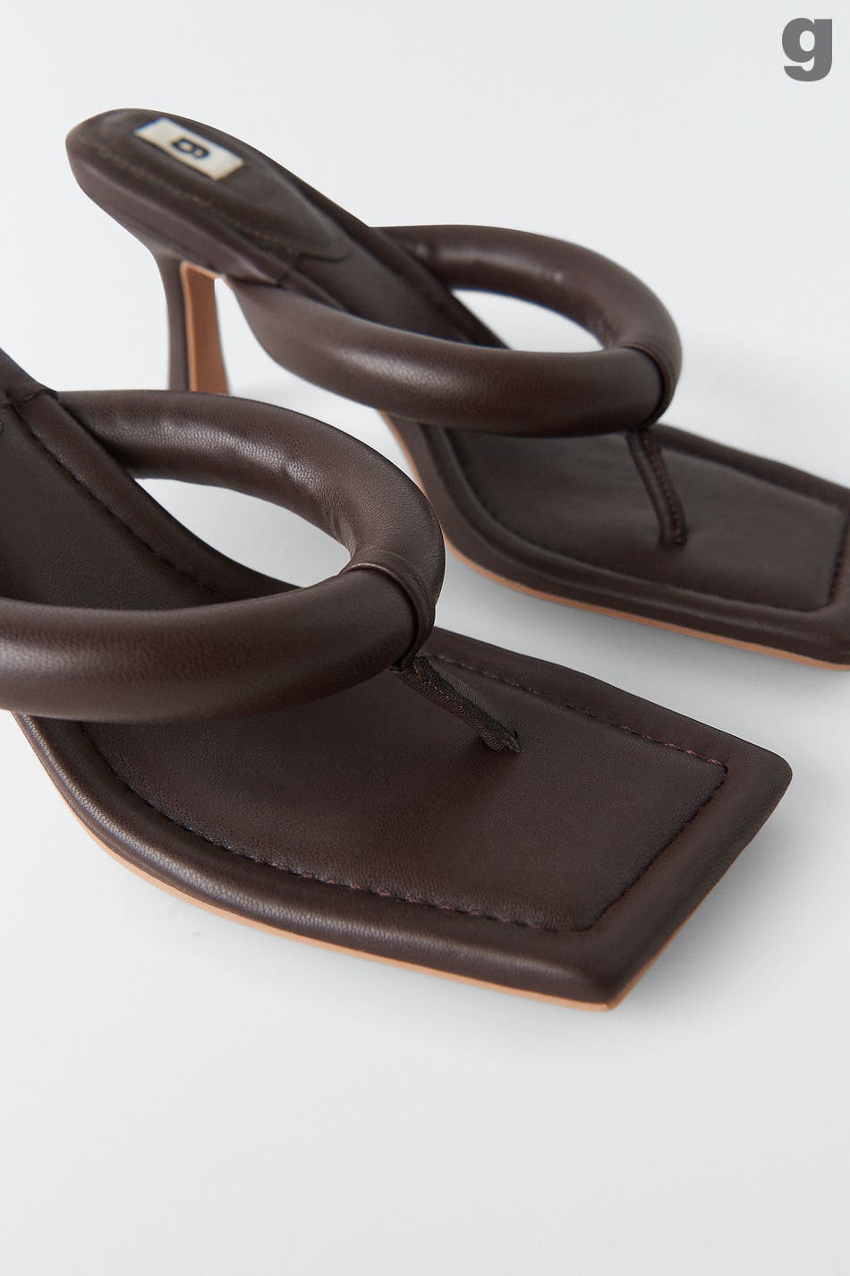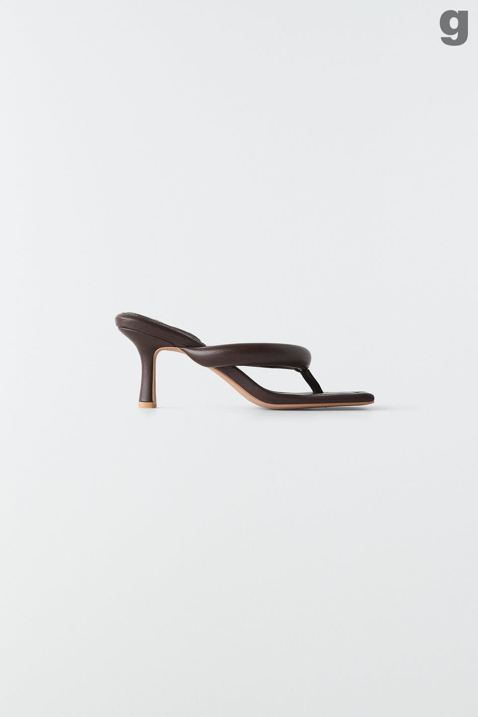 Korkeakorkoiset sandaalit slip in -mallilla tekonahasta. Sandaalit ovat ruskeita ja niissä on kulmikas kärki. Niissä on topattu varvasremmi ja stilettikorko.