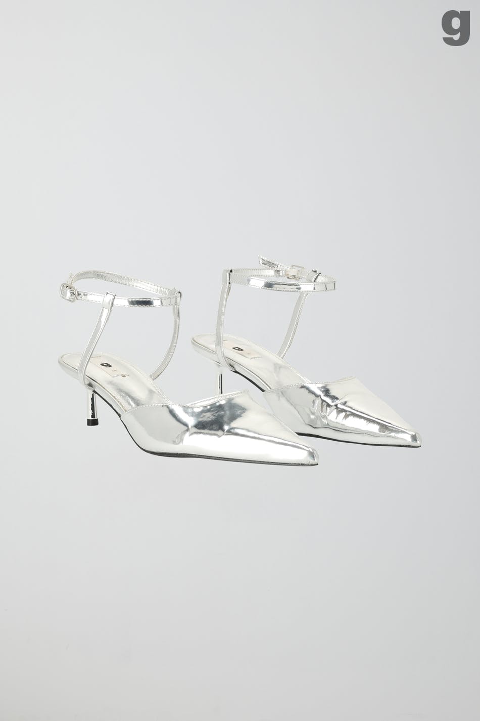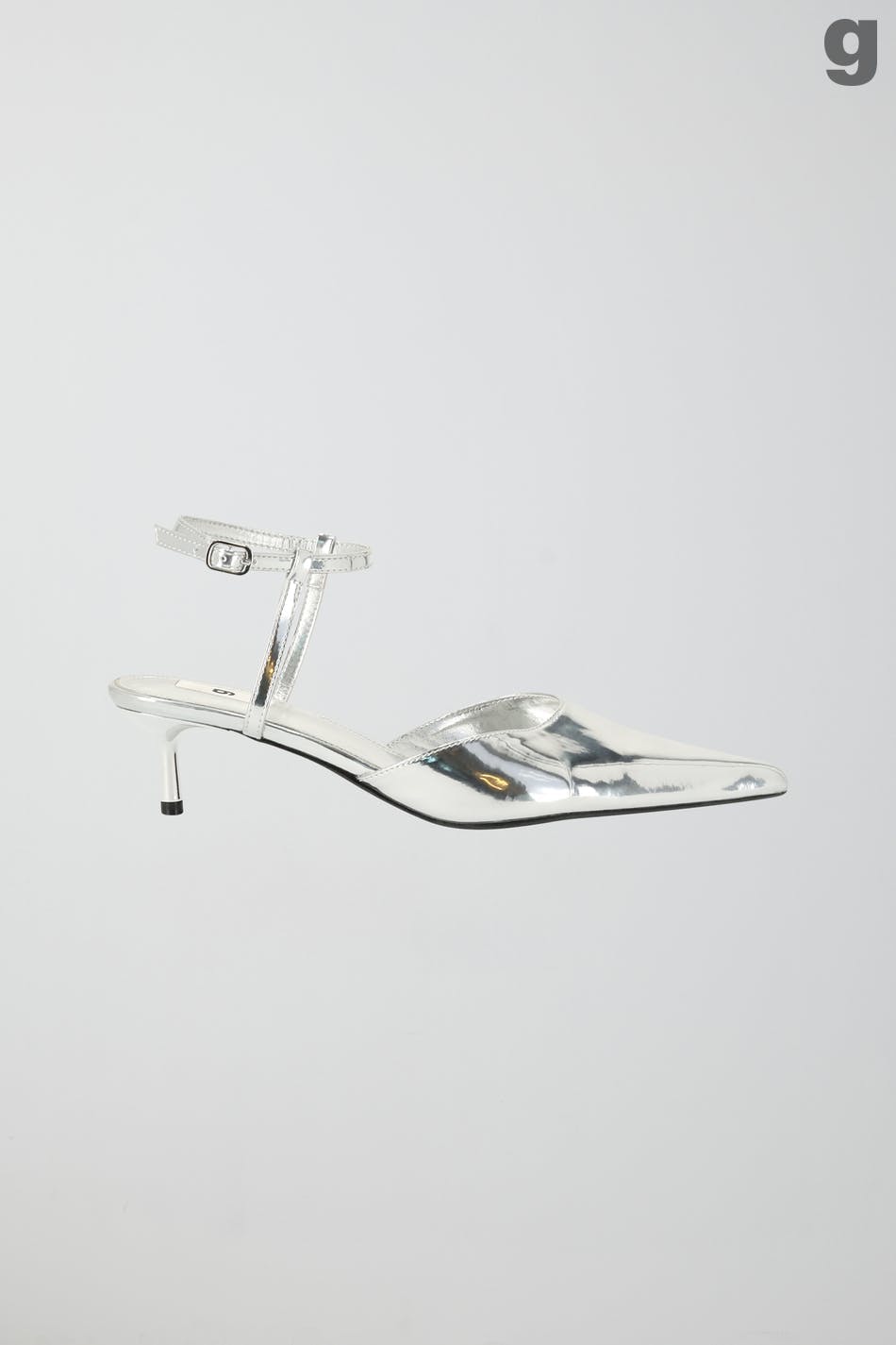 Hopeanväriset korkokengät terävällä kärjellä. Kengissä on säädettävä hihna metallisella soljella nilkan ympärillä.