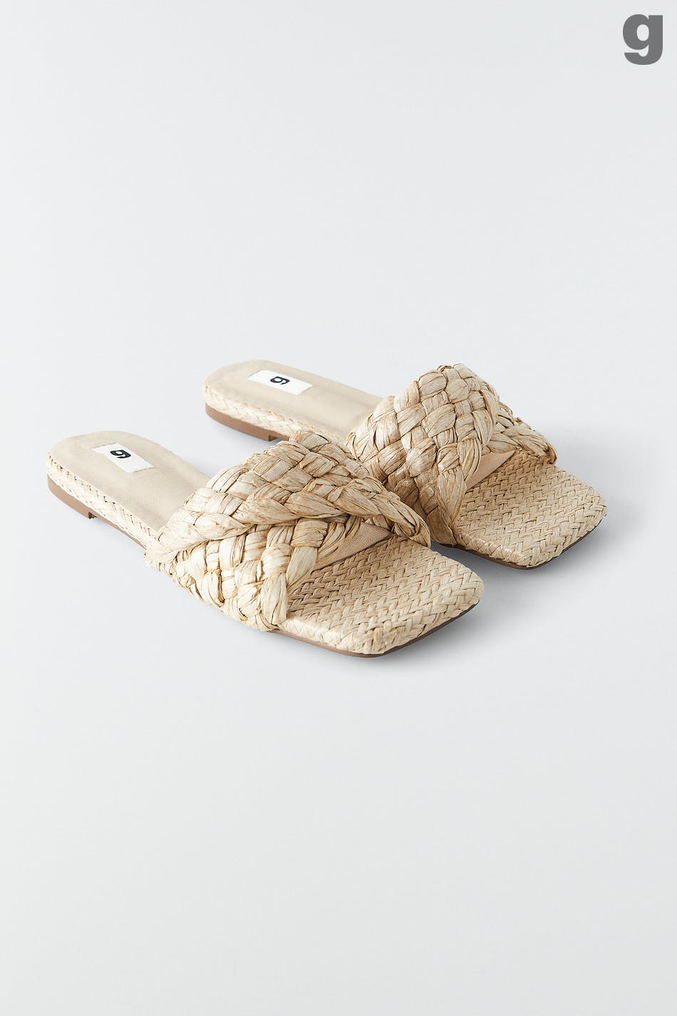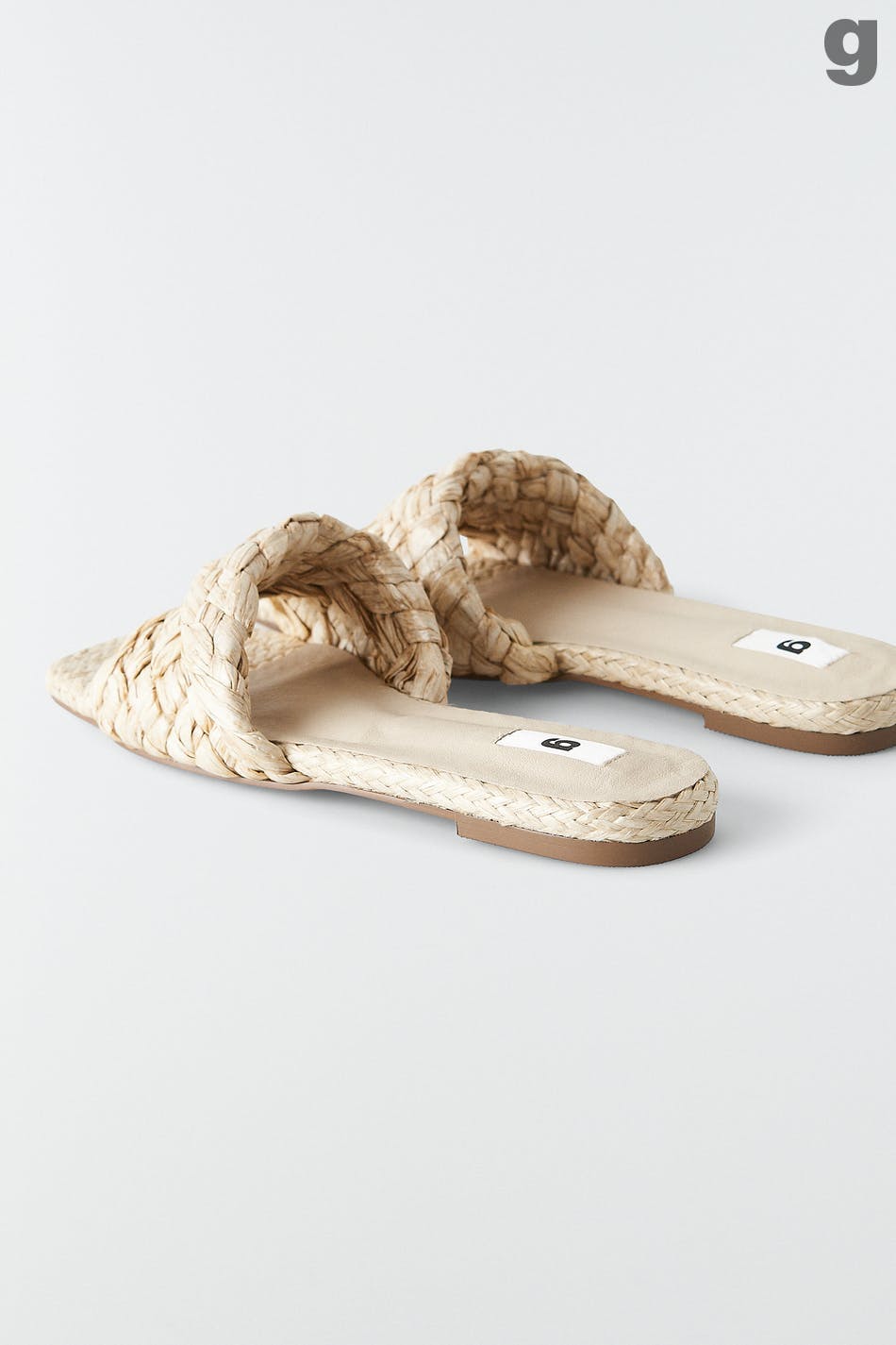 Jalkaan vedettävä sandaali palmikkoyksityiskohdalla oljesta. Sandaali on beige.