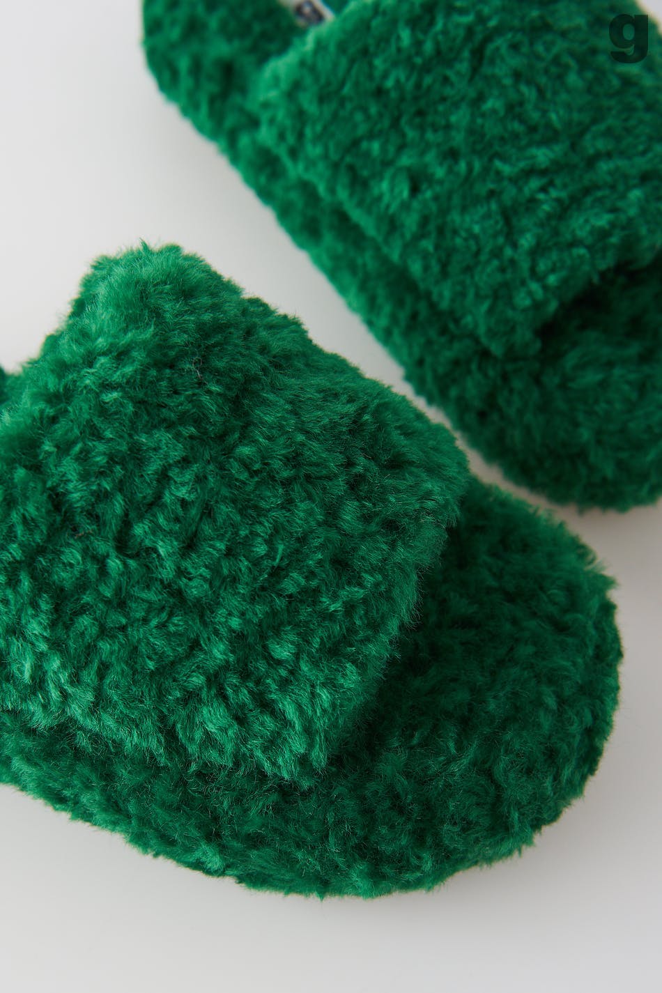 Pörröiset tossut slip in -mallilla. Tossut ovat vihreitä ja niissä on avokärki. Niissä on paksu pohja ja leveä jalkaremmi.