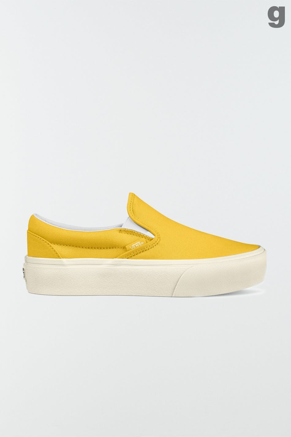 Lenkkarit Vans-tuotemerkiltä loaferimallilla. Kengät ovat keltaisia ja niissä on platform-pohjat. Niissä on kuminauha sivuilla ja pyöreä kärki.