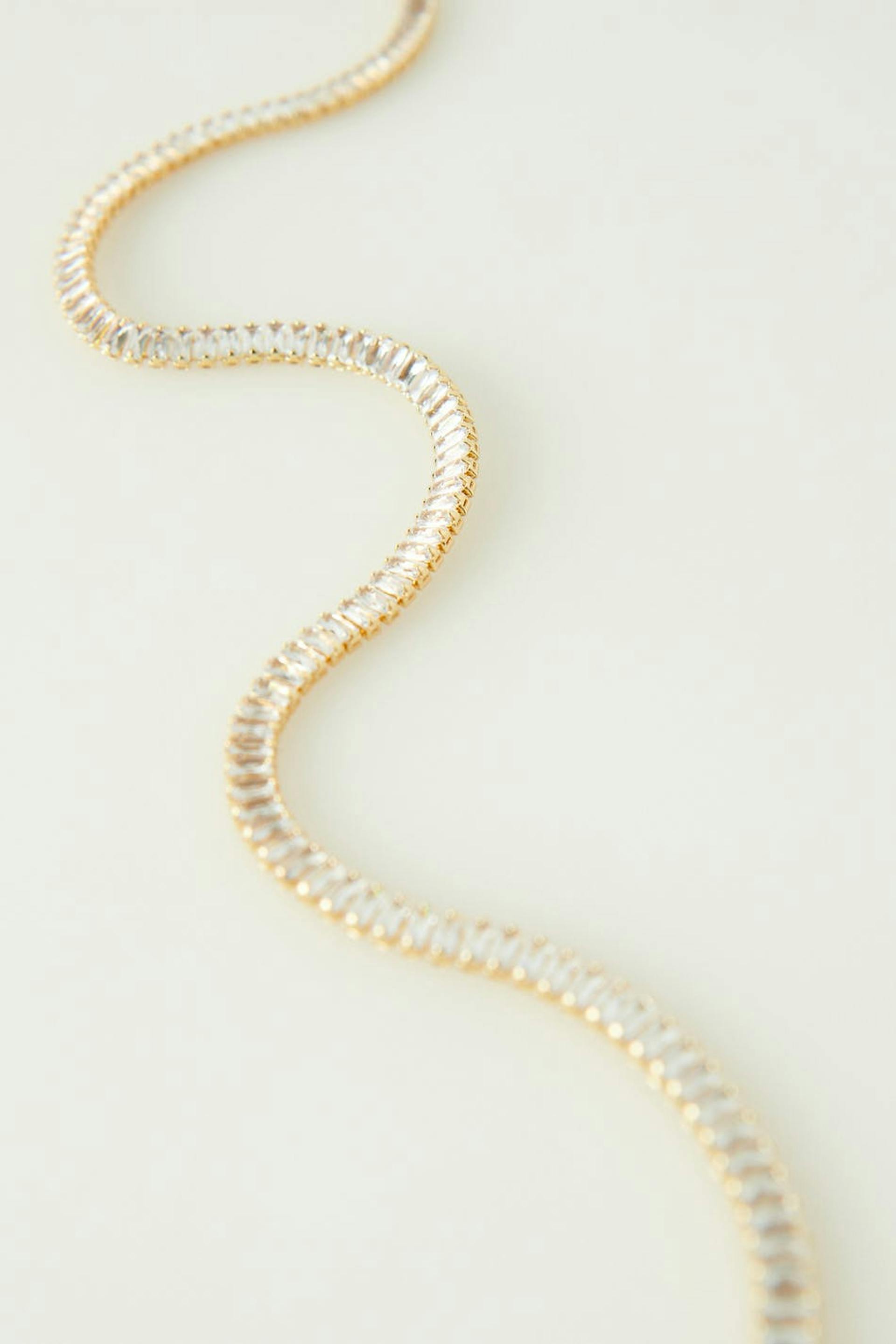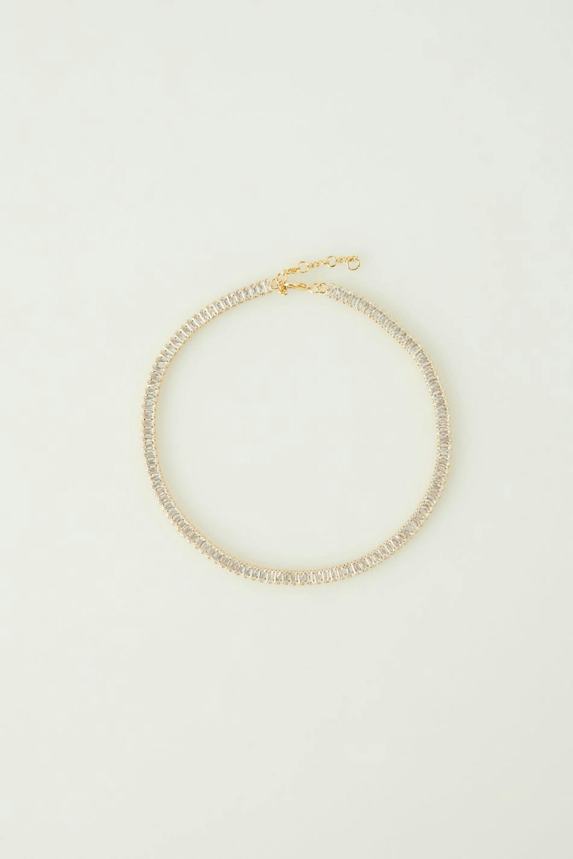 Kaulakoru kulmikkailla kivillä. Korut ovat kultaisia ja niissä on kiinnitys hummerilukolla.