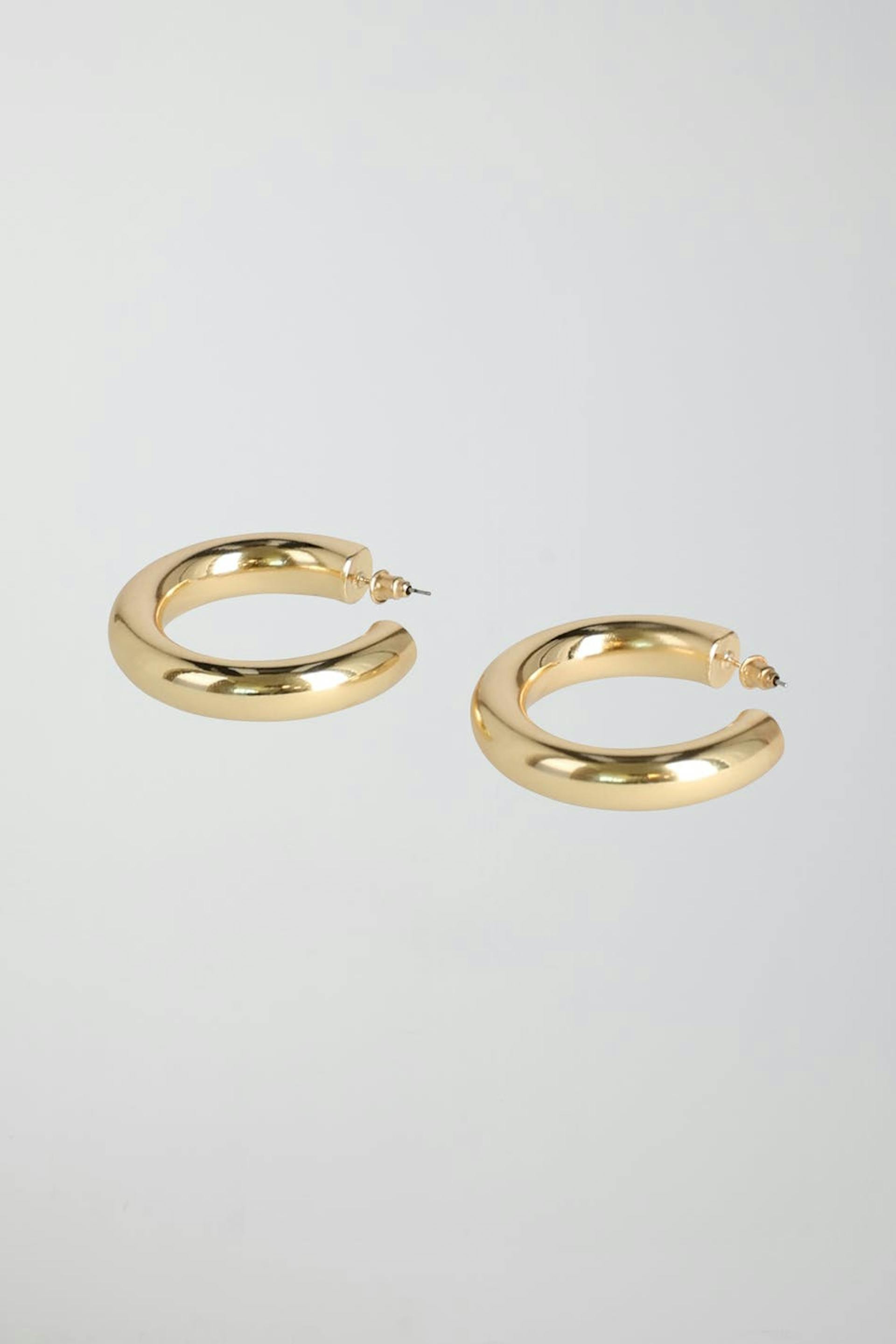 Suuret rengaskorvakorut sileällä huolittelulla. Rengaskorvakorut ovat kultaisia.