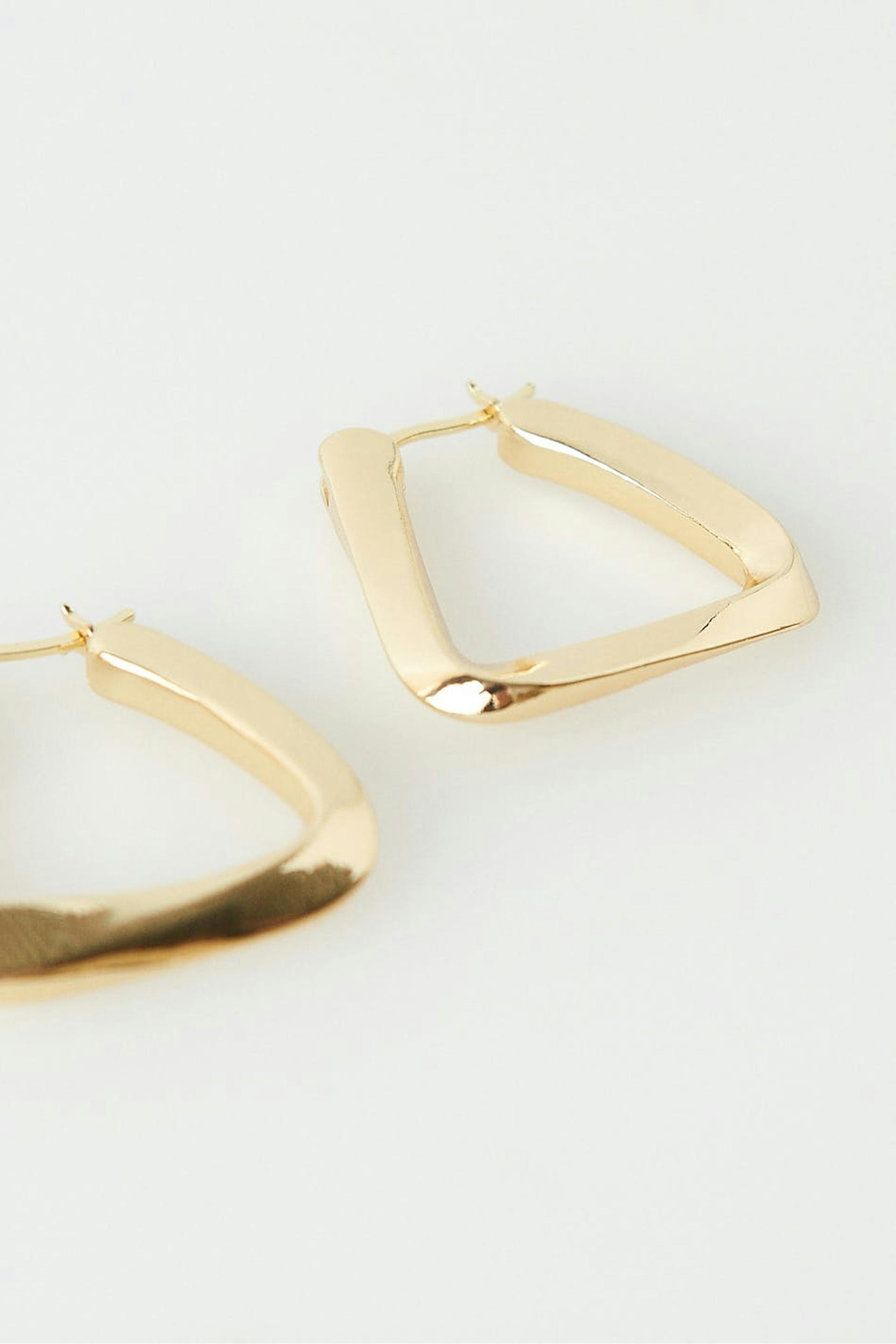 Kulmikkaat korvakorut punotulla muotoilulla. Korvakorut ovat kultaisia.