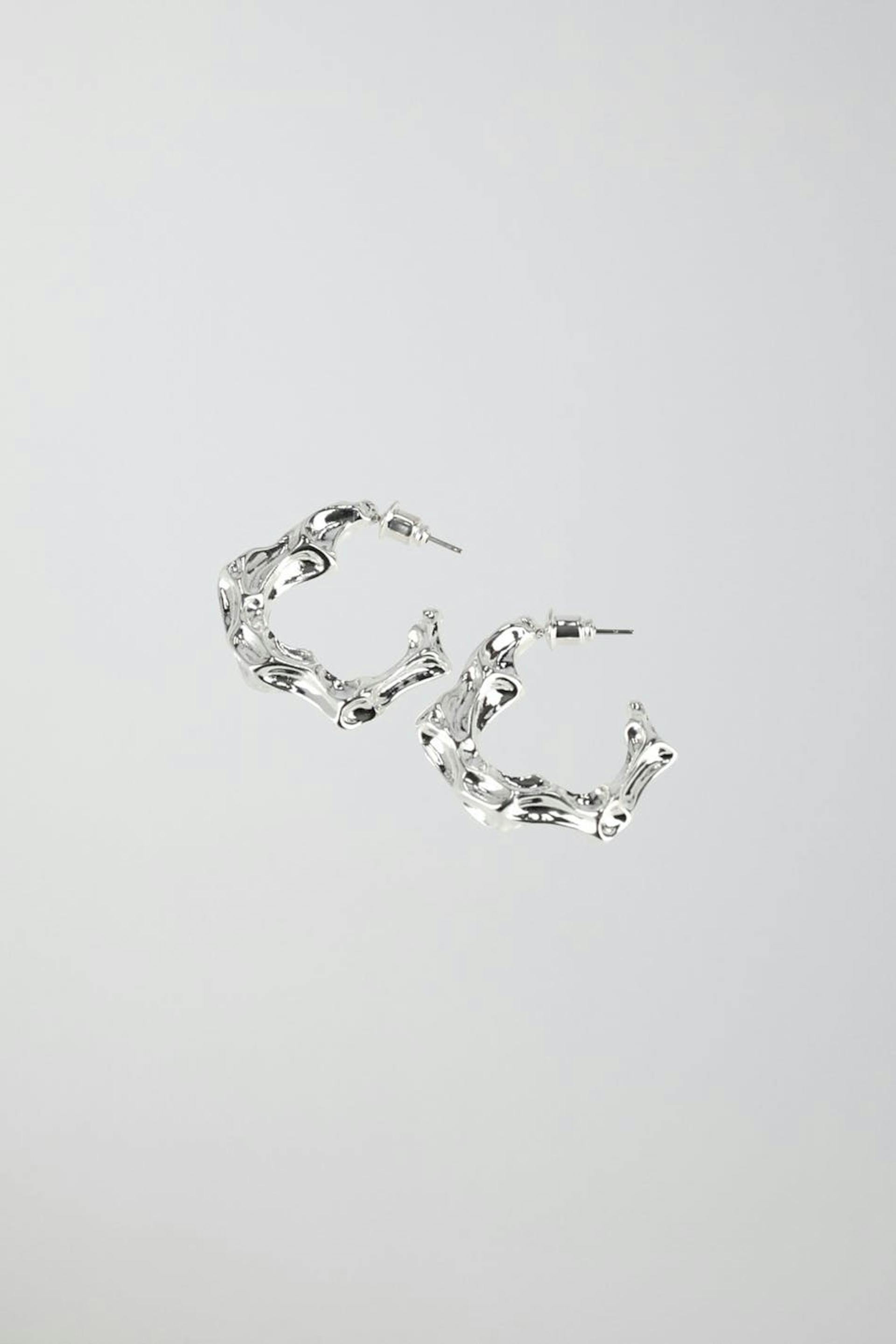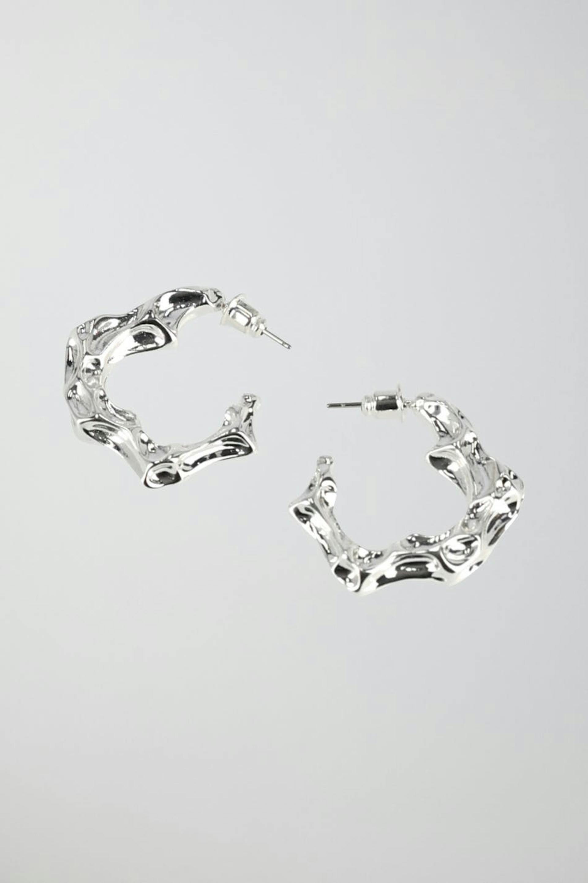 Korvakorut epäsäännöllisellä pinnalla. Korvakorut ovat hopeita ja niissä on kiiltävä huolittelu.