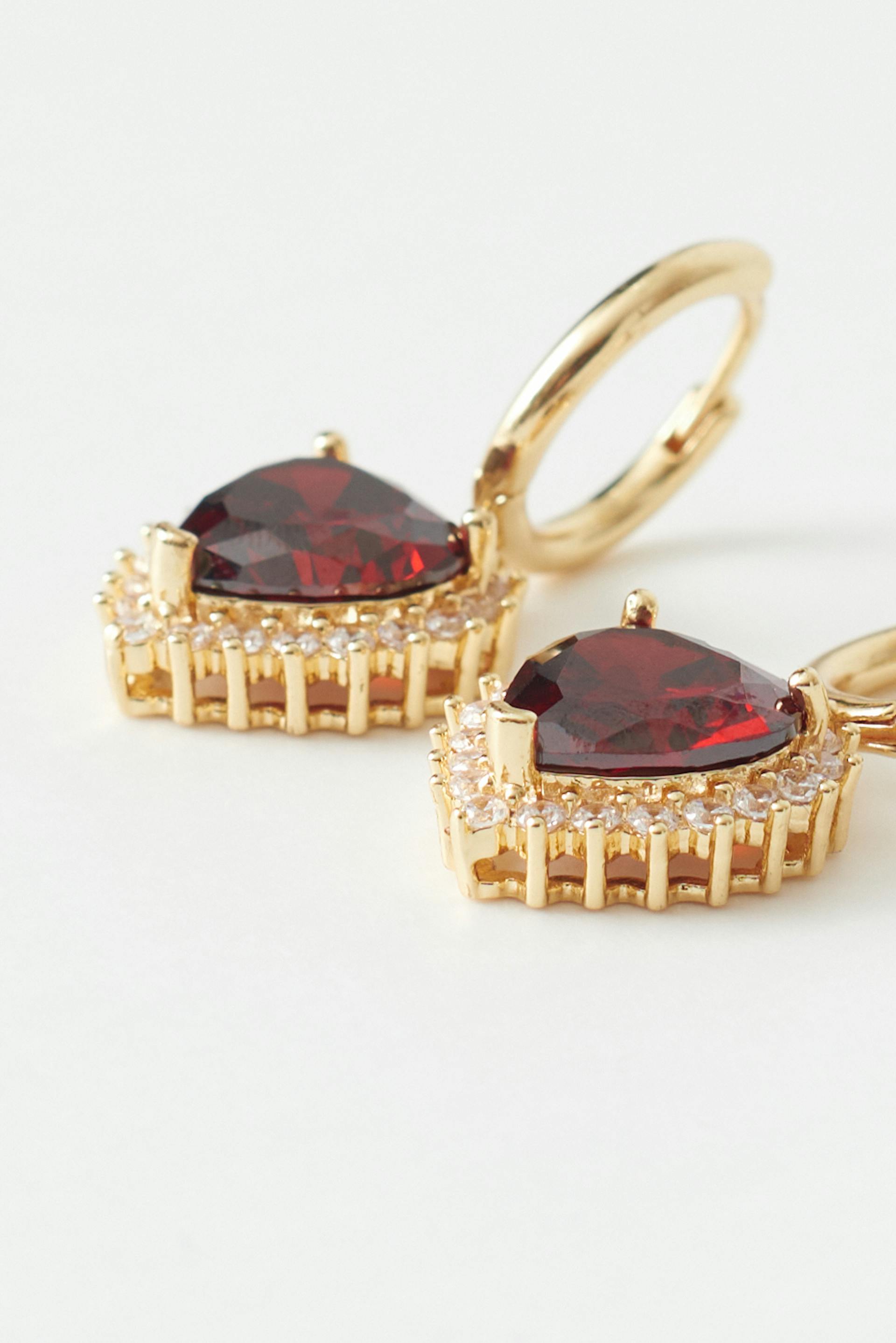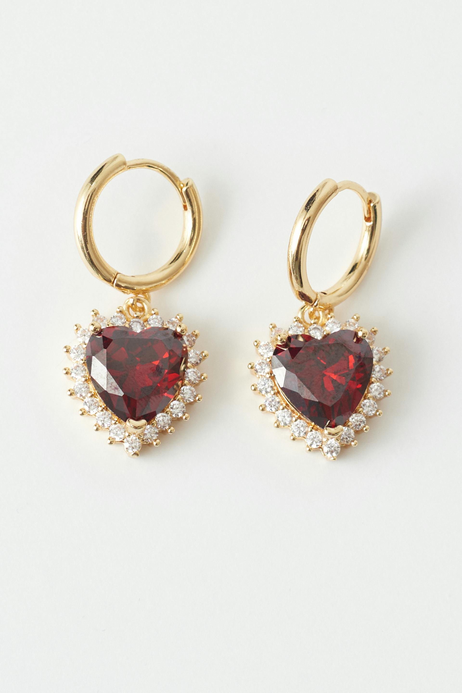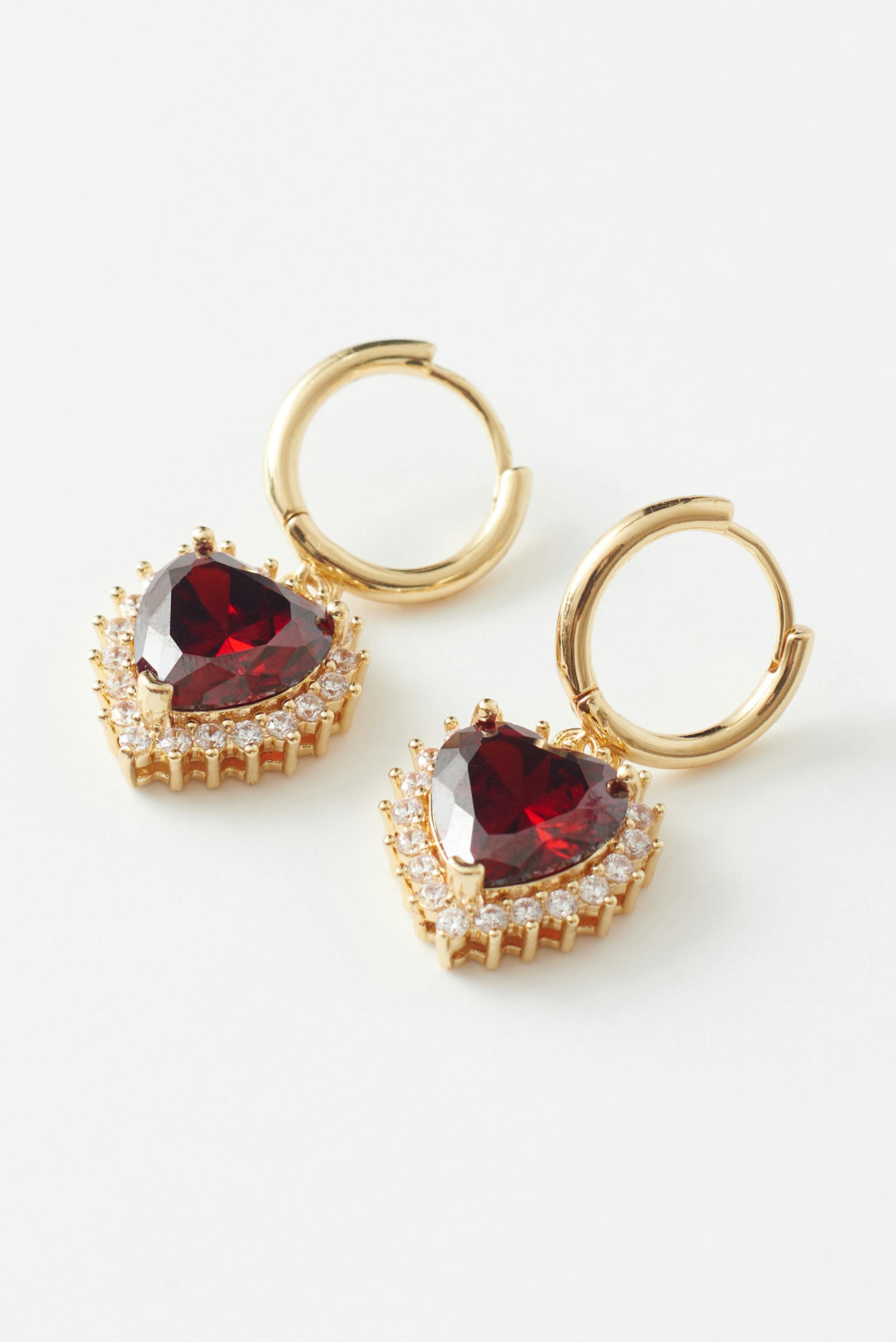 Sydämenmuotoiset korvakorut kivillä. Korvakorut ovat kultaisia ja punaisia ja niissä on strassiyksityiskohdat.
