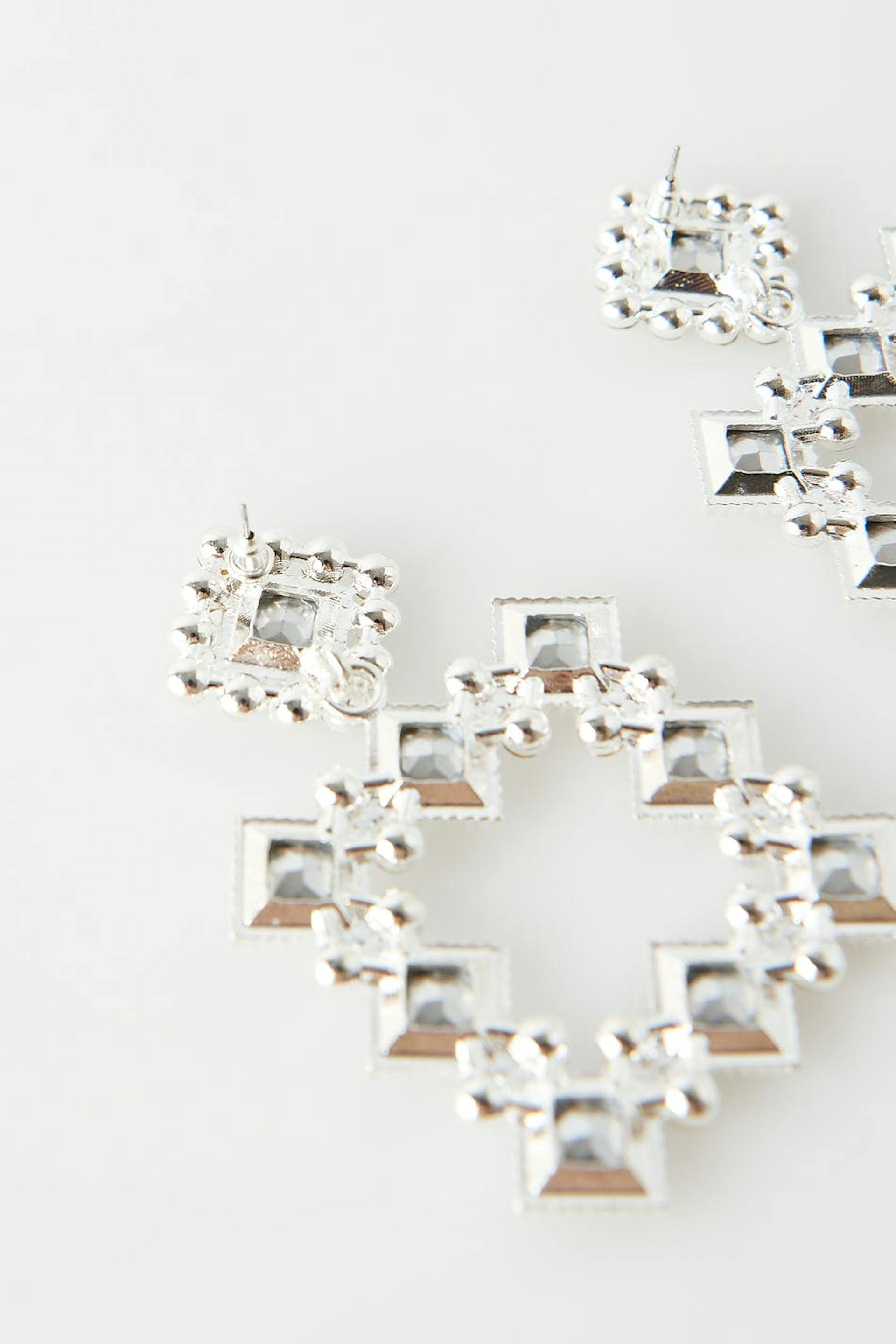 Kulmikkaat korvakorut strassiyksityiskohdilla. Korvakorut ovat hopeita.