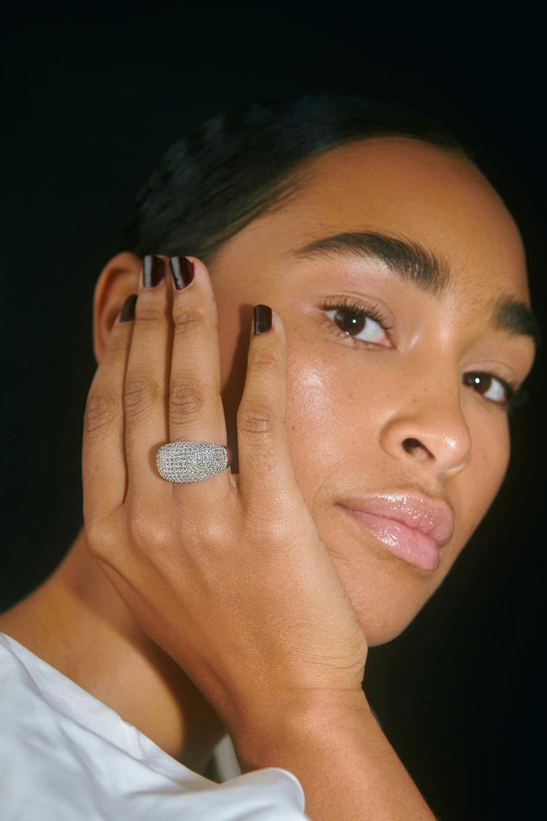 Muli Collection X Gina Tricot. Nikkelivapaa sormus 925-sterlinghopeasta tekojalokivillä. Sormus on hopeoitu ja siinä on chunky-istuvuus.