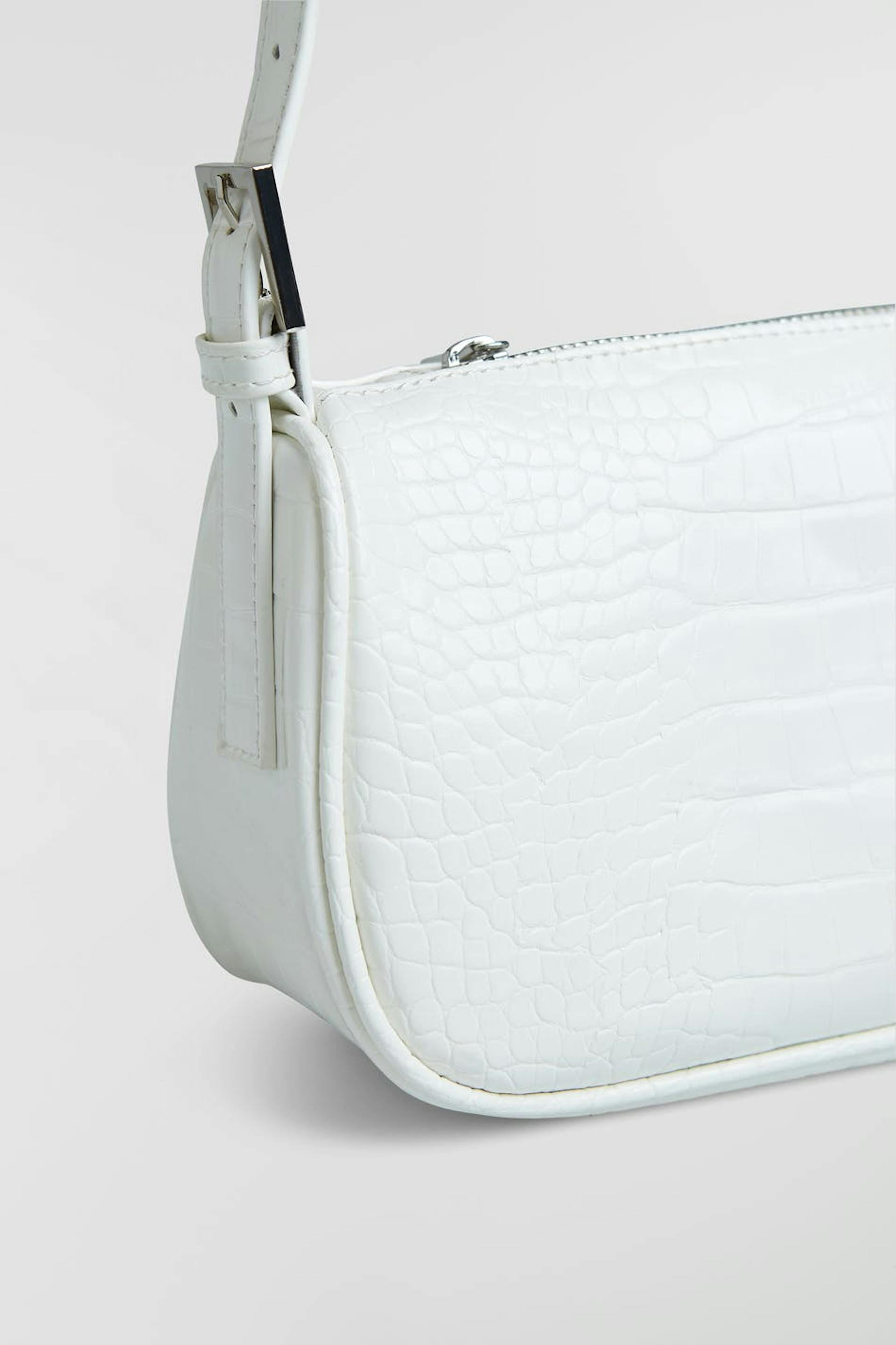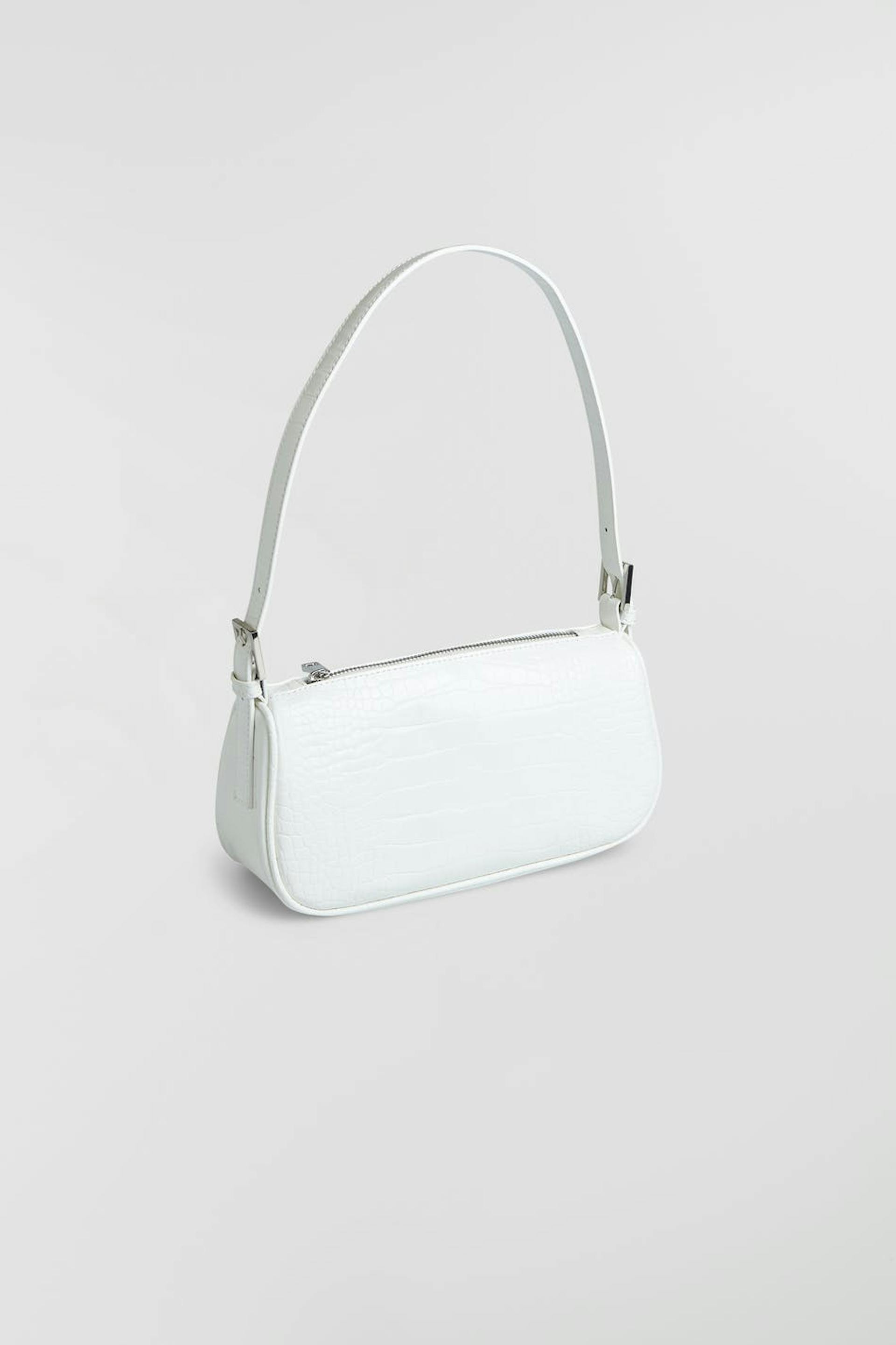 Krokotiilikuvioinen laukku lyhyellä, säädettävällä olkaimella. Laukku on valkoinen ja siinä on vetoketju ylhäällä.