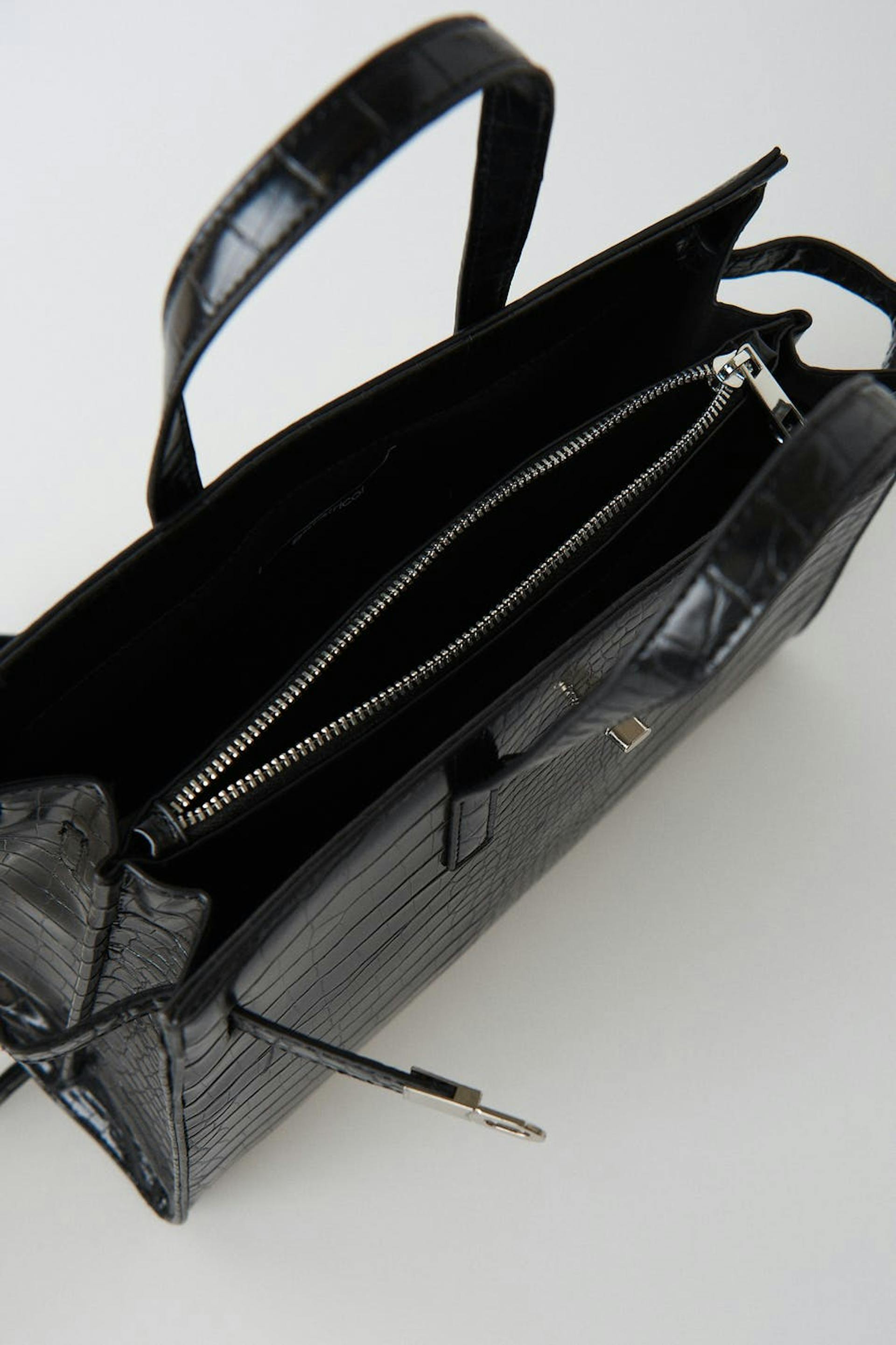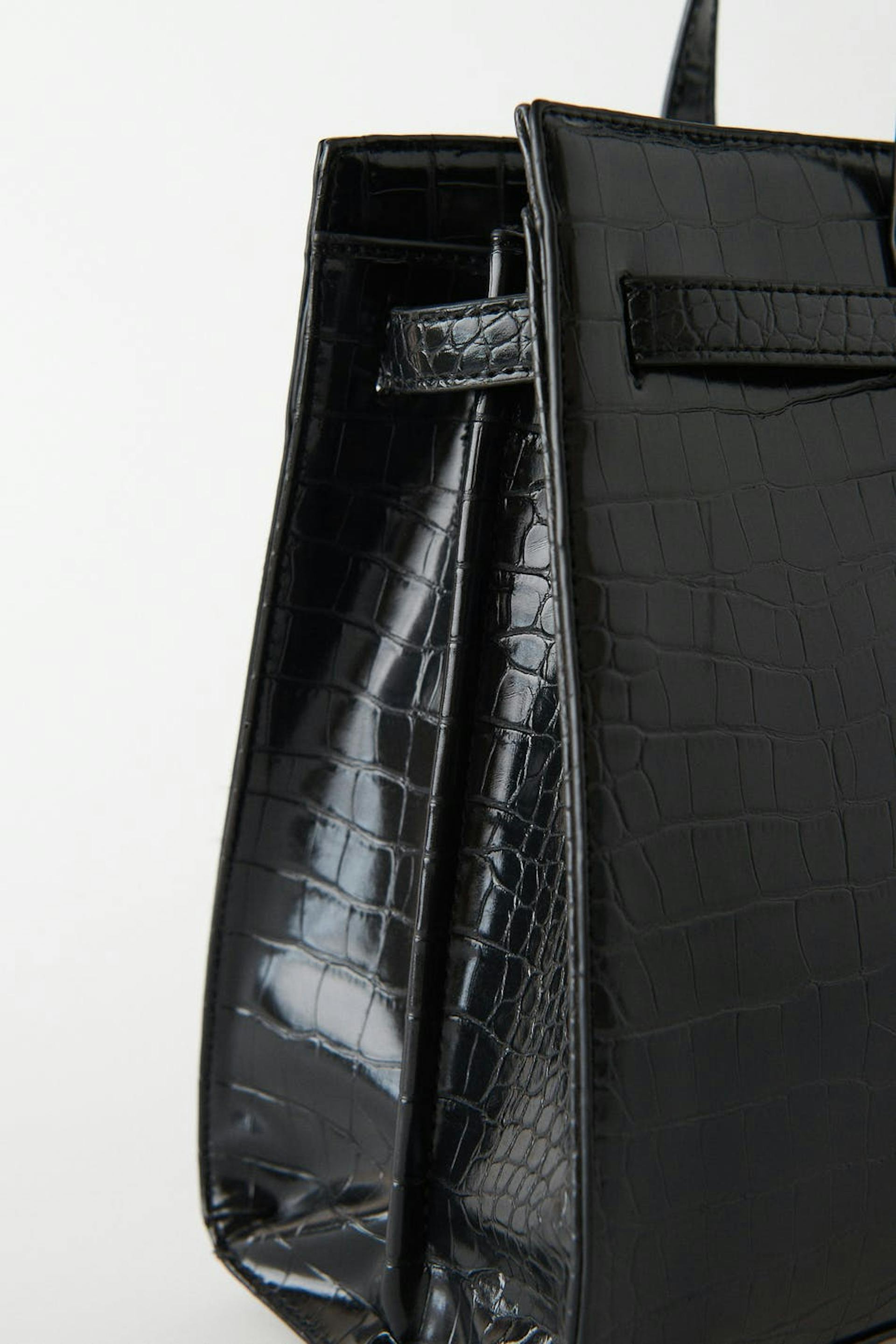 Krokotiilikuvioinen laukku PU:sta metallikiinnikkeellä. Laukku on musta ja siinä on pitkä, säädettävä olkain. Siinä on sangat ja lukko vetoketjulla ylhäällä.