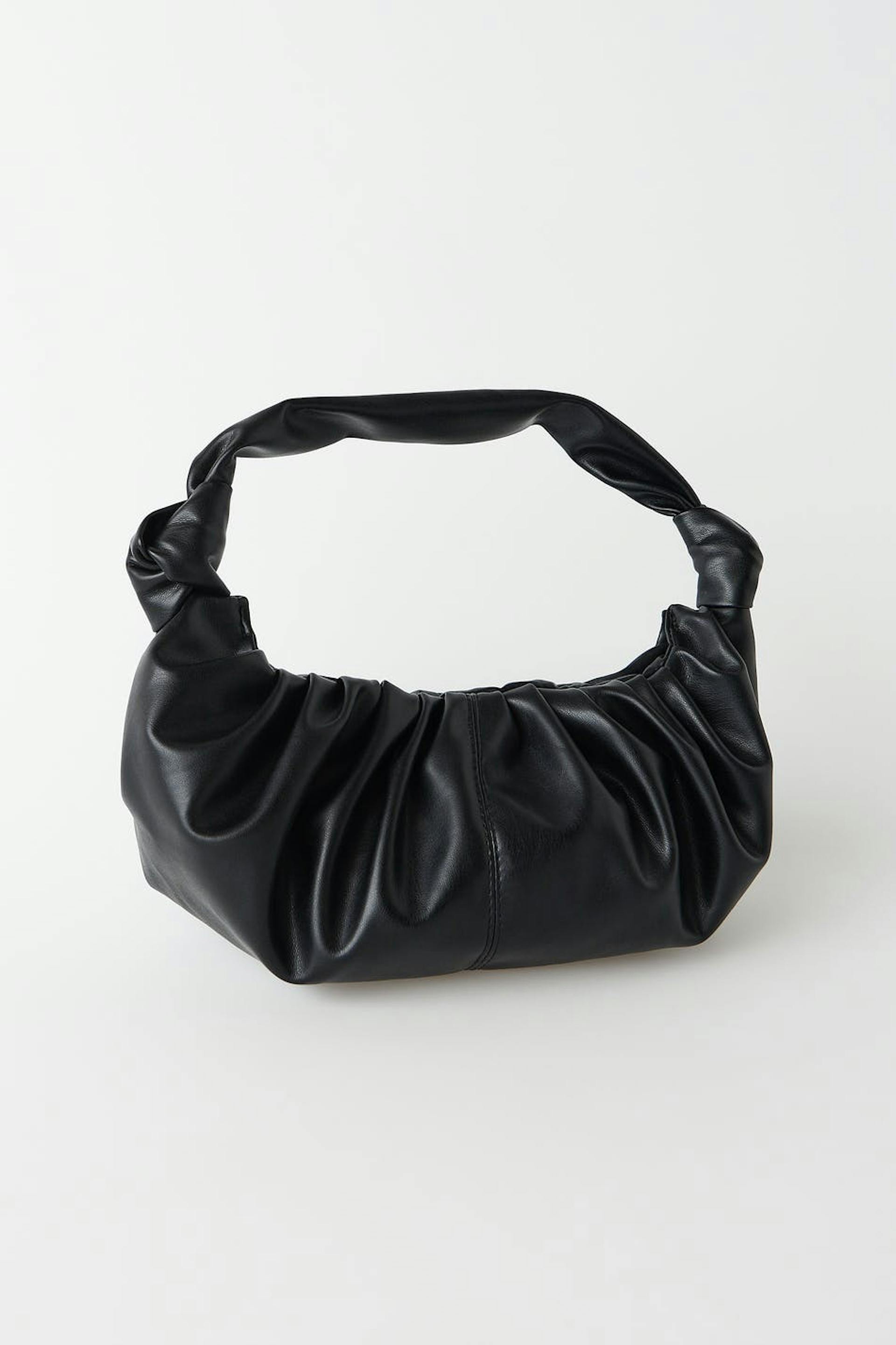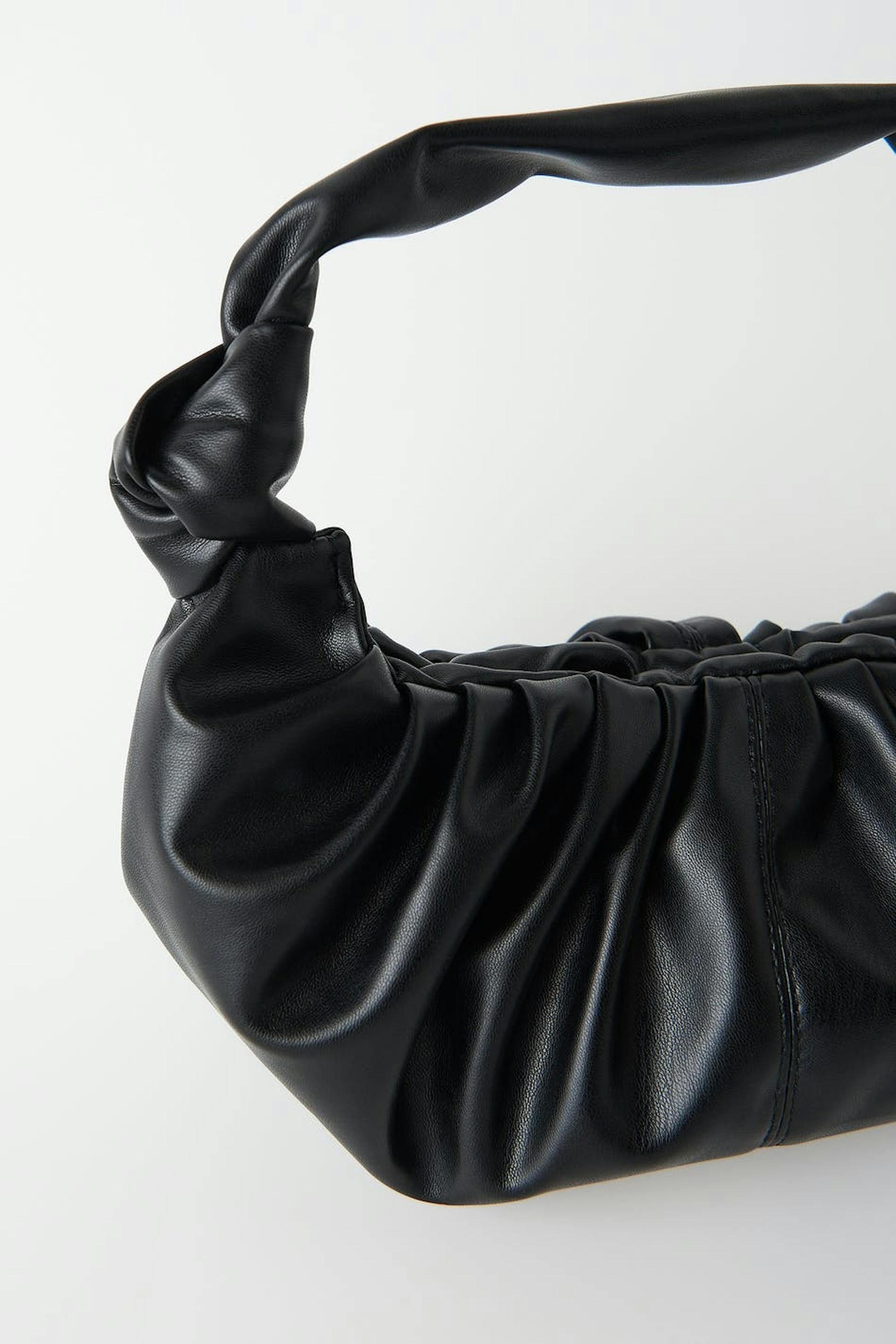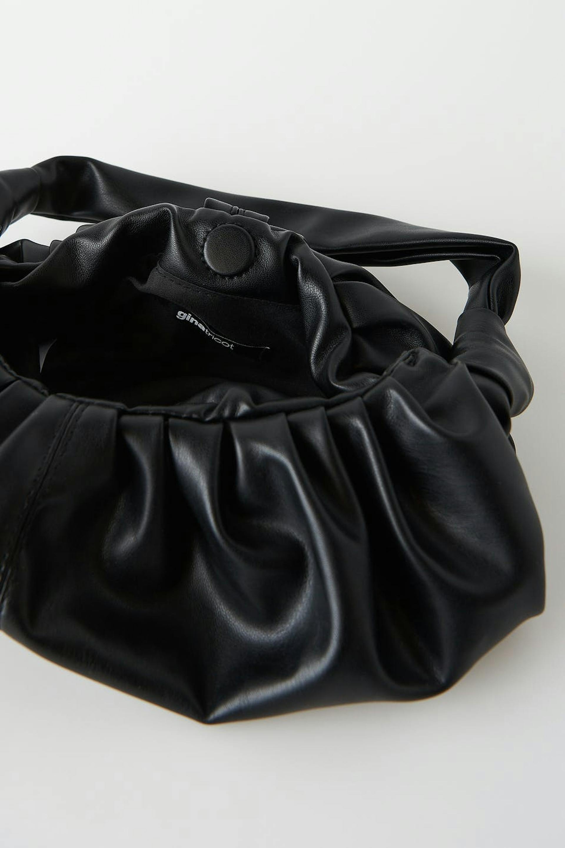 Pieni laukku tekonahasta poimutetulla efektillä. Laukku on musta ja siinä on lyhyt olkain. Siinä on solmuyksityiskohdat sivuissa ja napituslista metallinapilla.