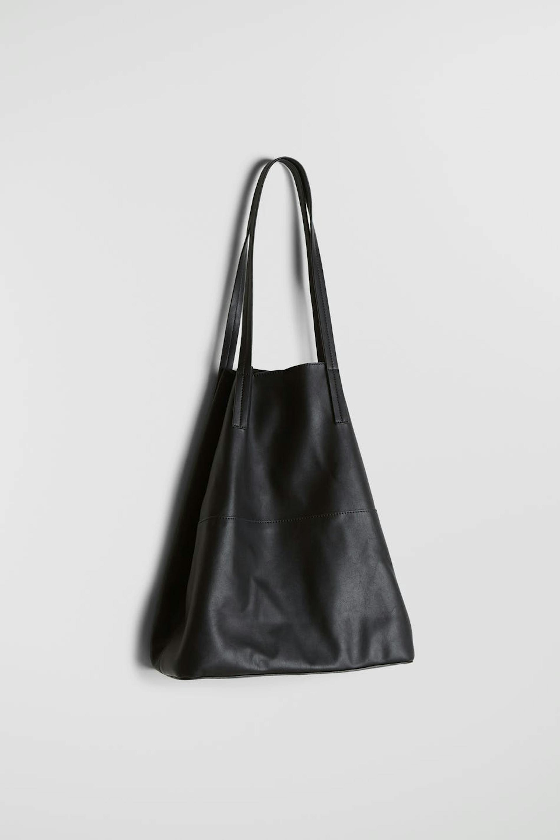 Laukku ostoskassi-mallilla. Laukku on musta. Se valmistetaan tekonahasta.