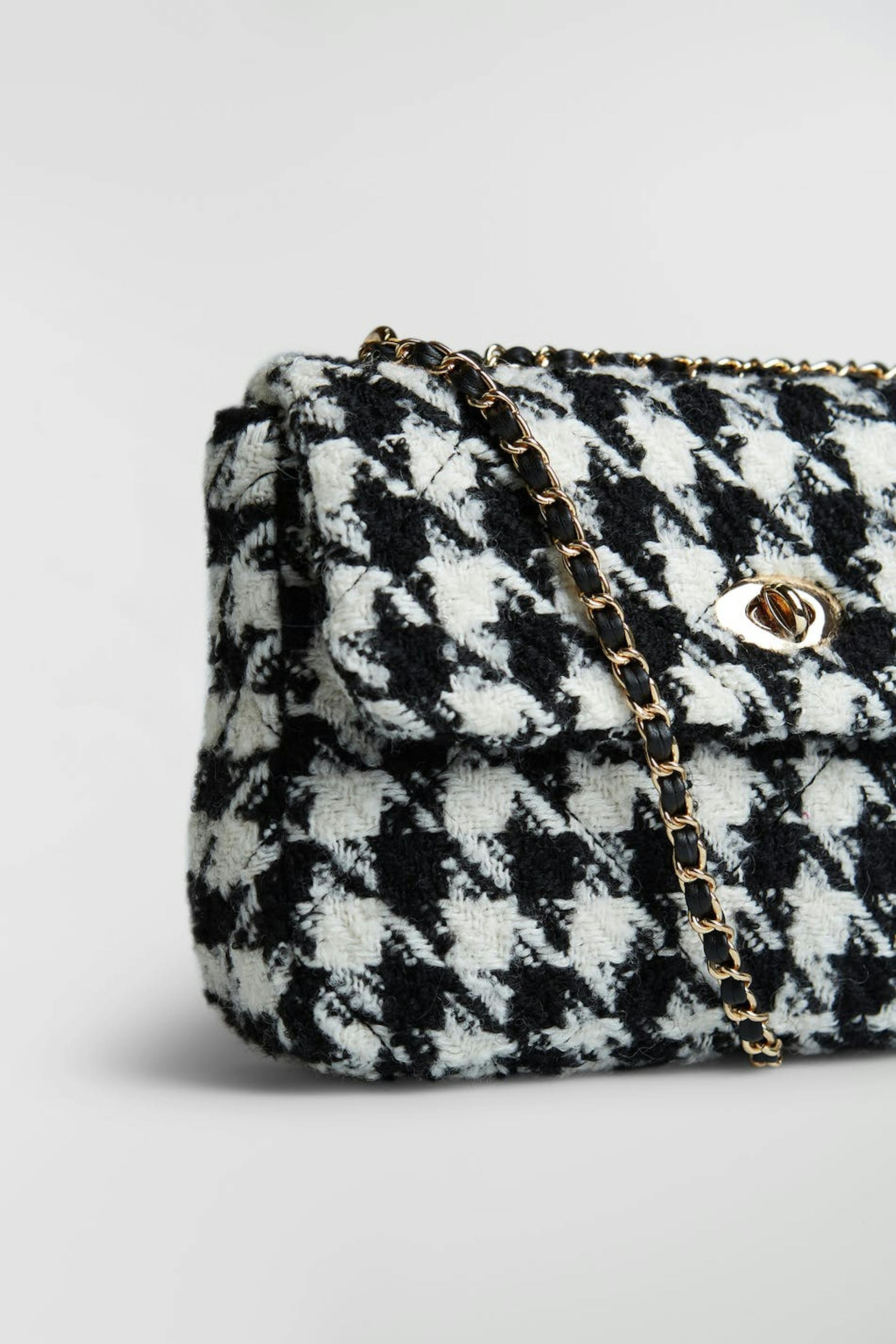 Koiranhammaskuvioinen laukku kannella kääntölukolla. Laukku on musta ja siinä on olkain ketjuyksityiskohdalla.