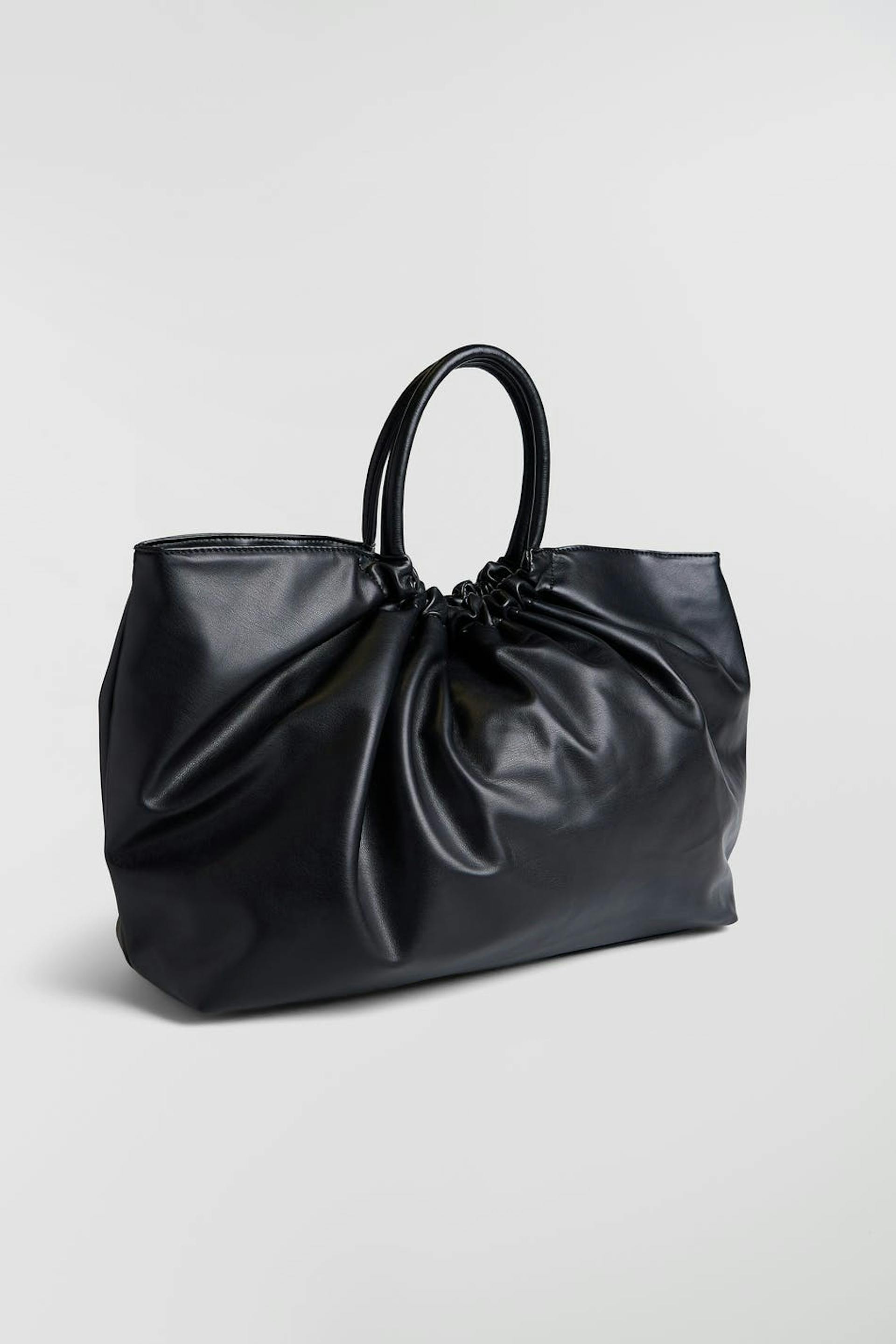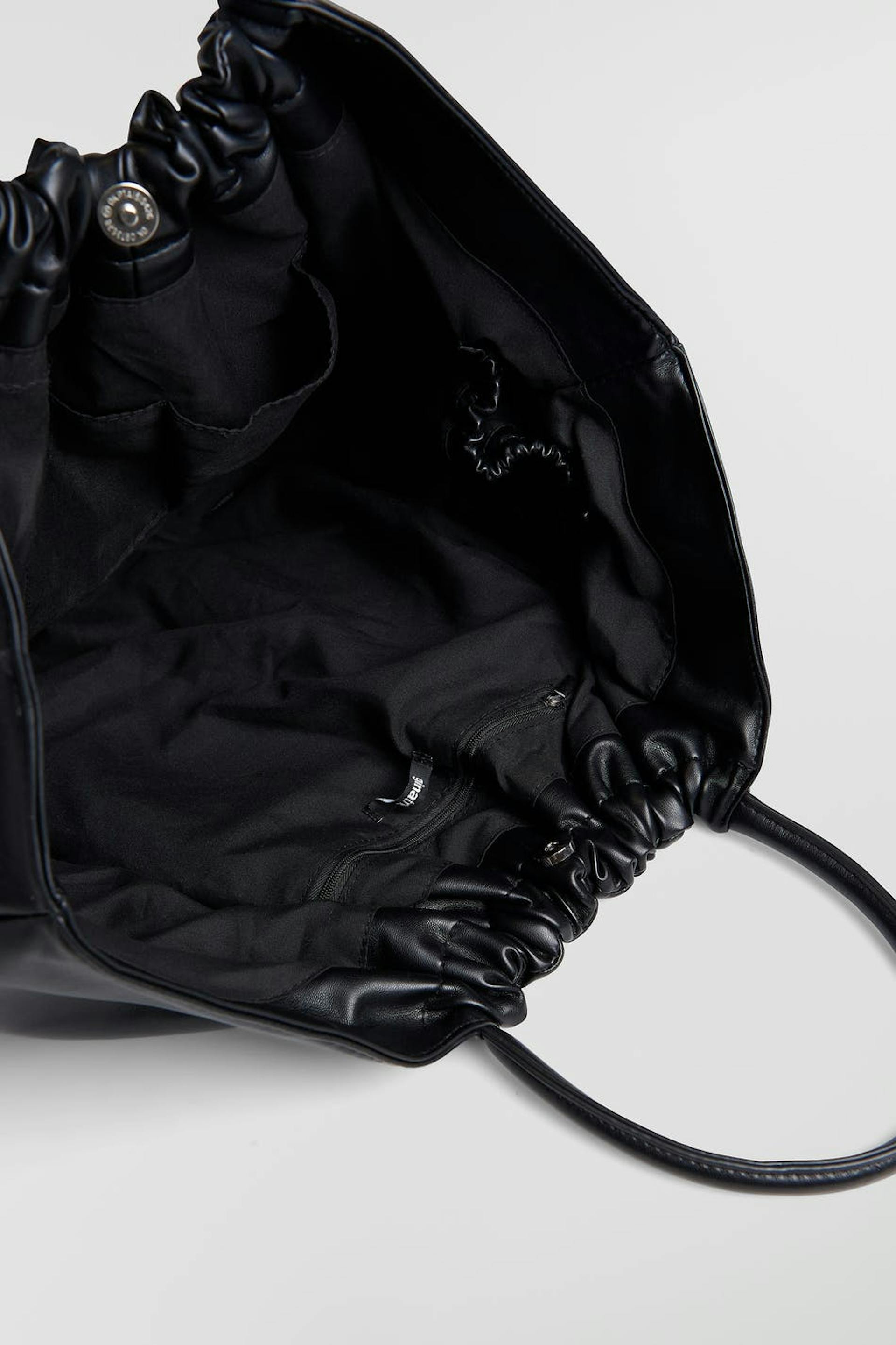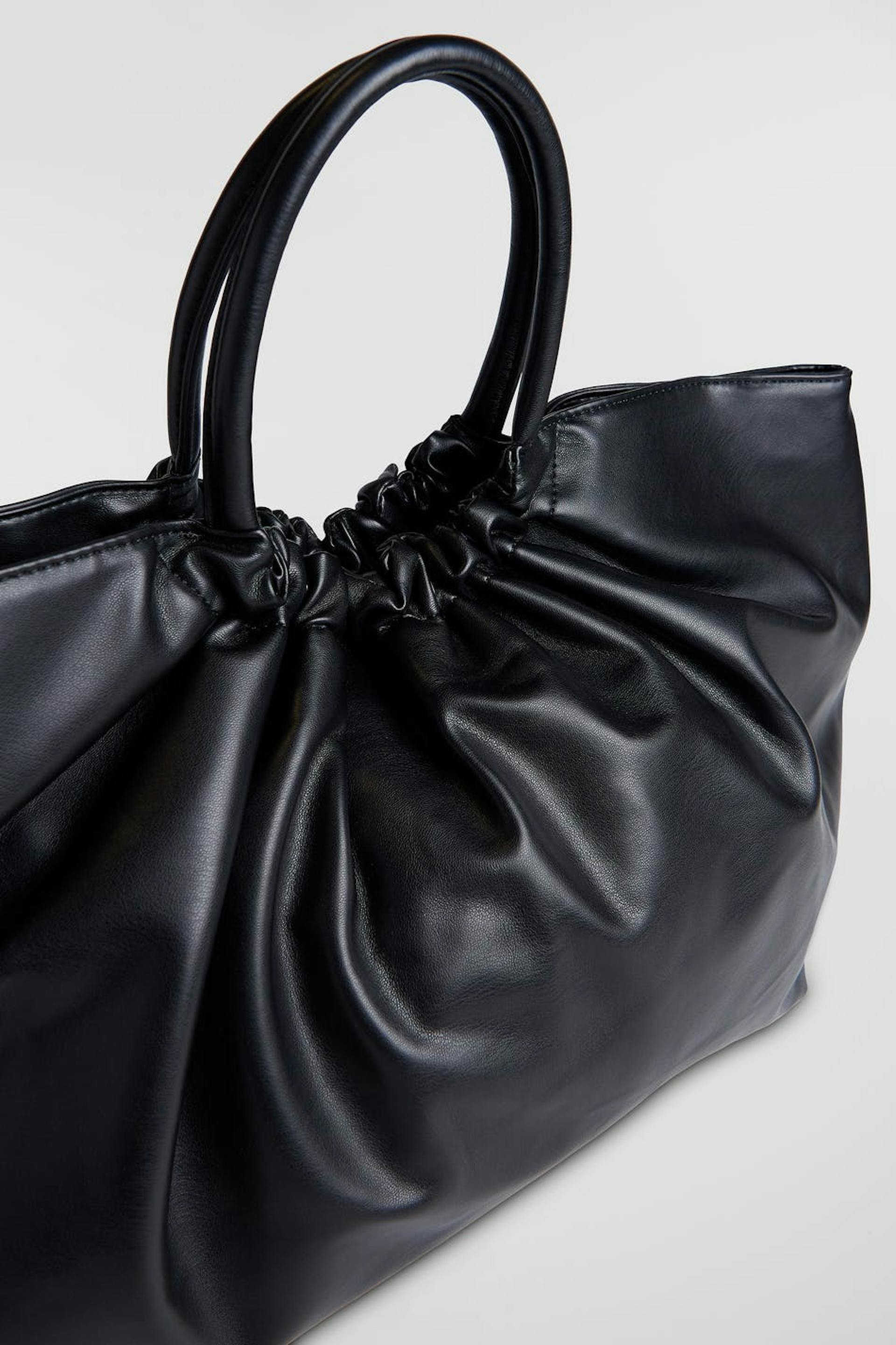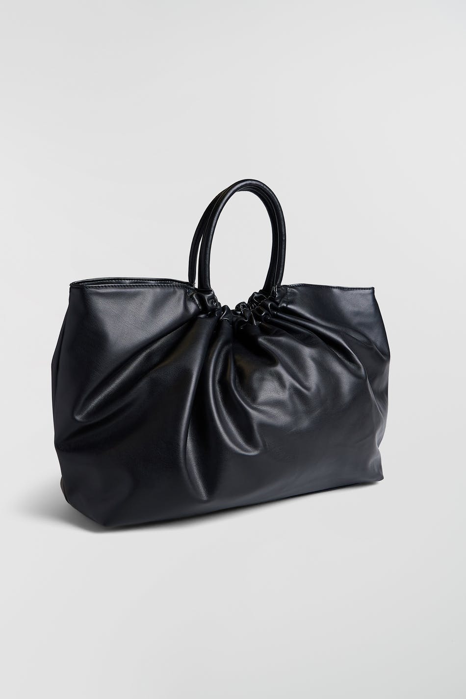 Keinonahkainen laukku kahdella pyöristetyllä sangalla. Laukku on musta ja siinä on lukko magneettisella napilla. Siinä on sisälokerot paljon.