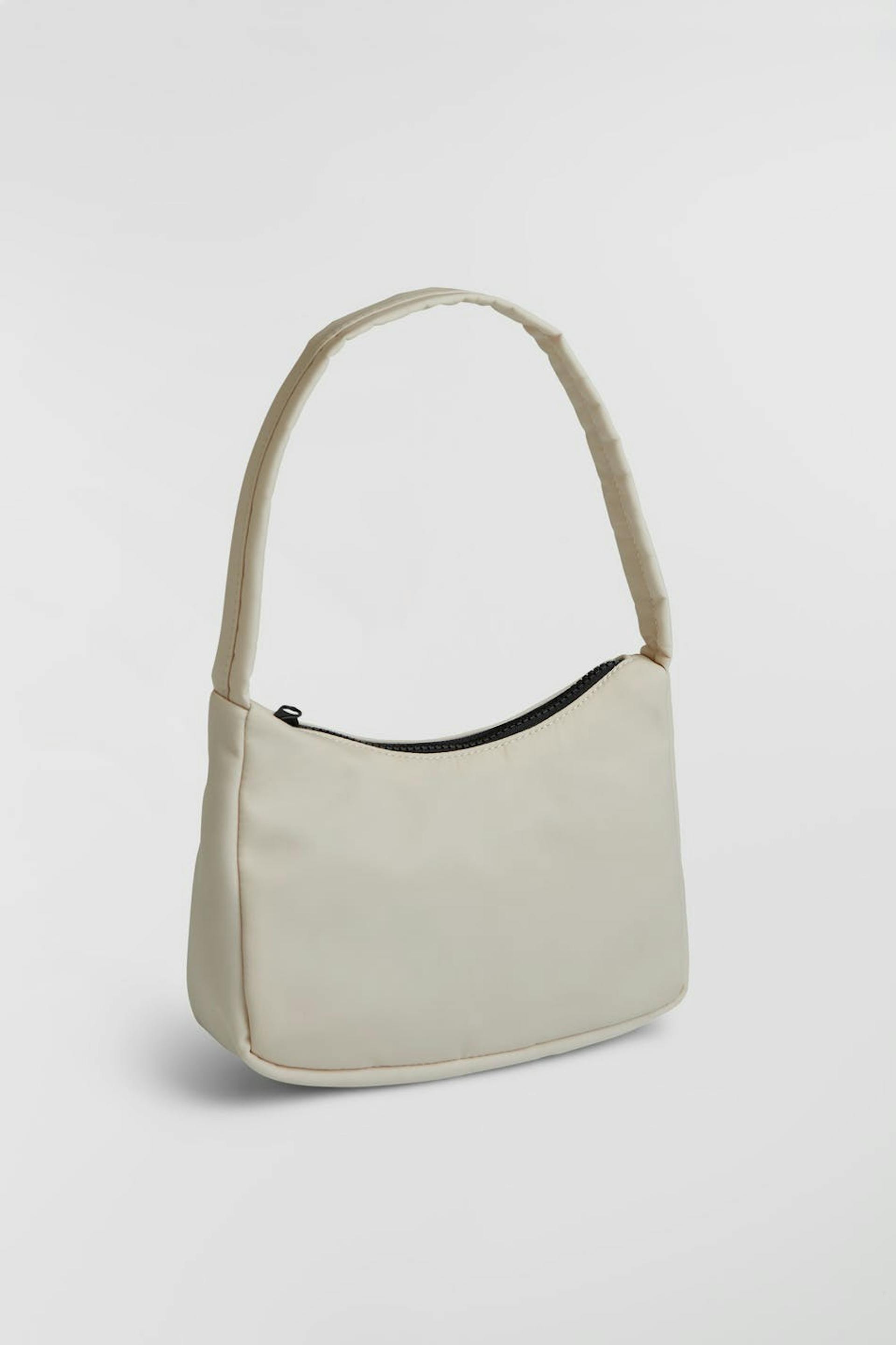 Baguettelaukku lyhyellä olkaimella. Laukku on beige. Se valmistetaan nylonista.