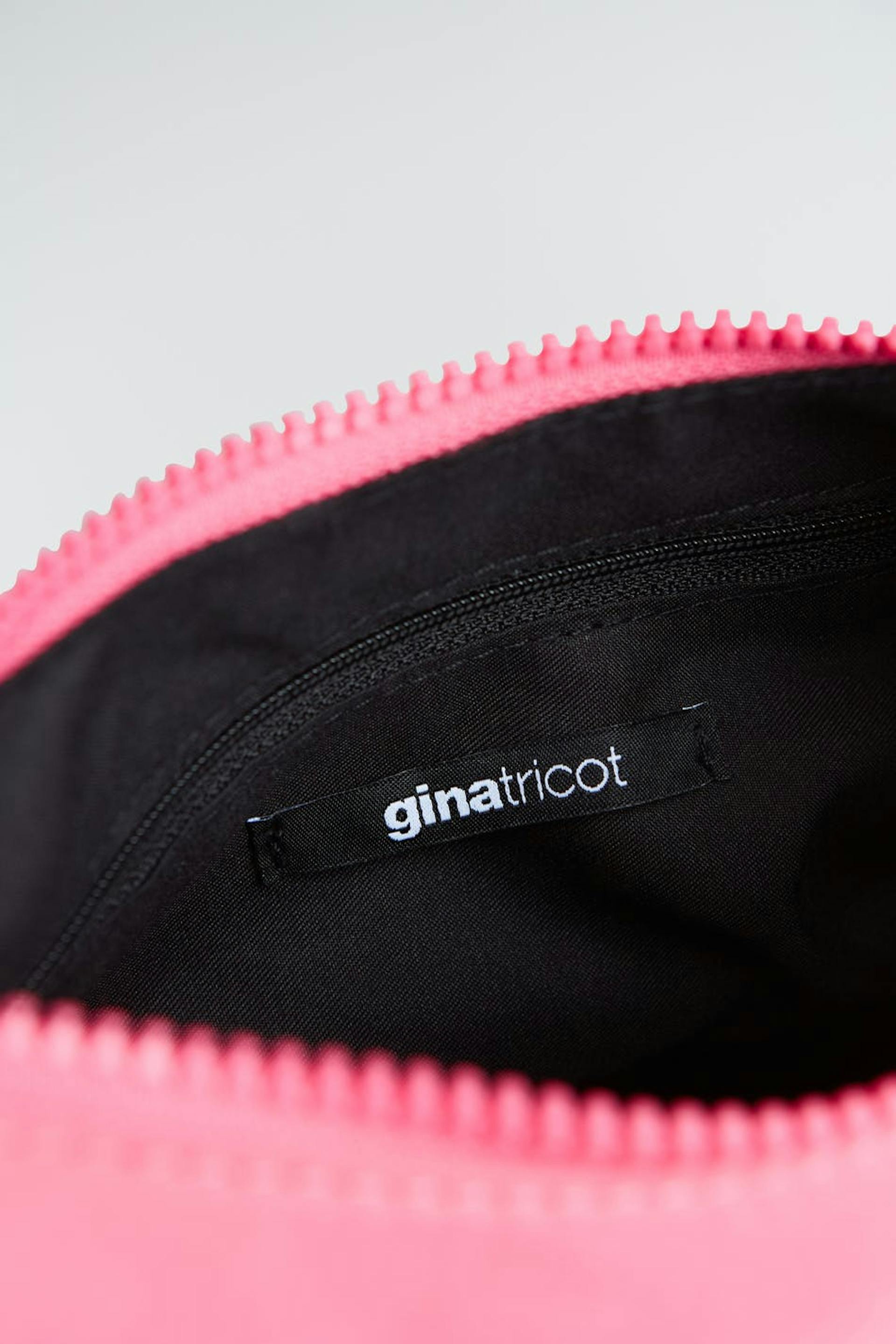 Baguettelaukku lyhyellä olkaimella. Laukku on pinkki. Se valmistetaan nylonista.