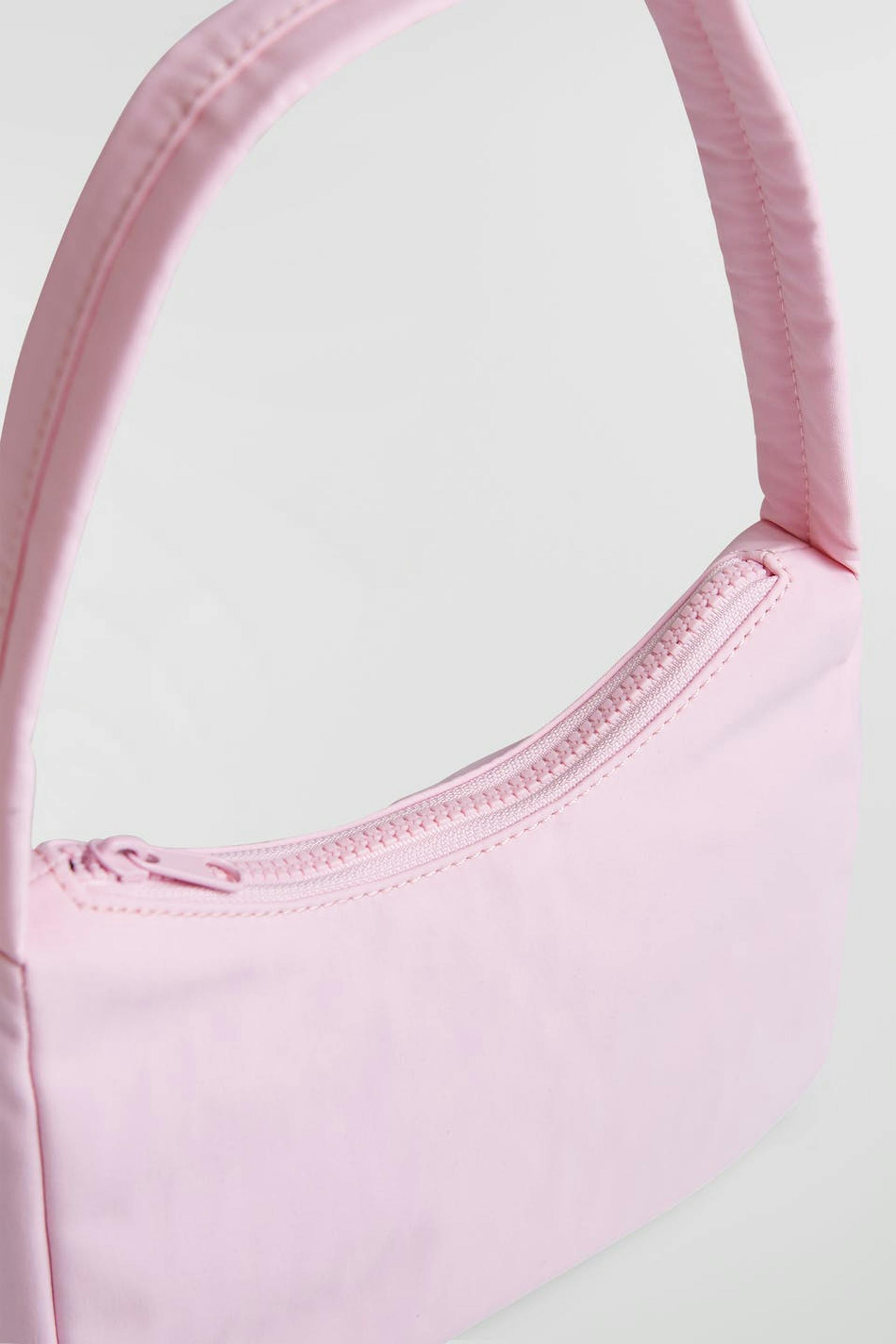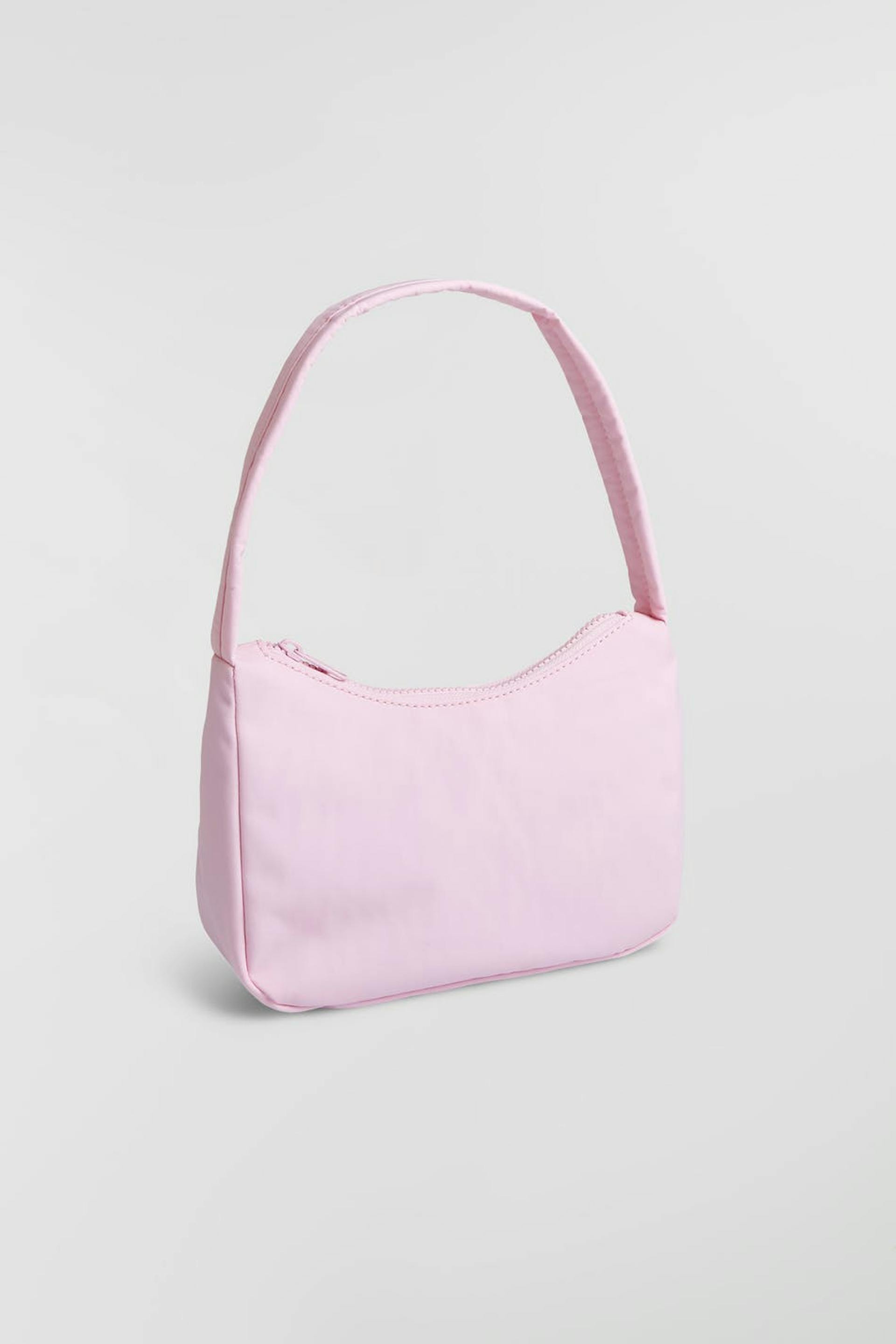 Baguettelaukku lyhyellä olkaimella. Laukku on pinkki. Se valmistetaan nylonista.