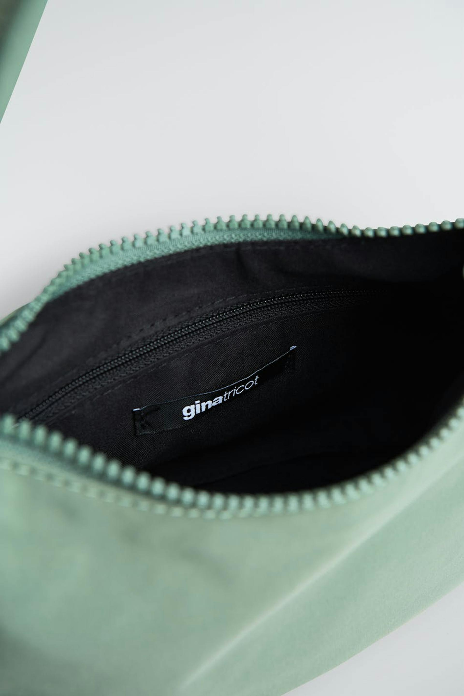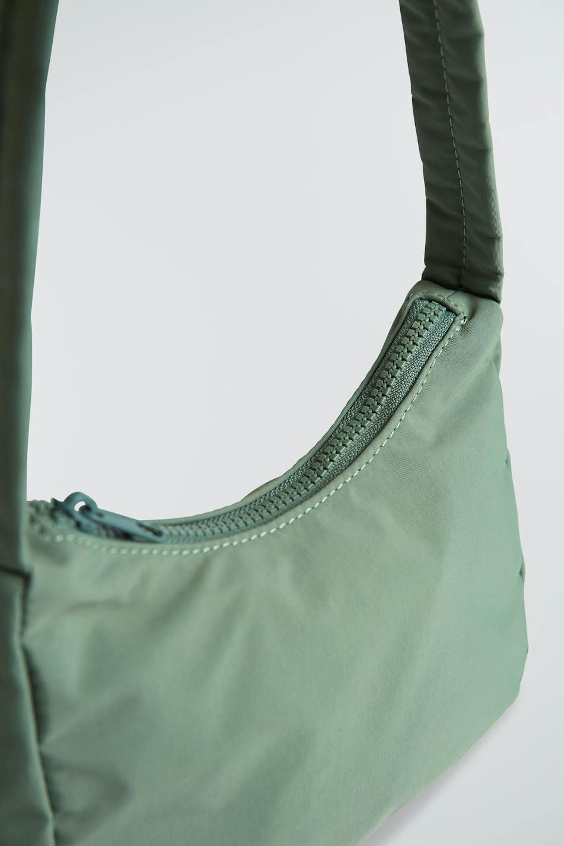 Baguettelaukku lyhyellä olkaimella. Laukku on vihreä. Se valmistetaan nylonista.