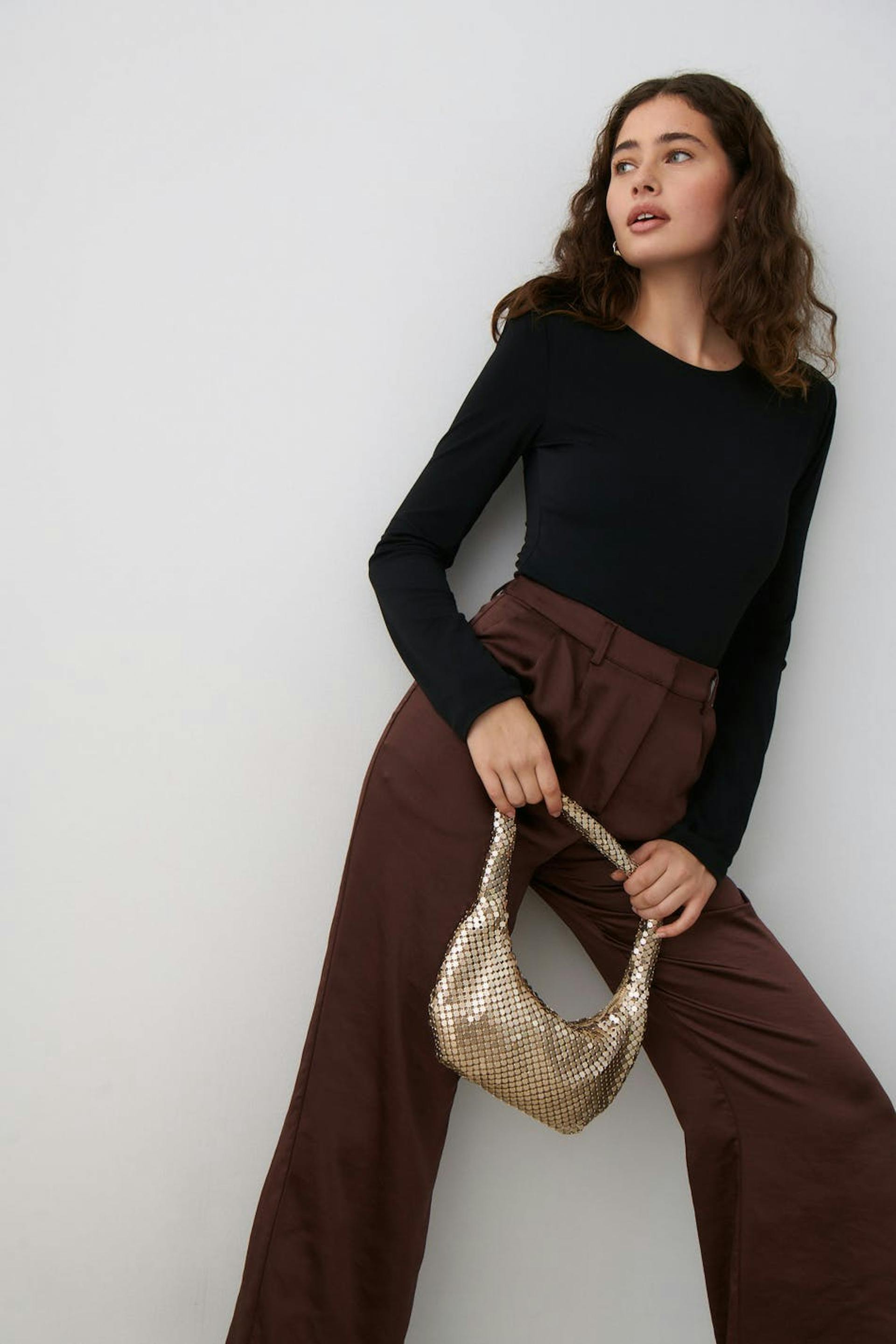Laukku metallista vetoketjulla ylhäällä. Laukku on kultainen.