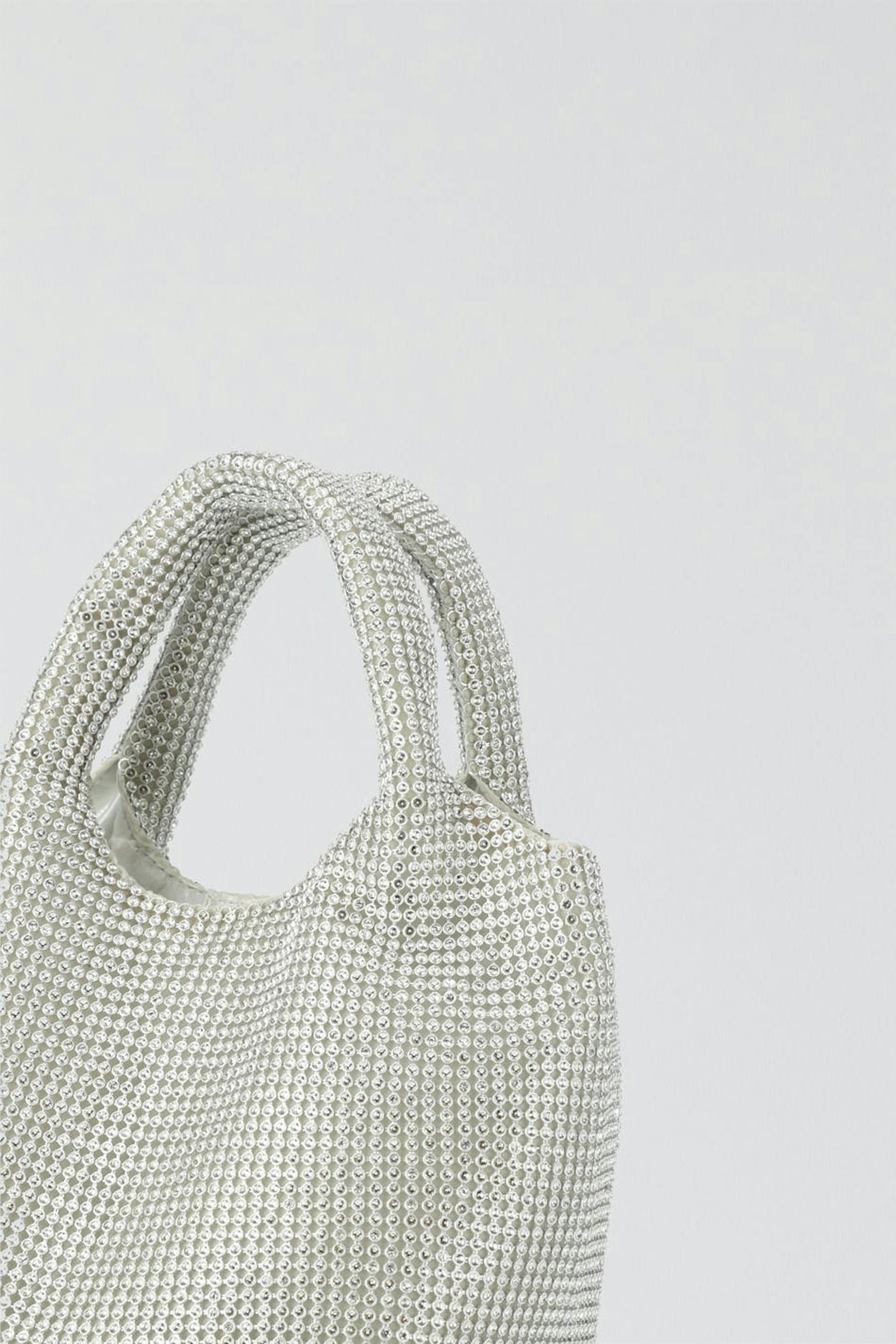 Strassikoristeinen käsilaukku kaksinkertaisilla sangoilla ylhäällä. Laukku on täydellinen juhliin ja hopea.