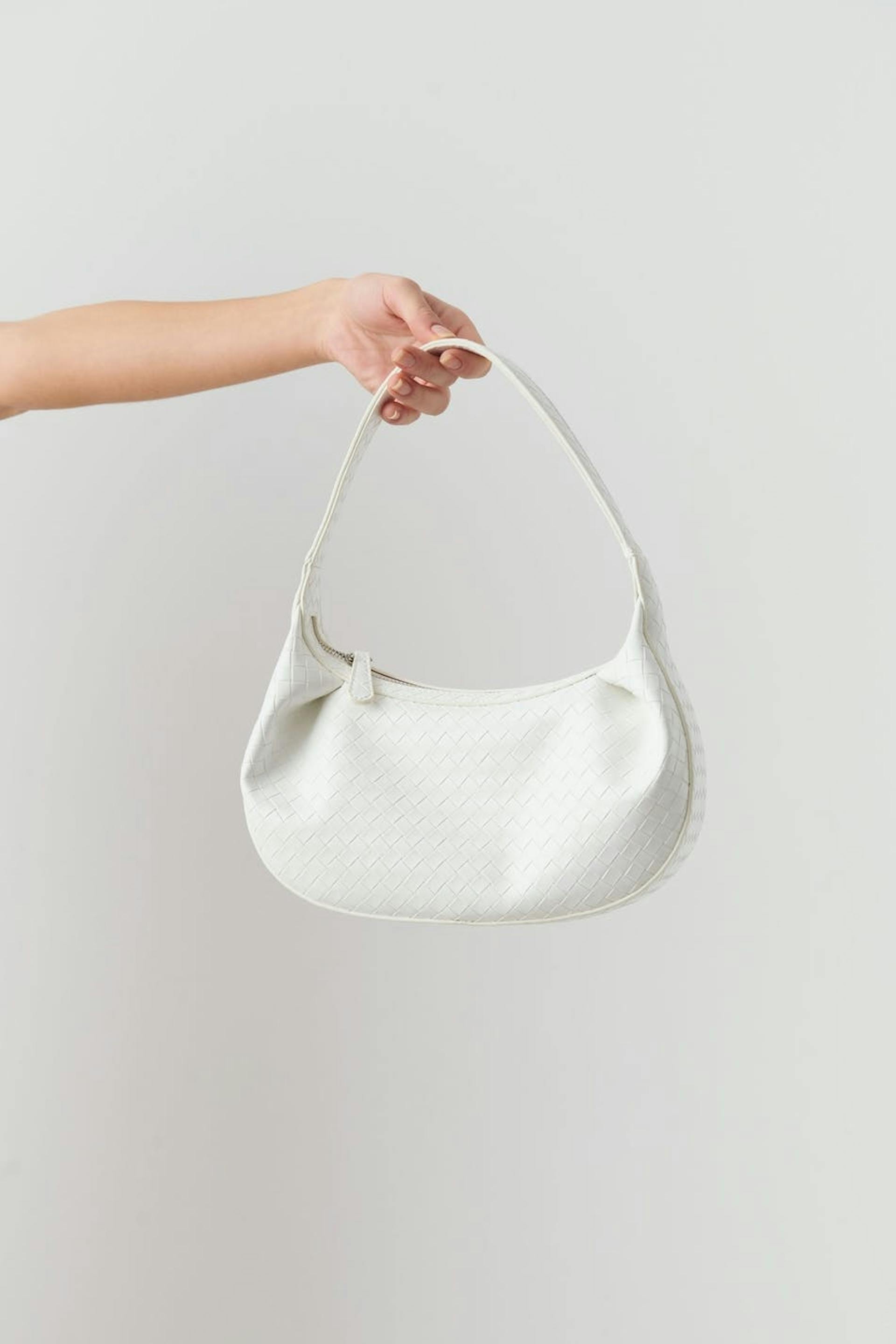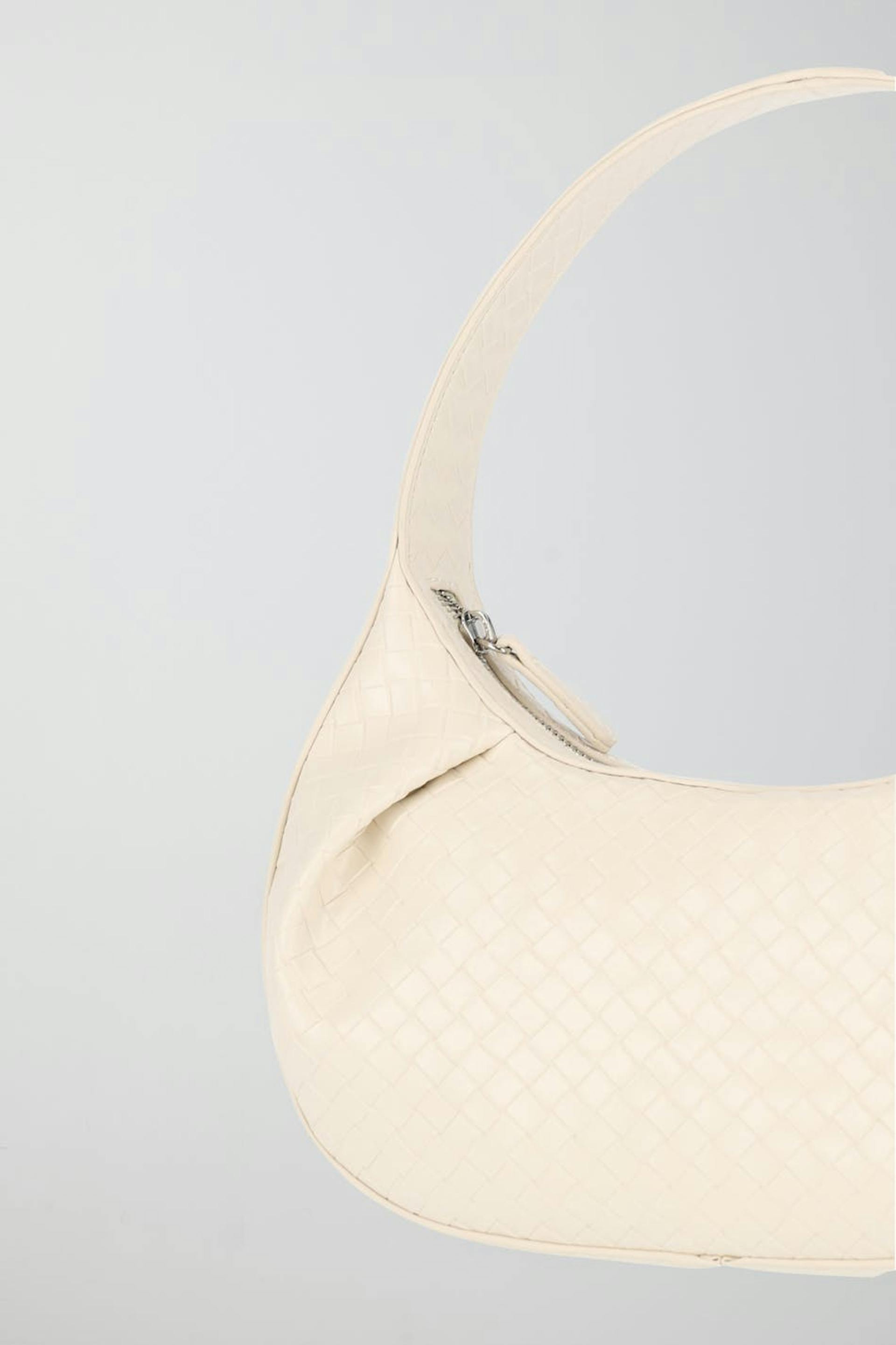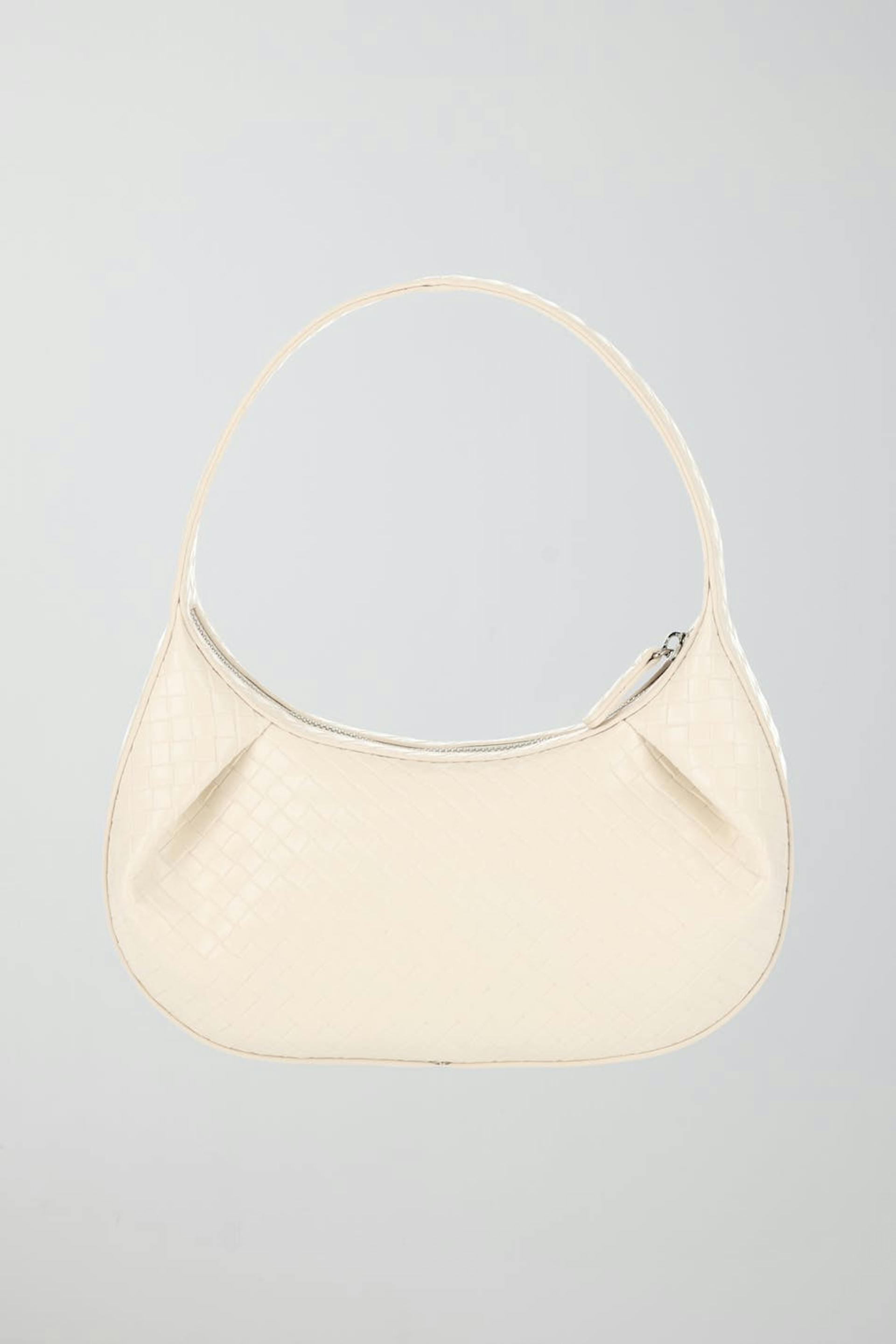 Kuvioitu käsilaukku lyhyellä olkaimella. Laukku on valkoinen ja siinä on vetoketju.