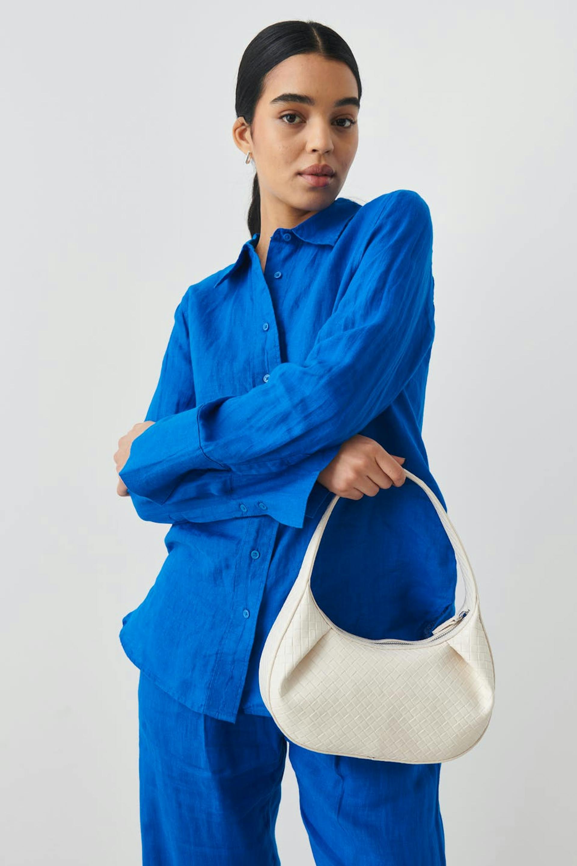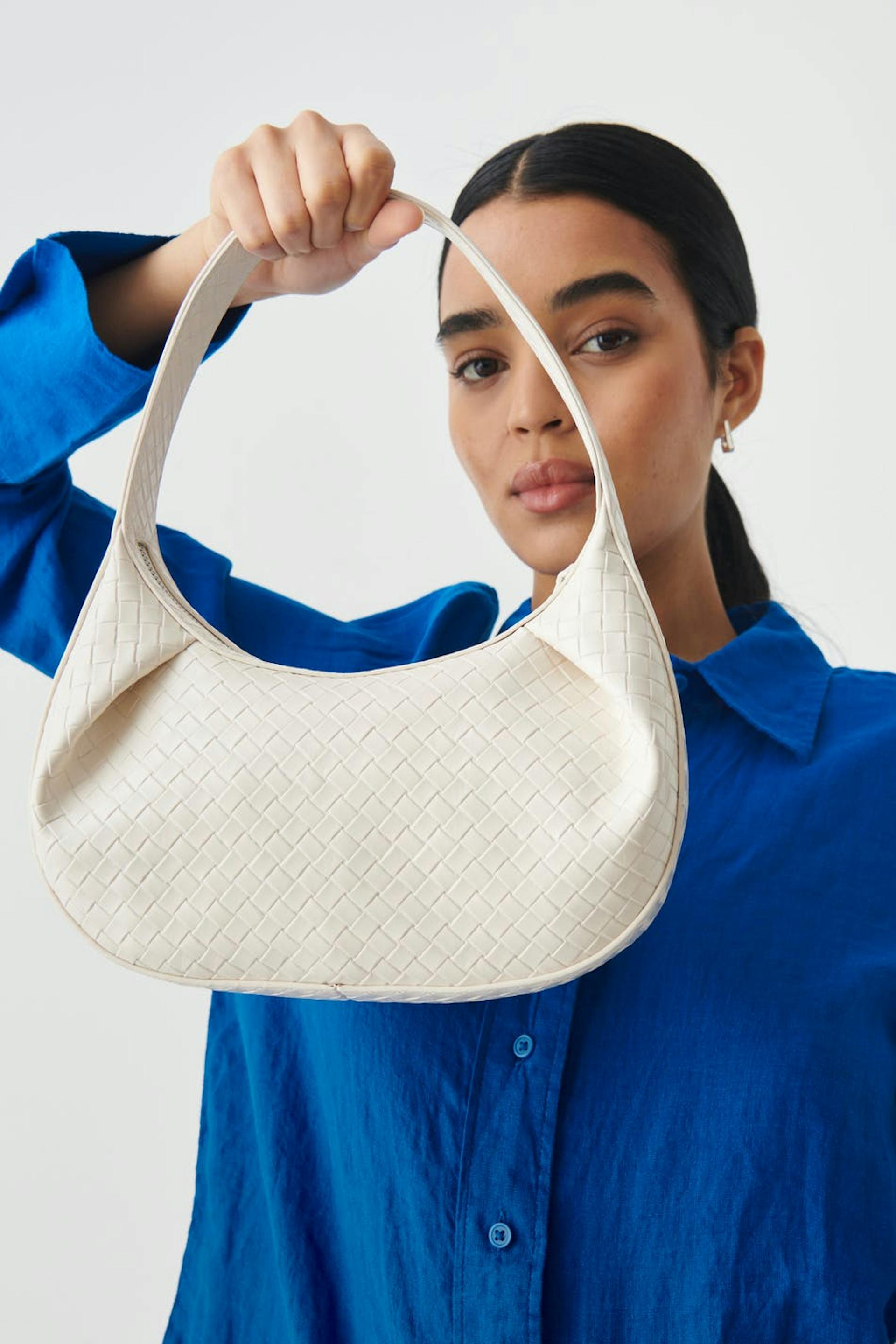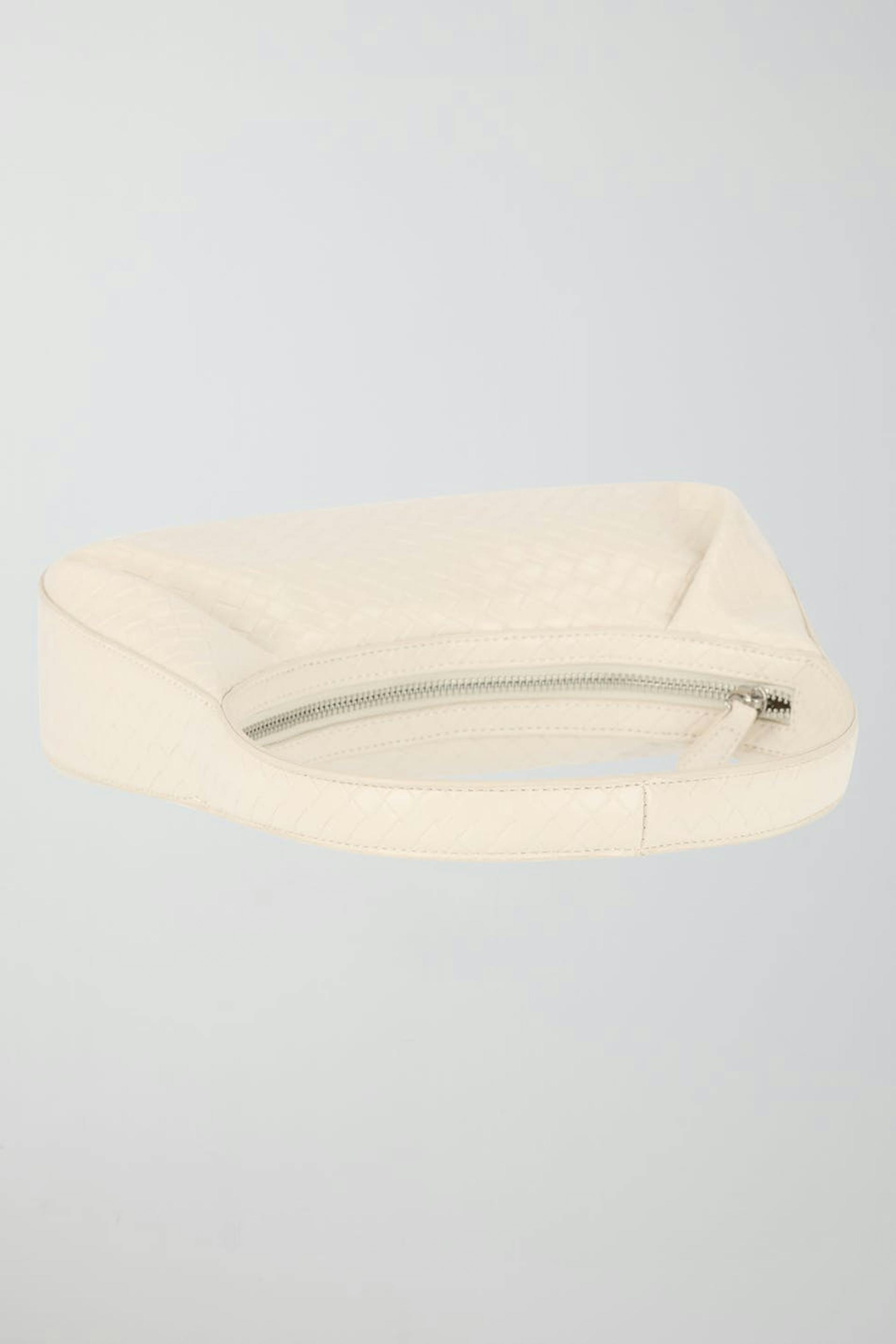 Kuvioitu käsilaukku lyhyellä olkaimella. Laukku on valkoinen ja siinä on vetoketju.