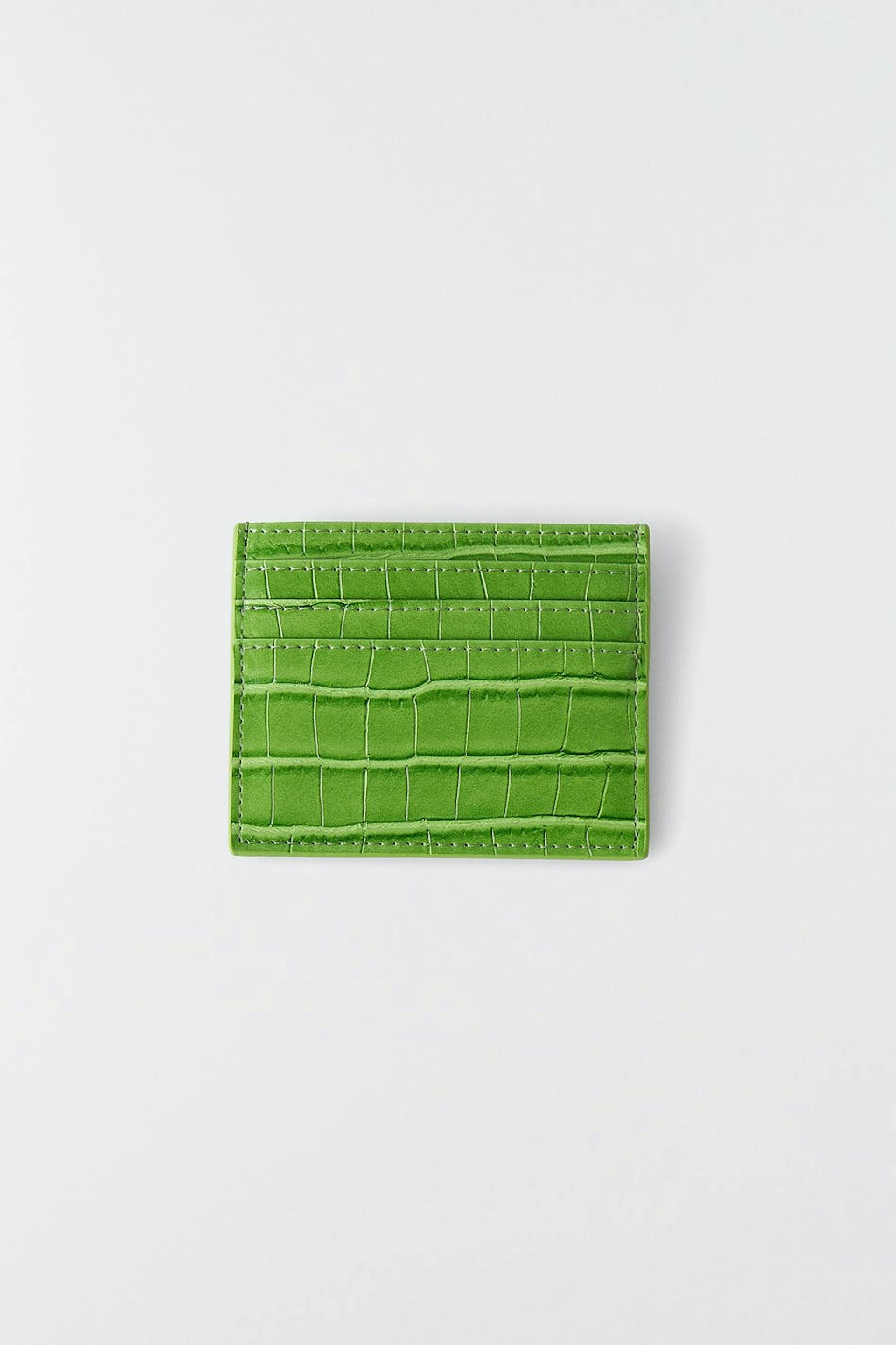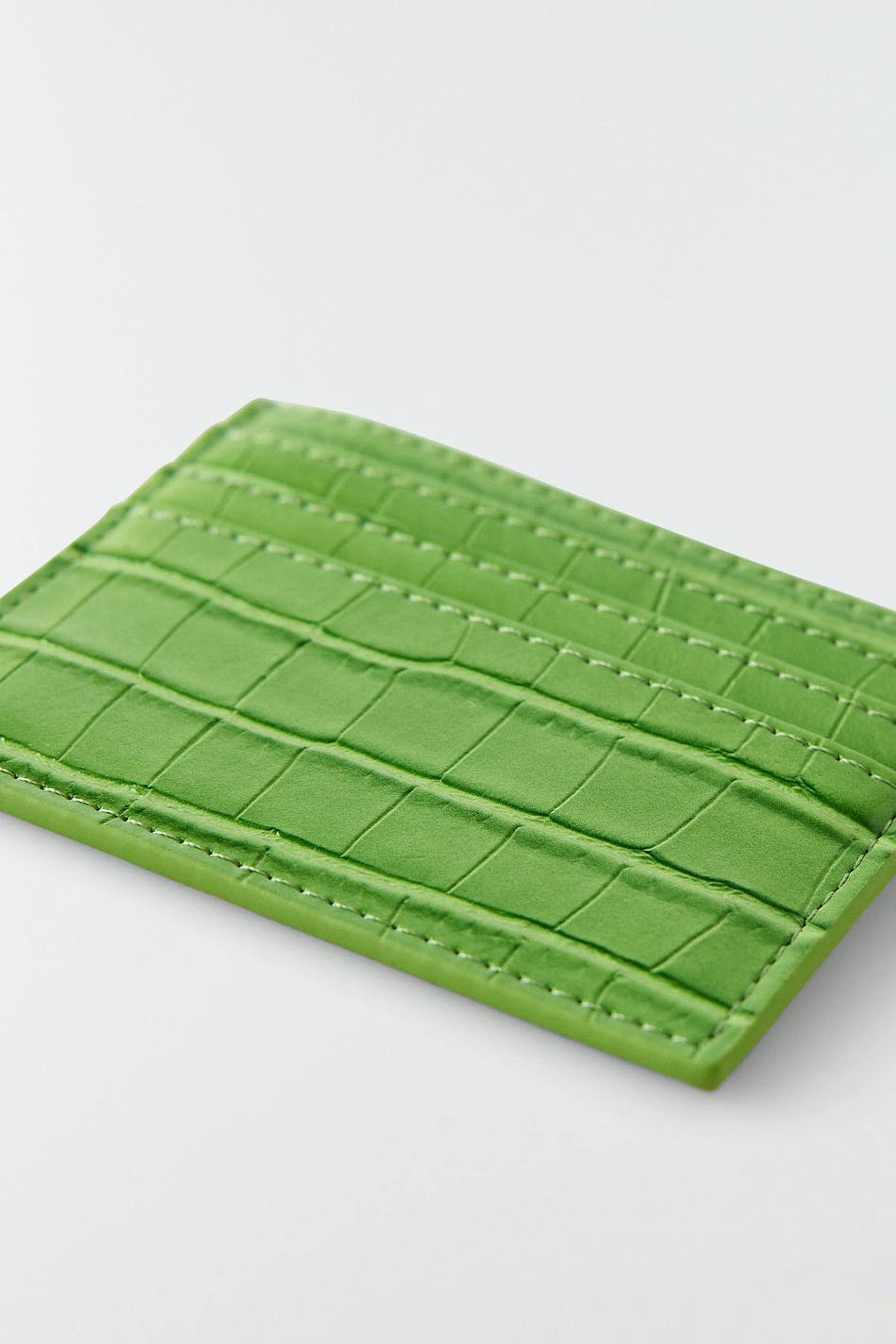 Krokotiilikuvioinen kortinpitäjä osioilla paljon. Kortinpitäjä on vihreä.