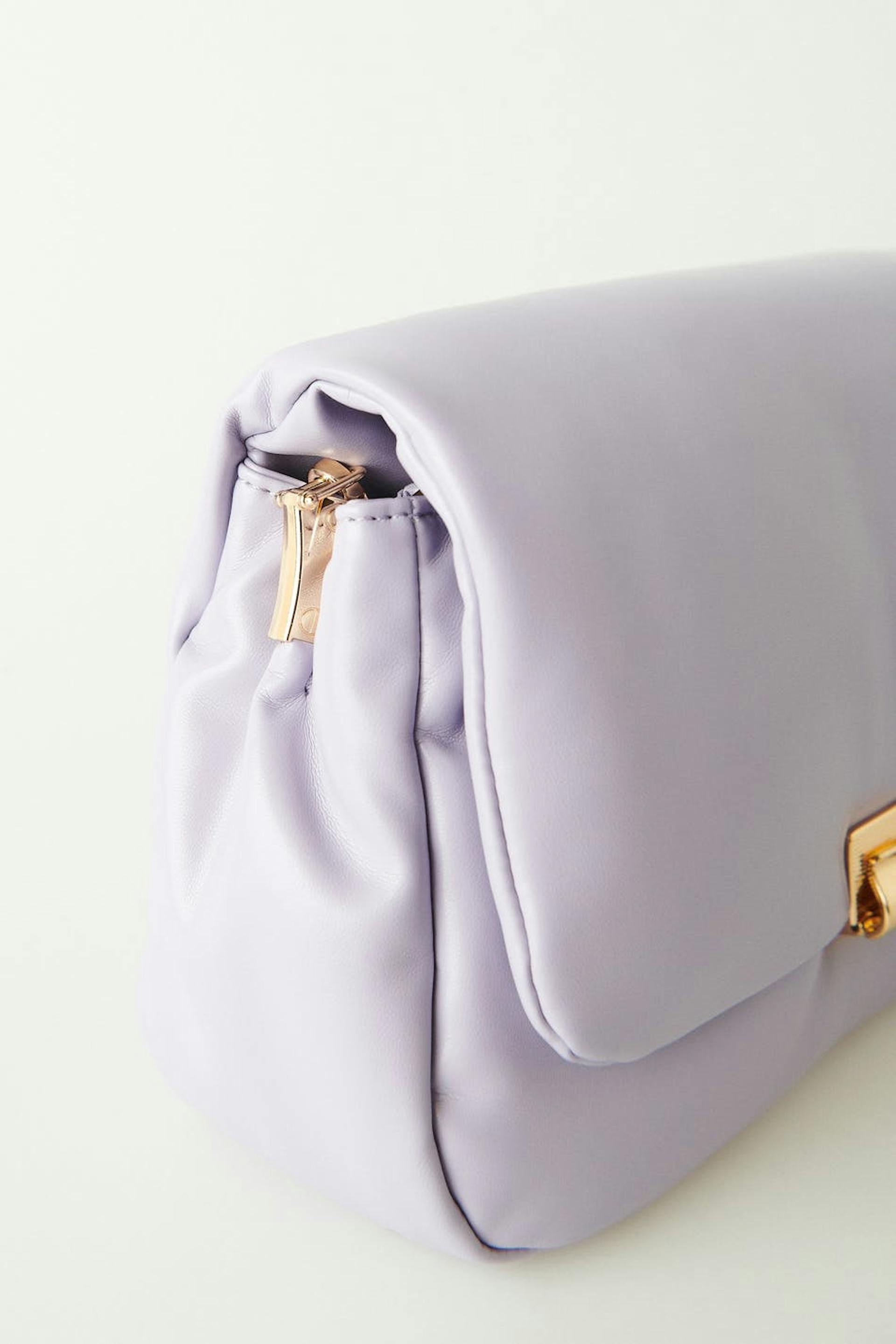 Topattu laukku kultayksityiskohdilla. Laukku on liila ja siinä on pitkä, irrotettava olkain. Siinä on lukko vetoketjulla ja metallikiinnikkeellä.