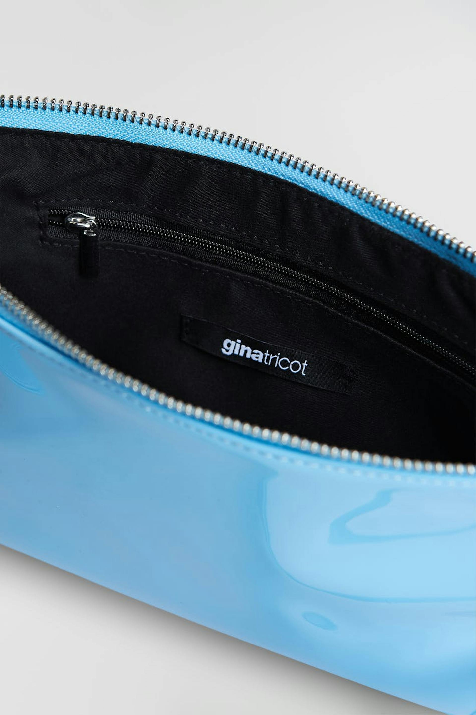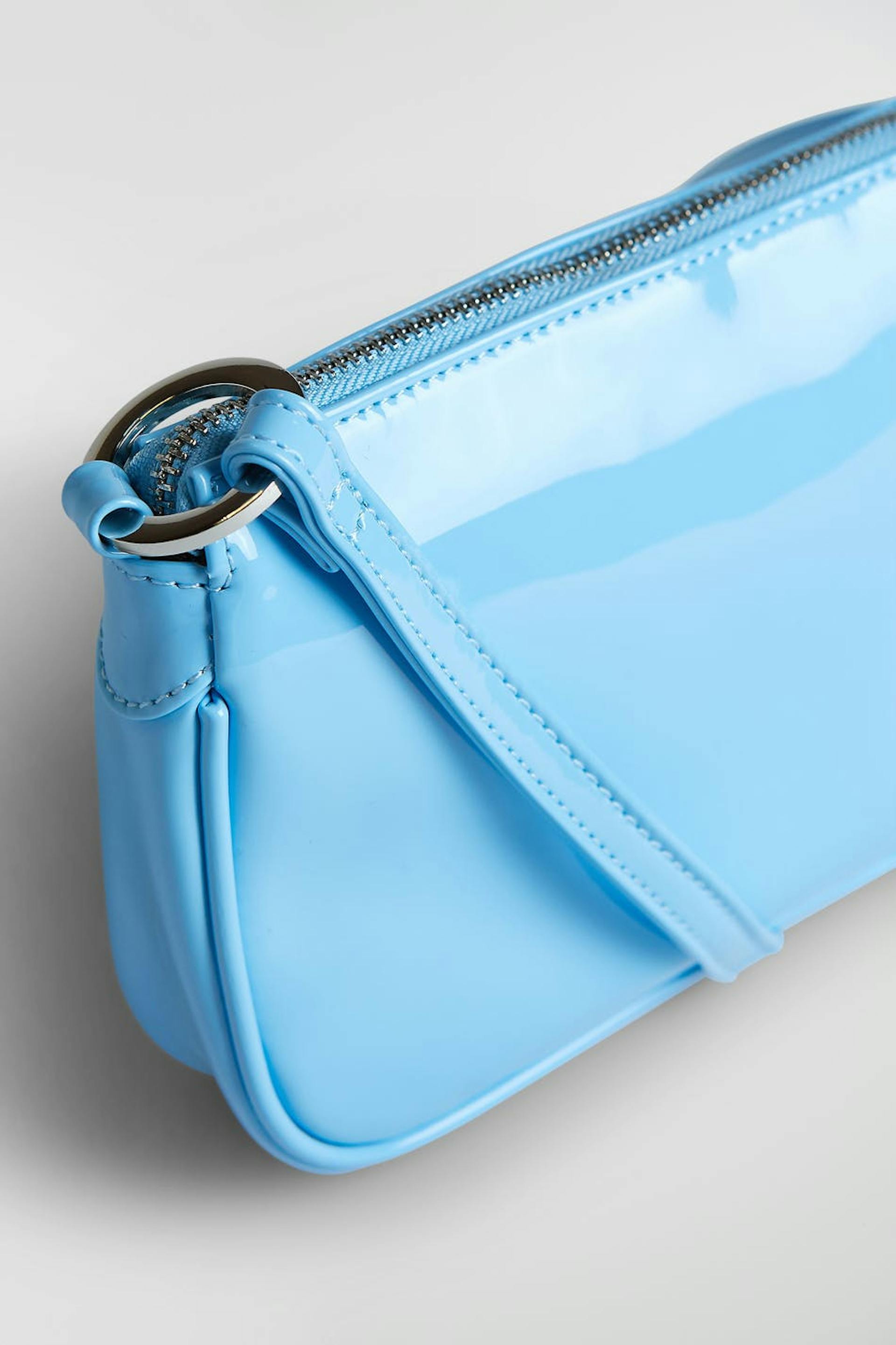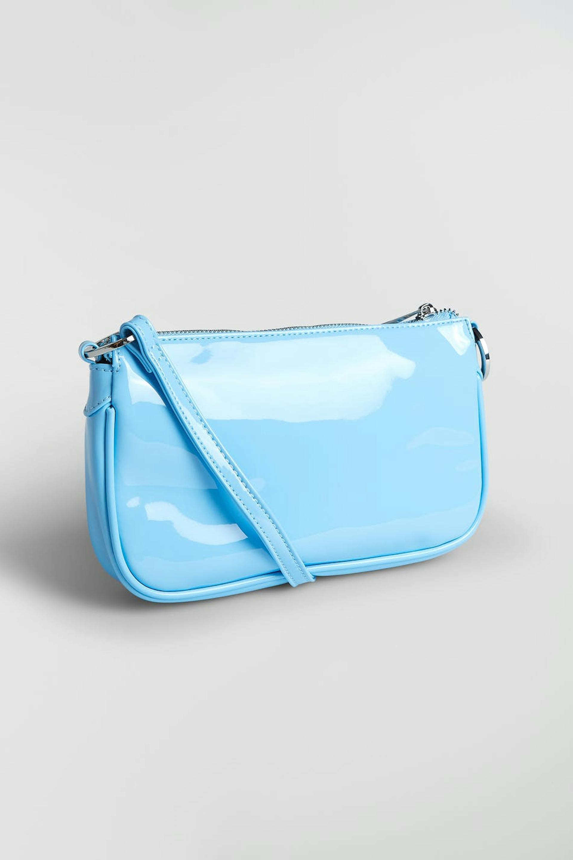 Baguettelaukku lyhyellä olkaimella. Laukku on sininen ja siinä on vetoketju ylhäällä. Se valmistetaan tekonahasta ja siinä on pieni sisätasku.