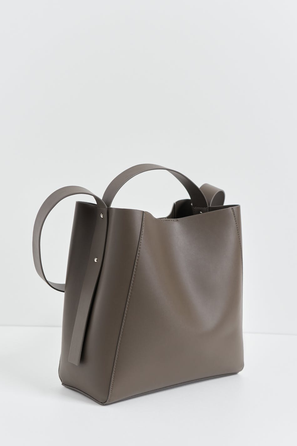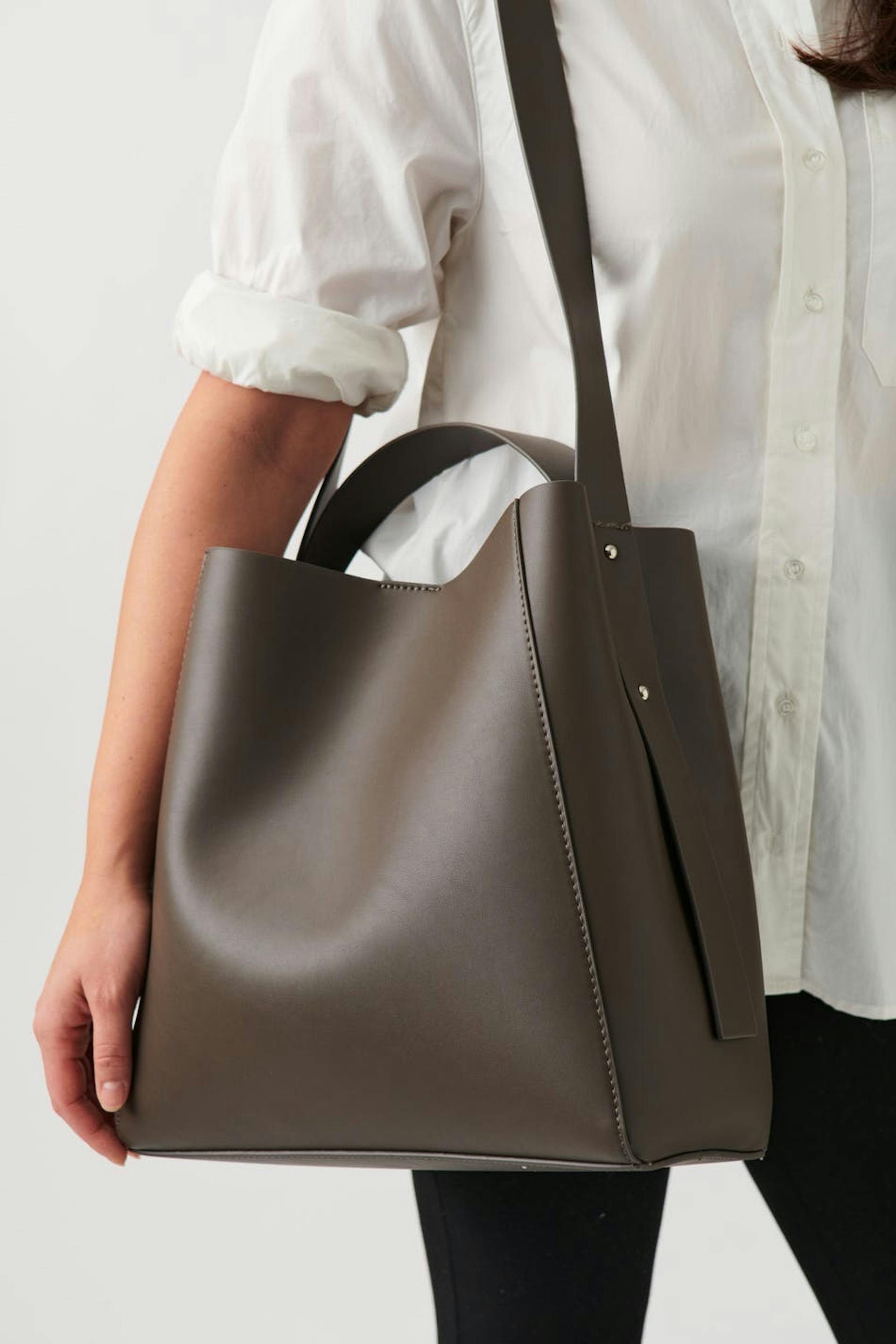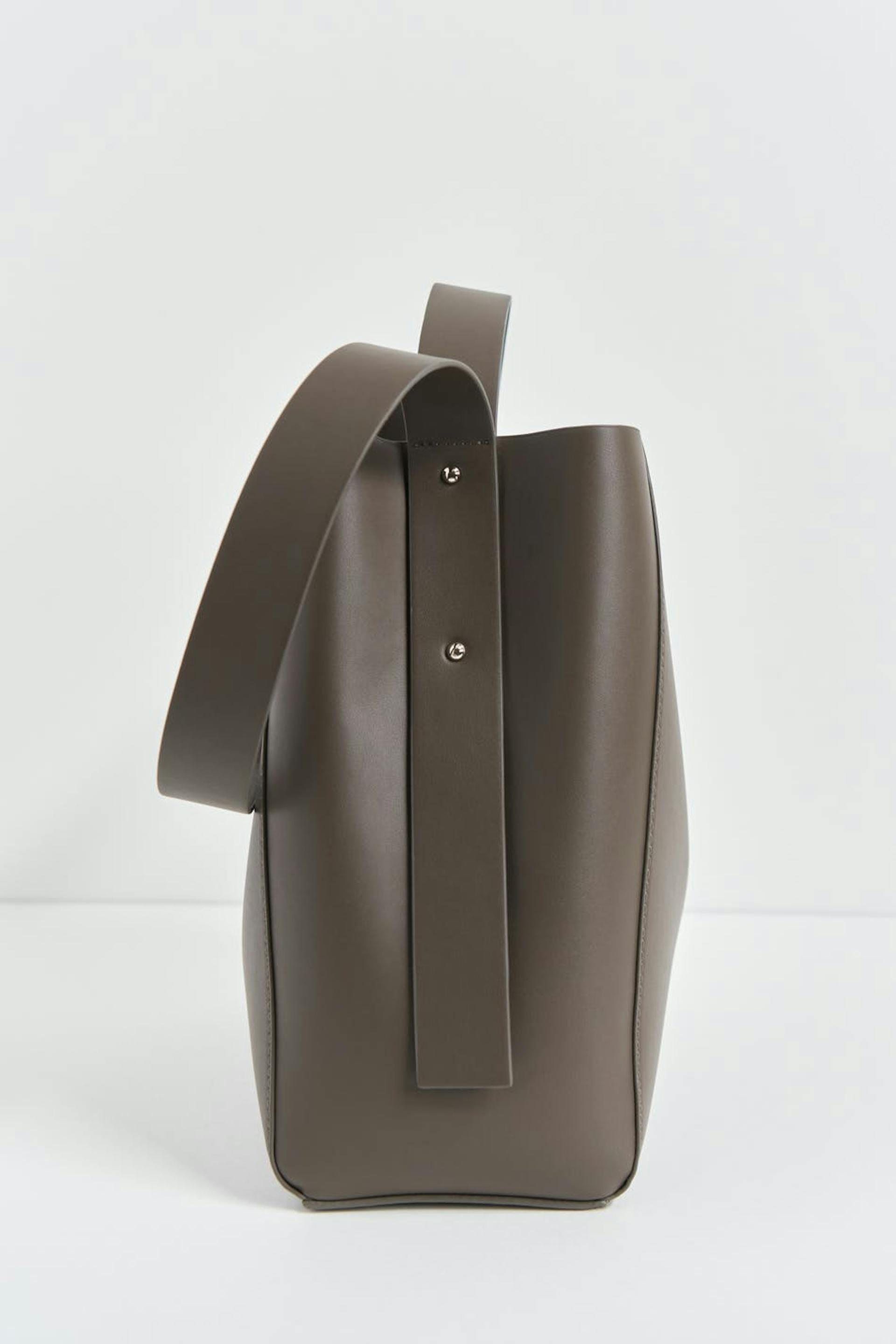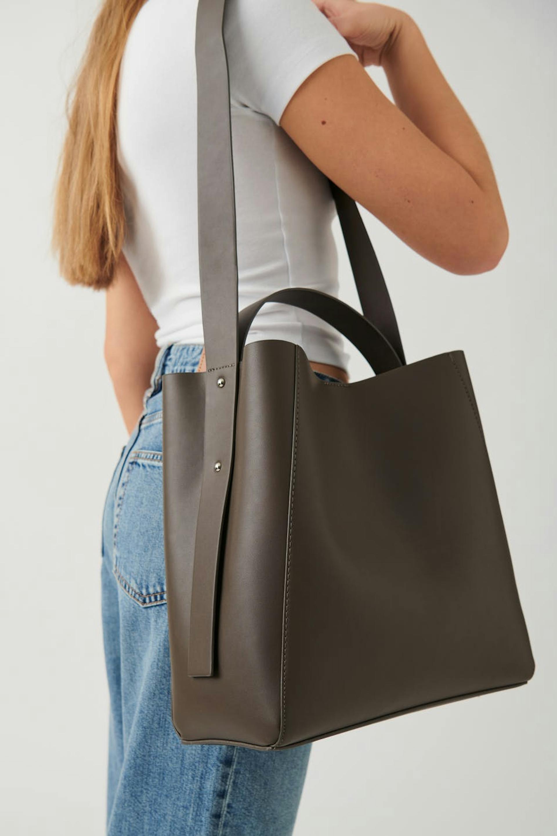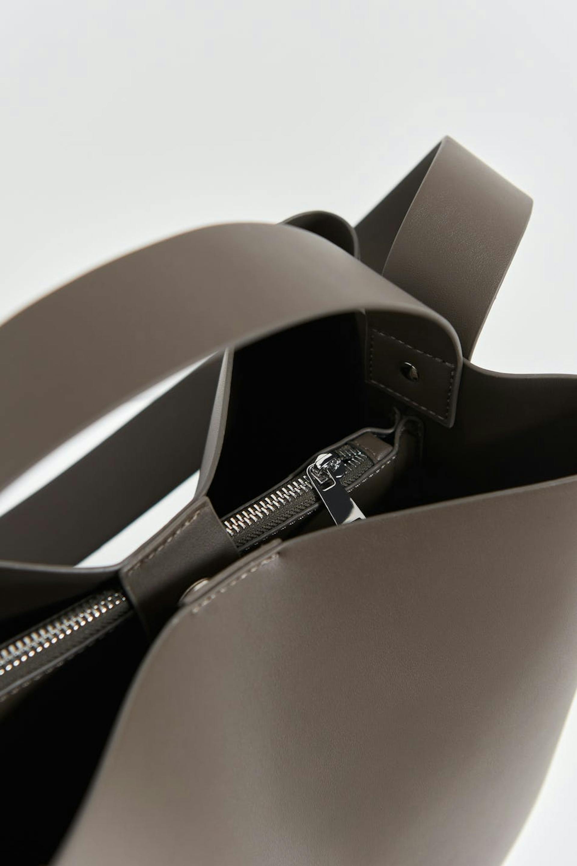 Suuri laukku keinonahasta sangalla ylhäällä. Laukku on ruskea ja siinä on pitkä olkain. Siinä on vetoketju ja magneettikiinnitys.