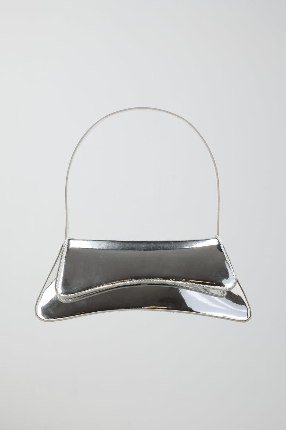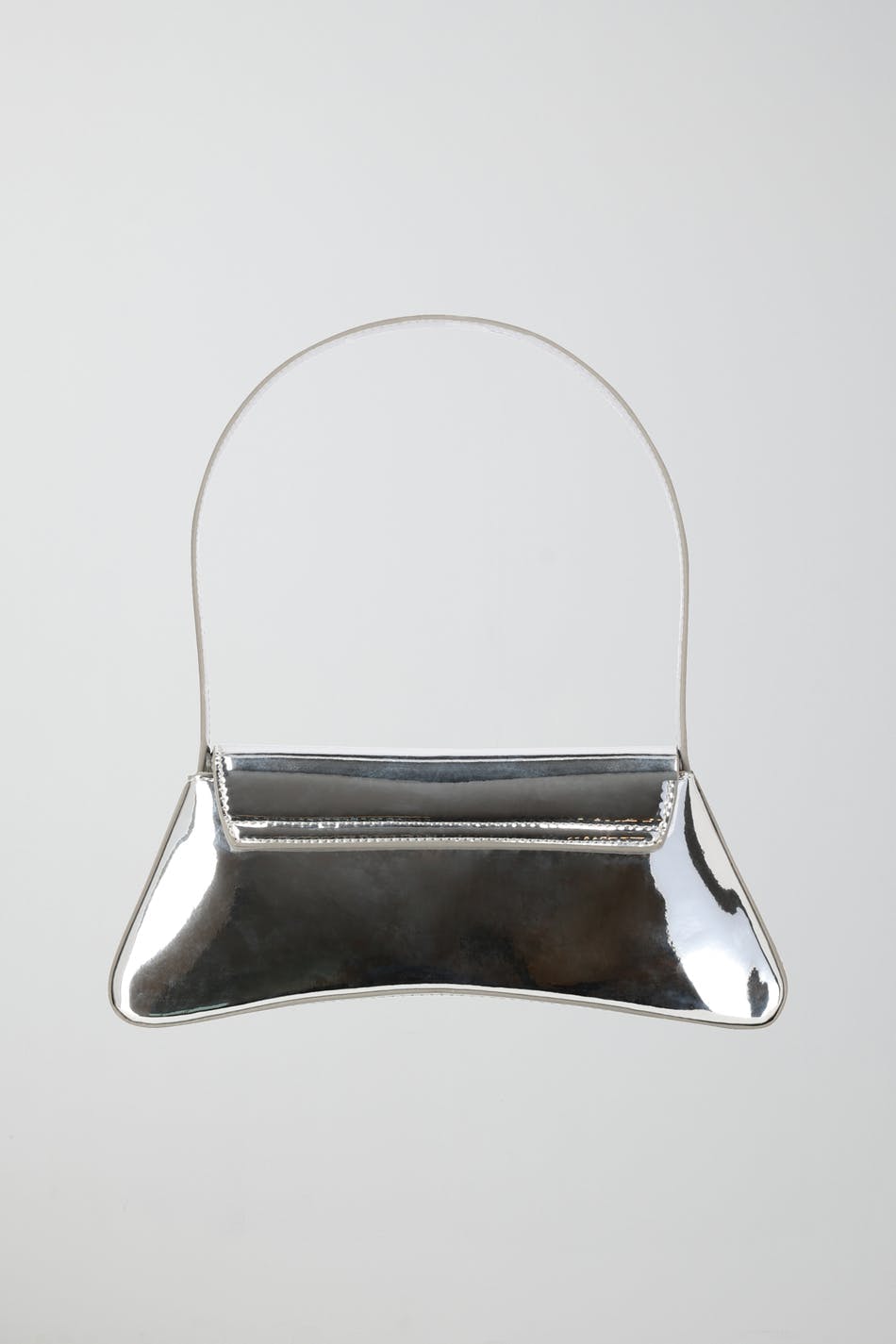 Metallinen laukku tekonahasta kannella. Laukku on hopea ja siinä on sporttinen muotoilu. Siinä on lyhyt olkain ja lukko magneettikiinnityksellä.